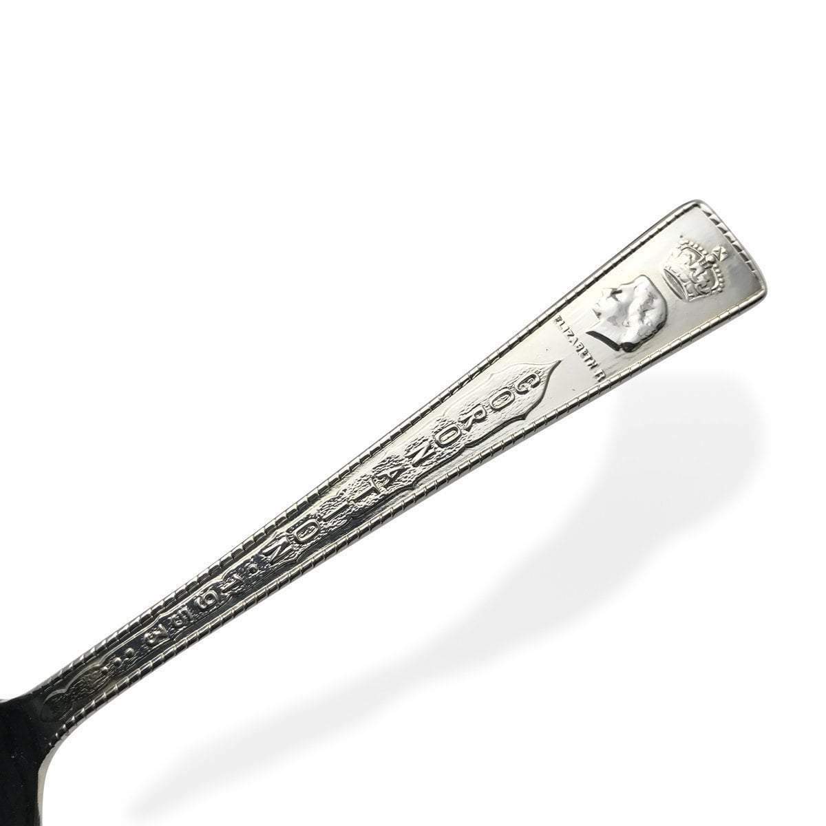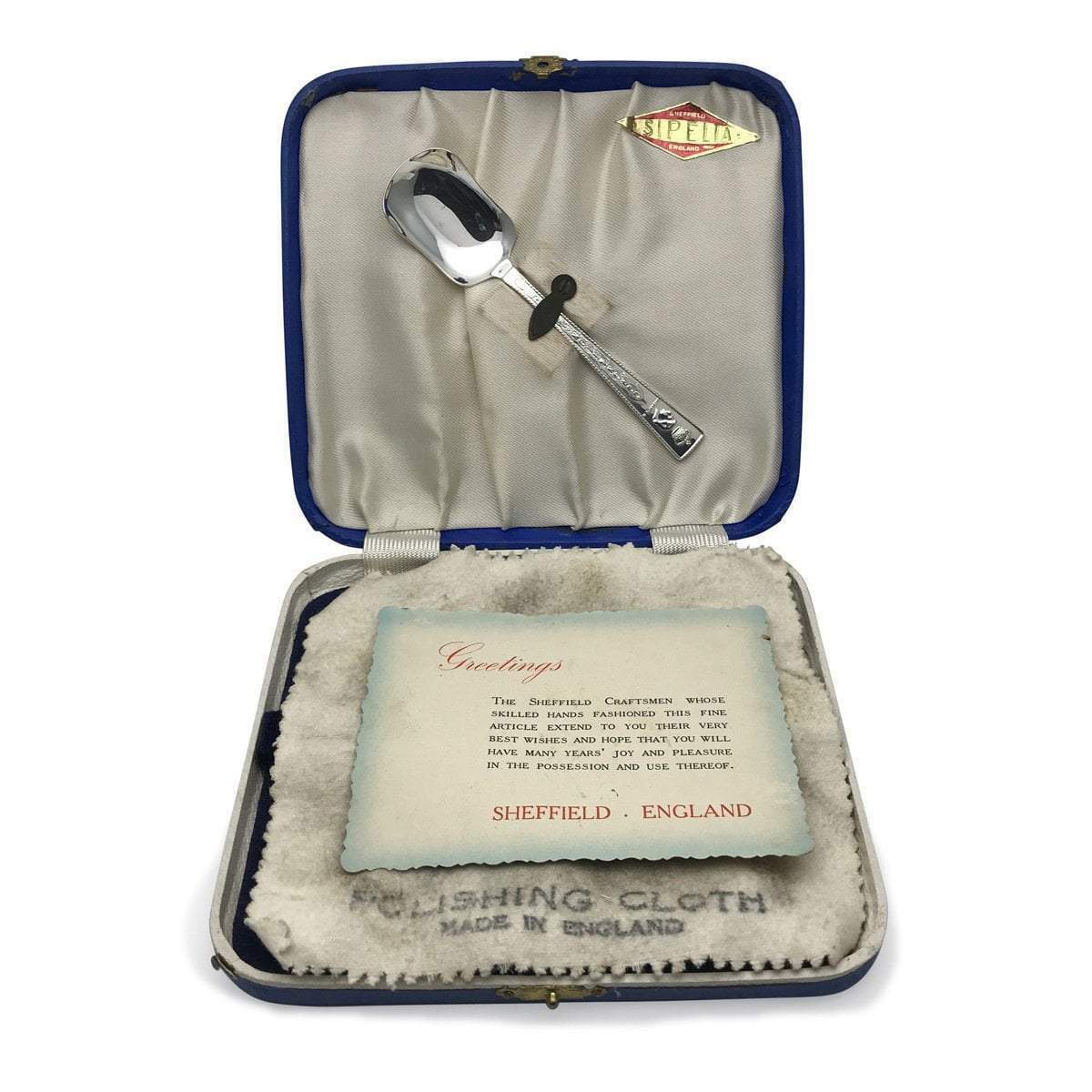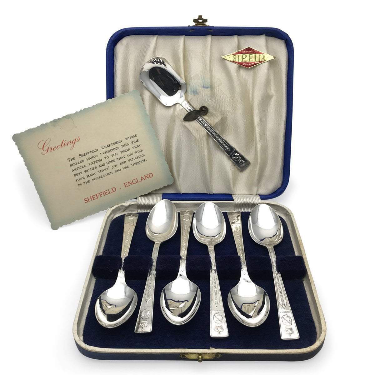 This rare set of commemorative silver plated spoons was made by Sipelia, Sheffield, England in 1953. The set is composed of 6 teaspoons, 1 sugar spoon, polishing cloth, original box and quality card. We have two identical sets, the only differences are on the label on the outside of the boxes.