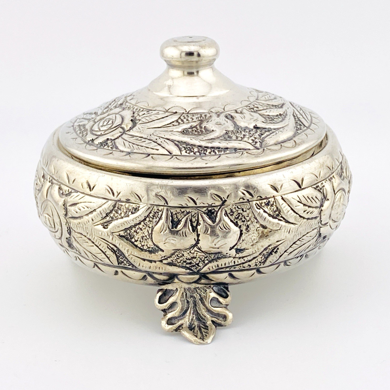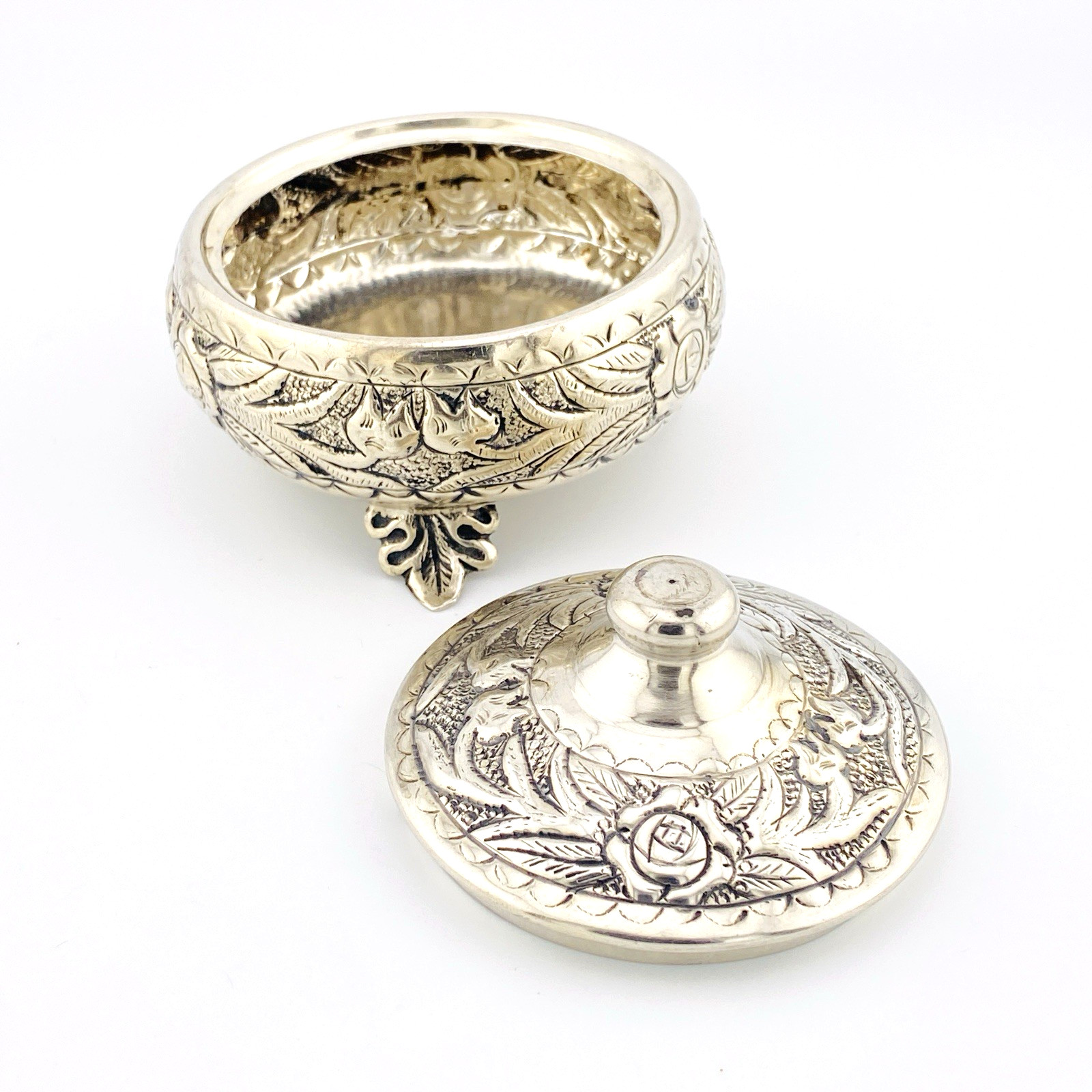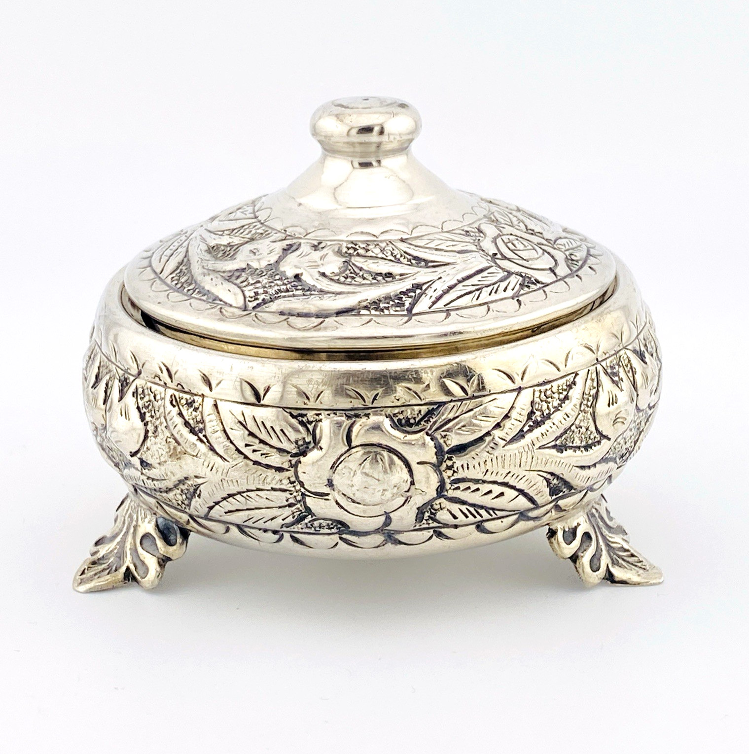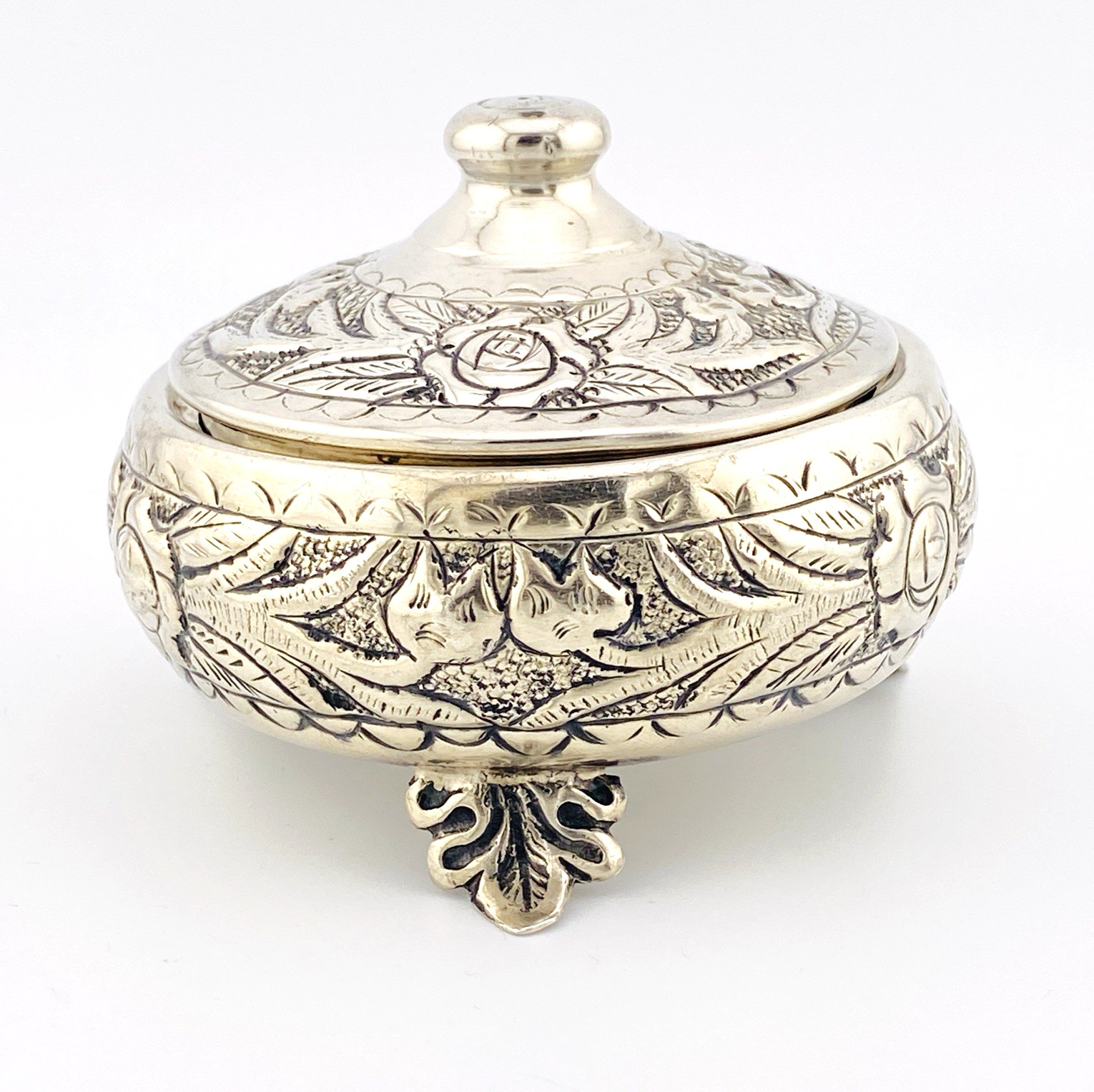 The box rests on delicately formed leaf-shaped feet, adding height and refinement to the form. The lid is domed and decorated to match, creating a cohesive and balanced design. A hand engraved initial “R” appears on the underside.