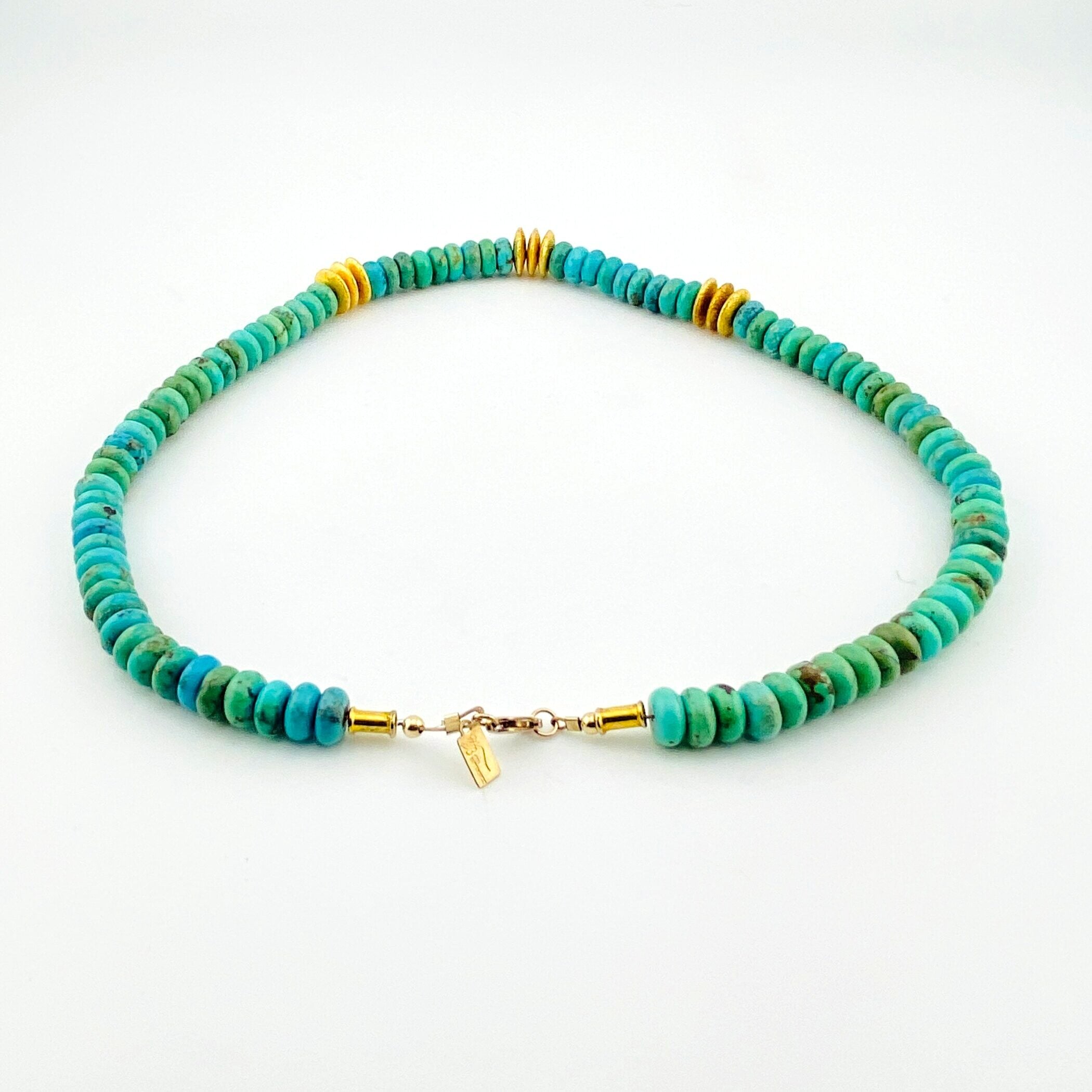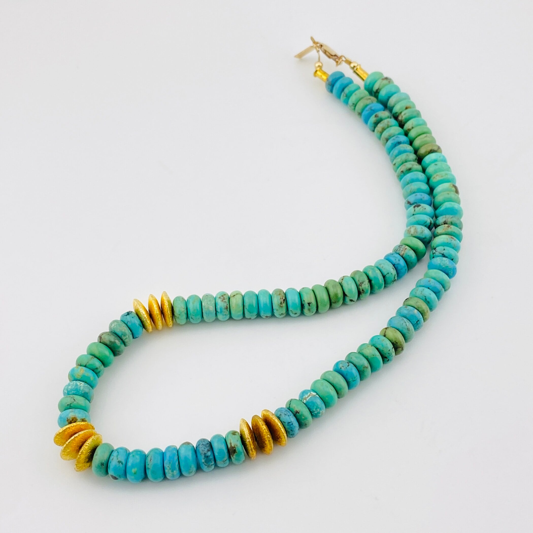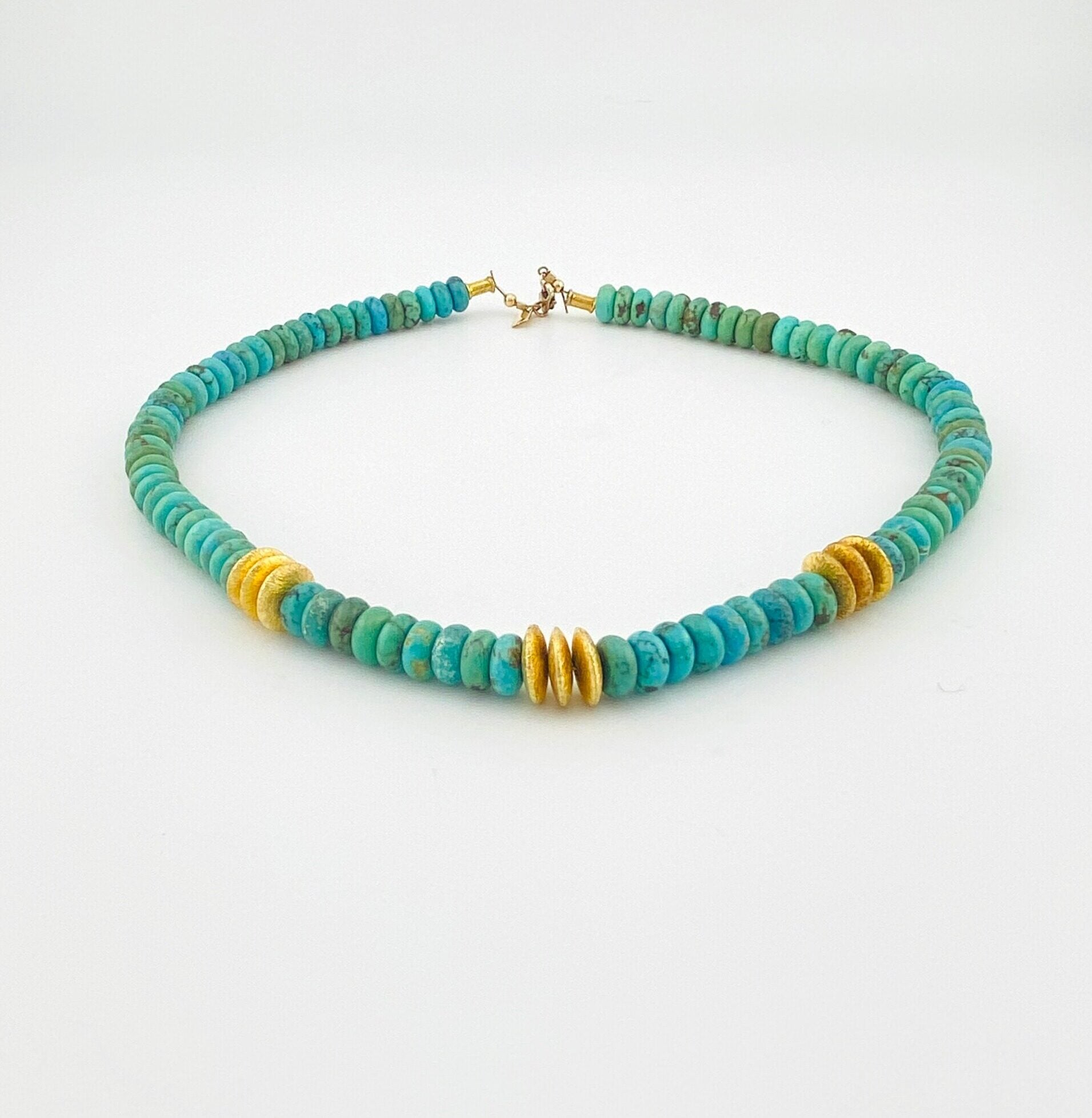 Unlike traditional heishi, the beads are softly rounded rather than cut flat, giving the piece a more fluid, sculptural presence. The turquoise displays natural variation, with light brown veining and gentle shifts in tone that highlight its untreated character.