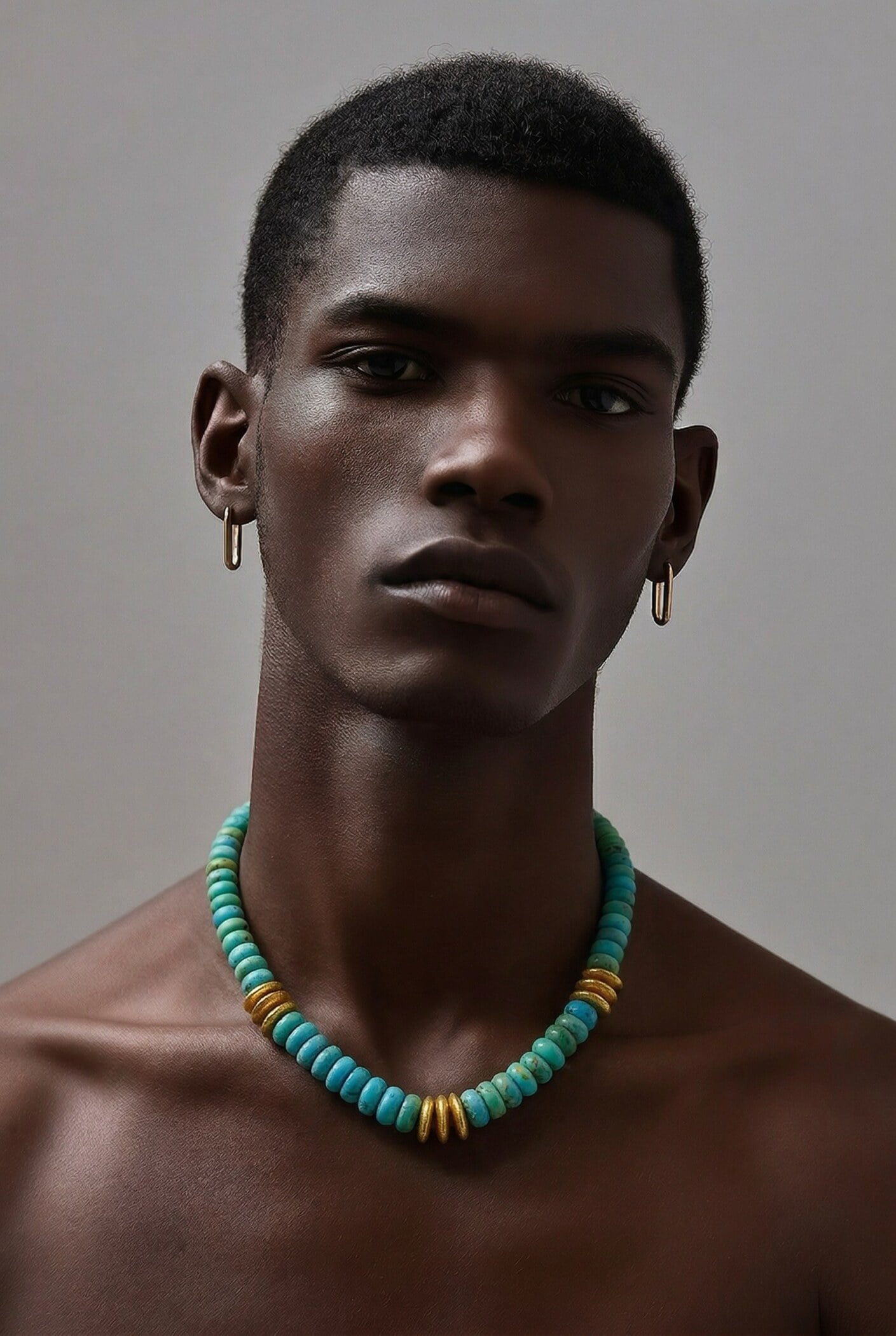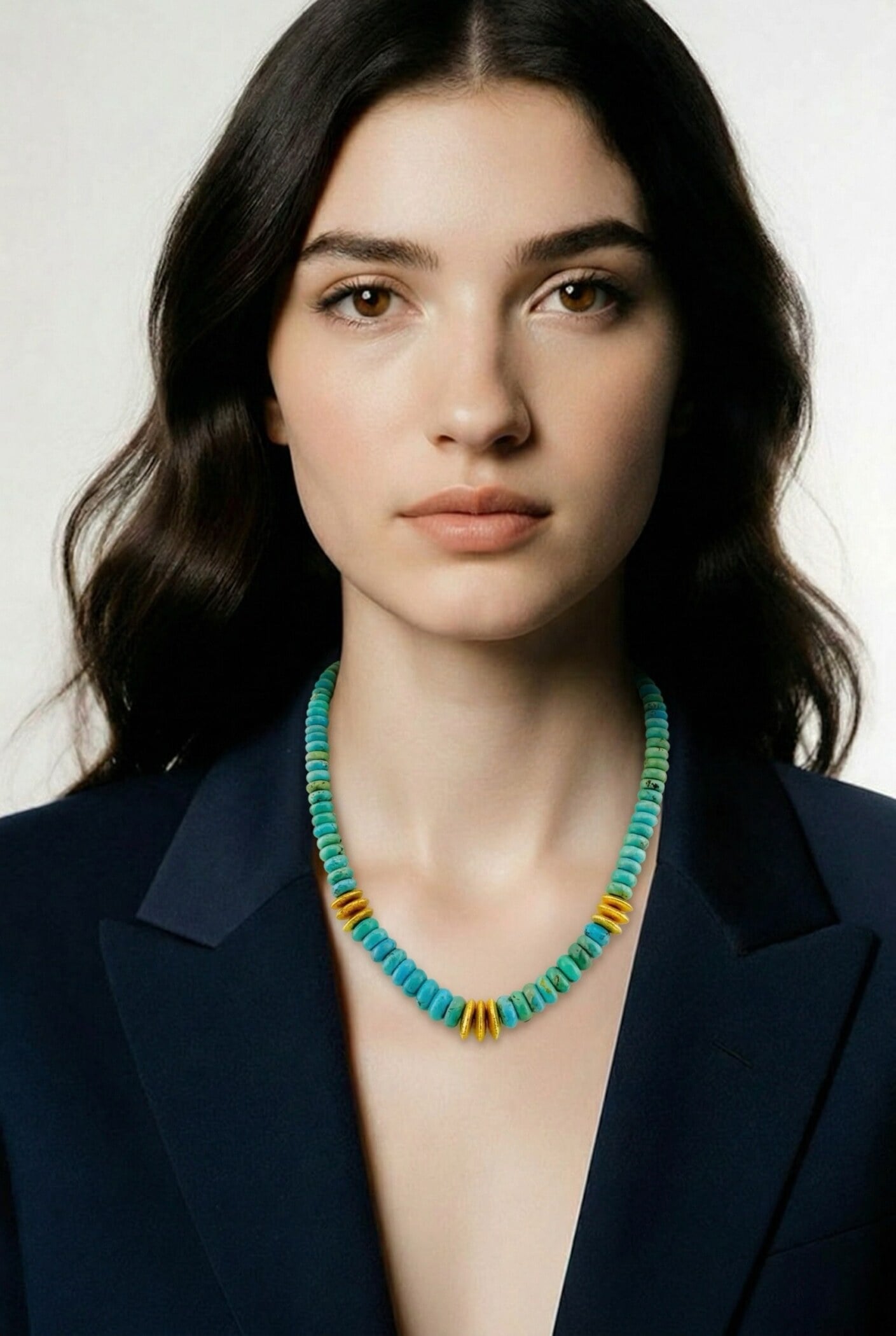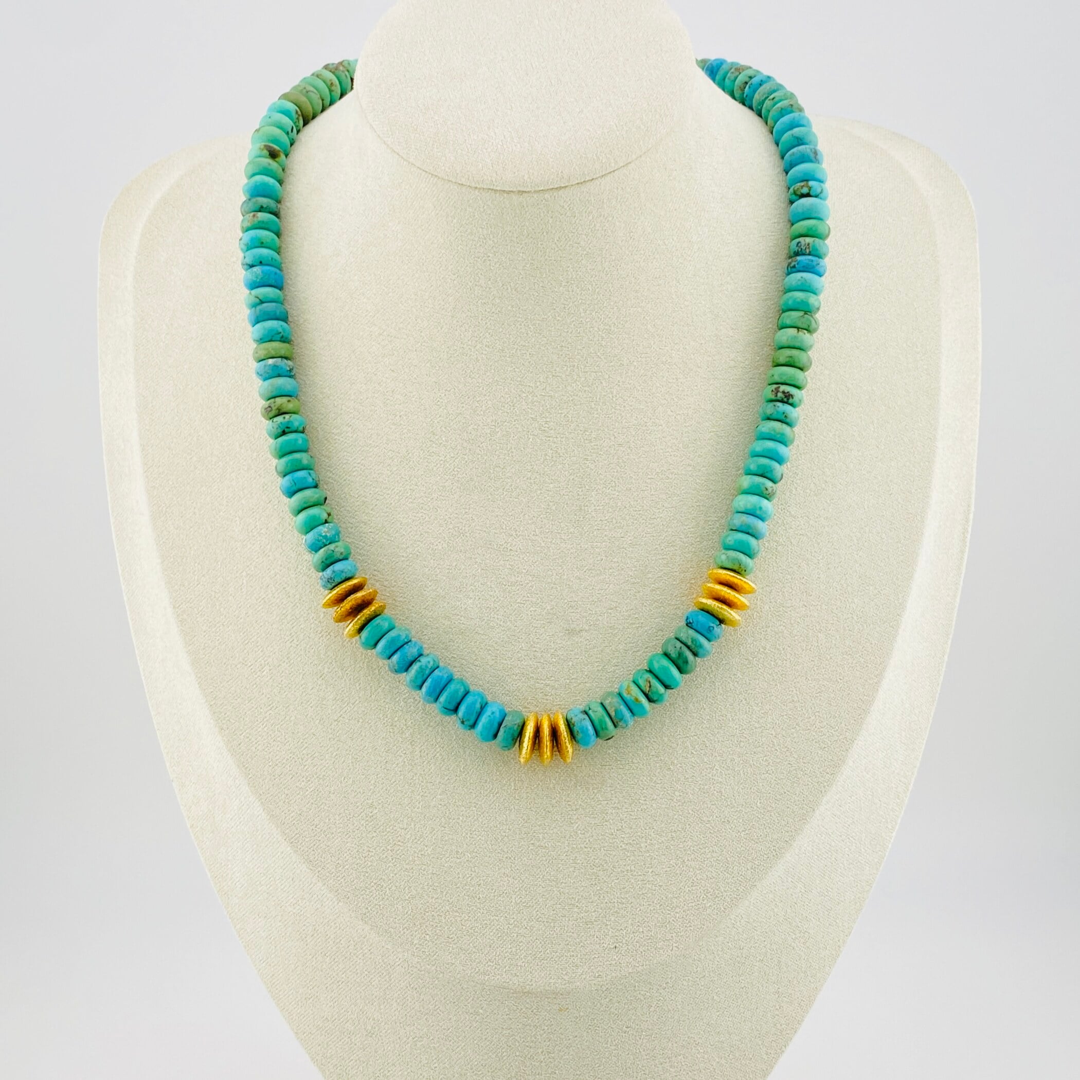 Unlike traditional heishi, the beads are softly rounded rather than cut flat, giving the piece a more fluid, sculptural presence. The turquoise displays natural variation, with light brown veining and gentle shifts in tone that highlight its untreated character.