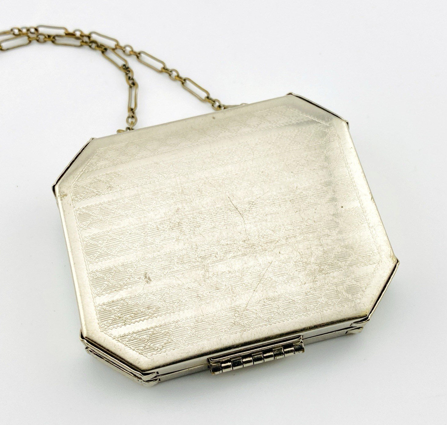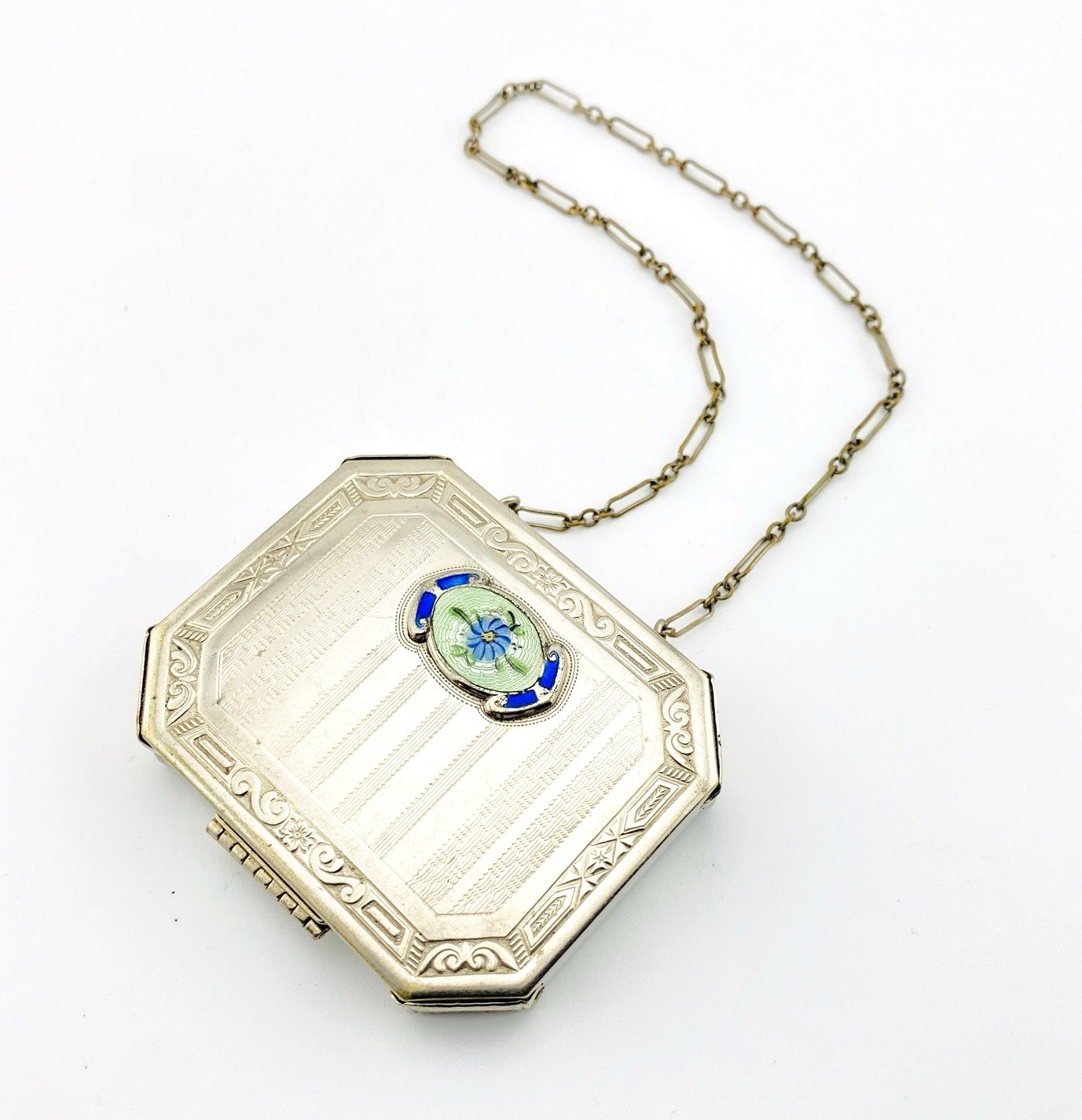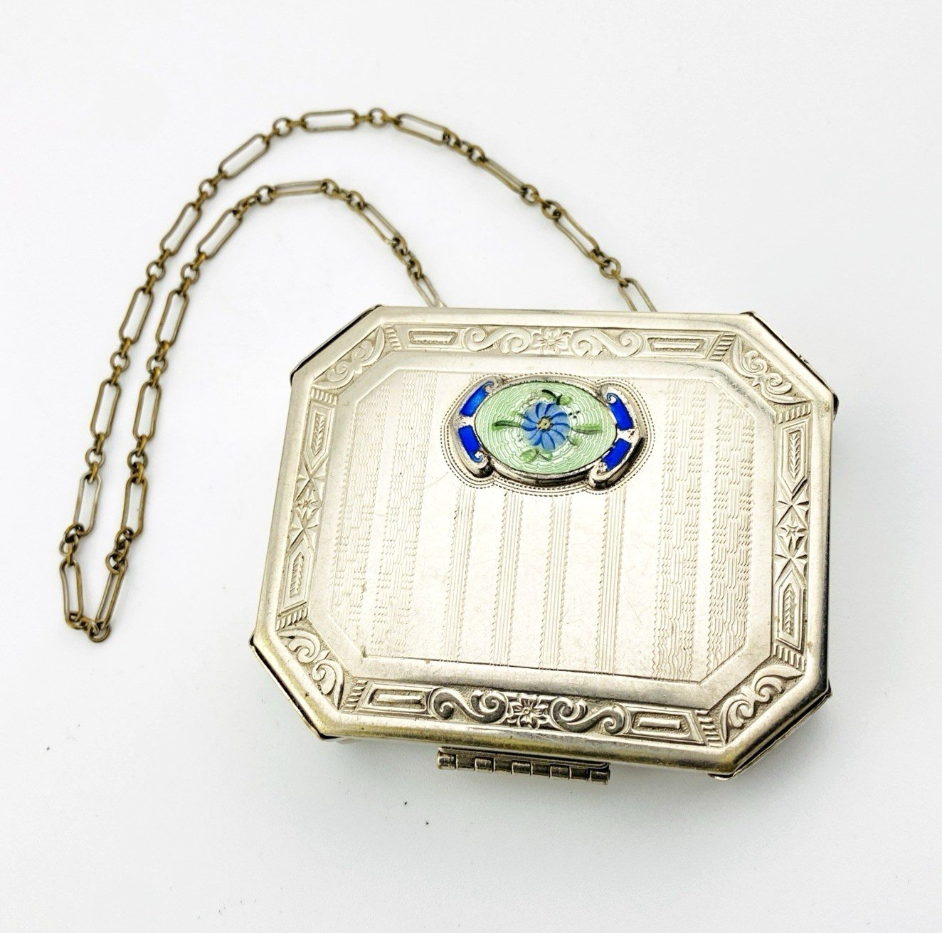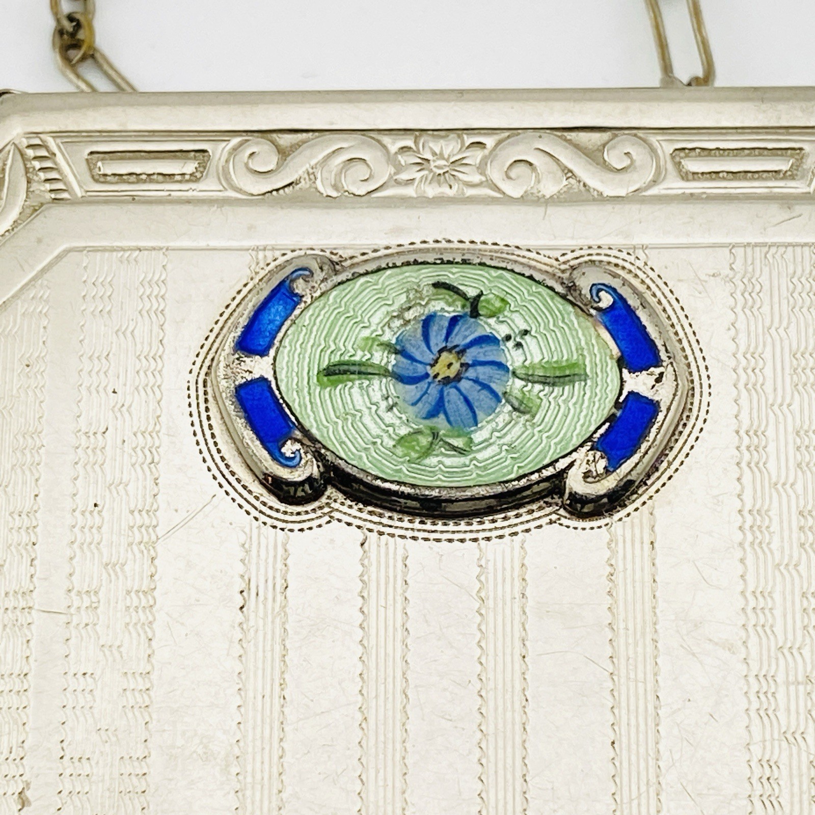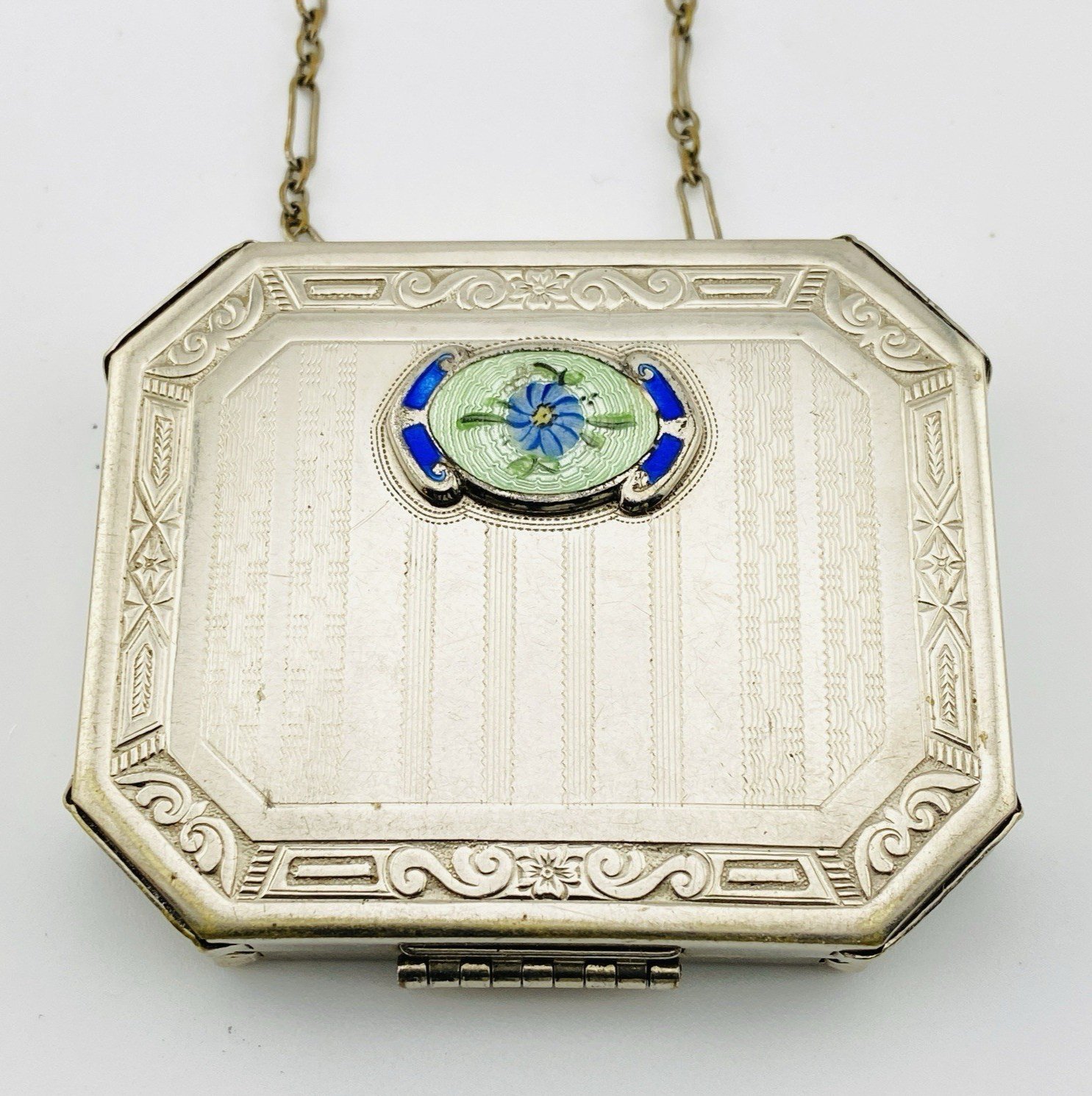 Antique Art Deco Necessaire Compact Purse Chrome with Floral Guilloche Enamel ca 1920s