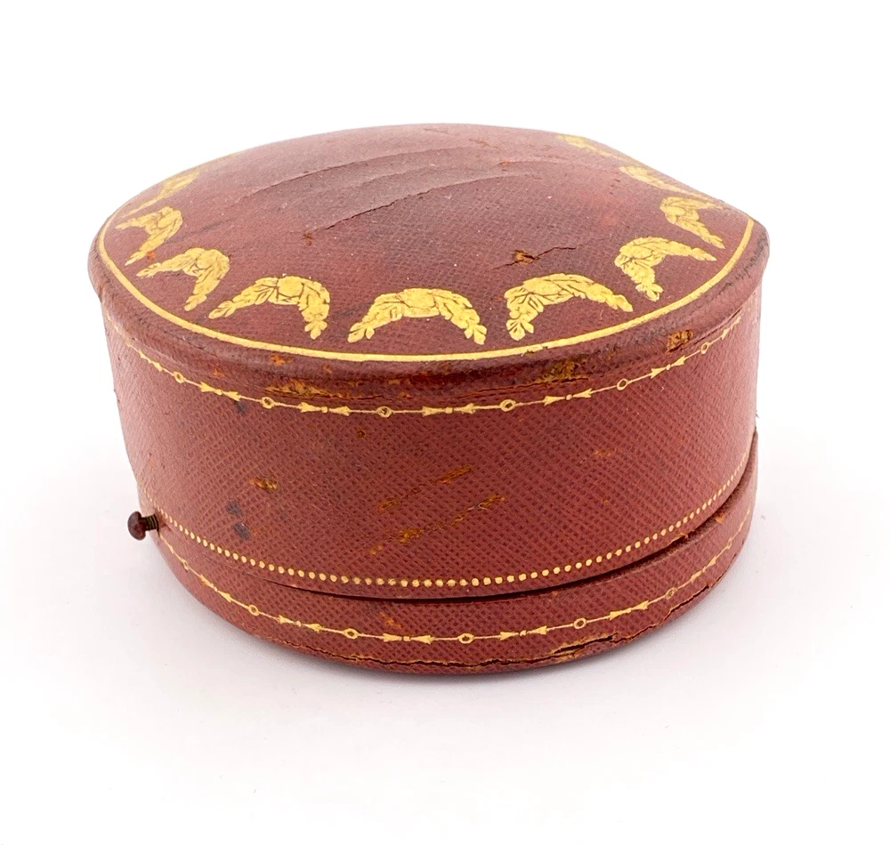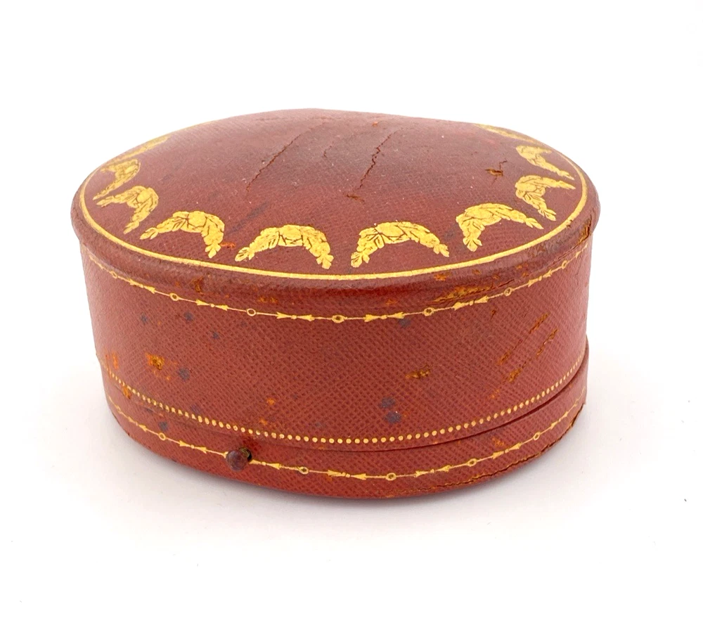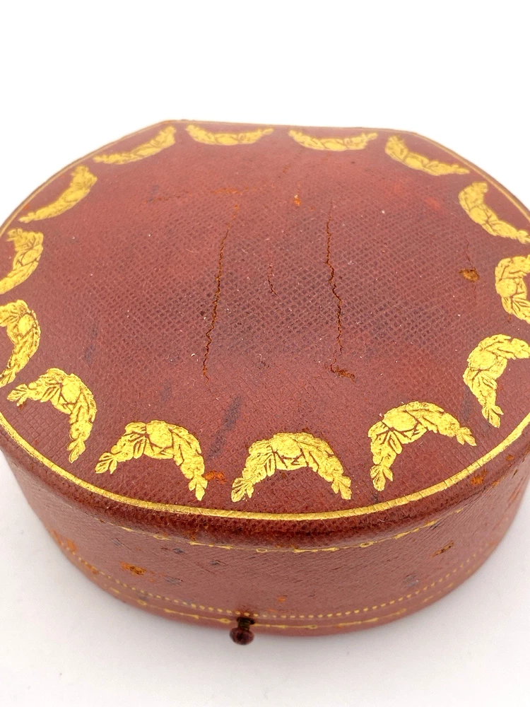 An early Cartier presentation box with richly tooled leather and gilt garland detailing, embodying the quiet luxury of the maison’s early design language.