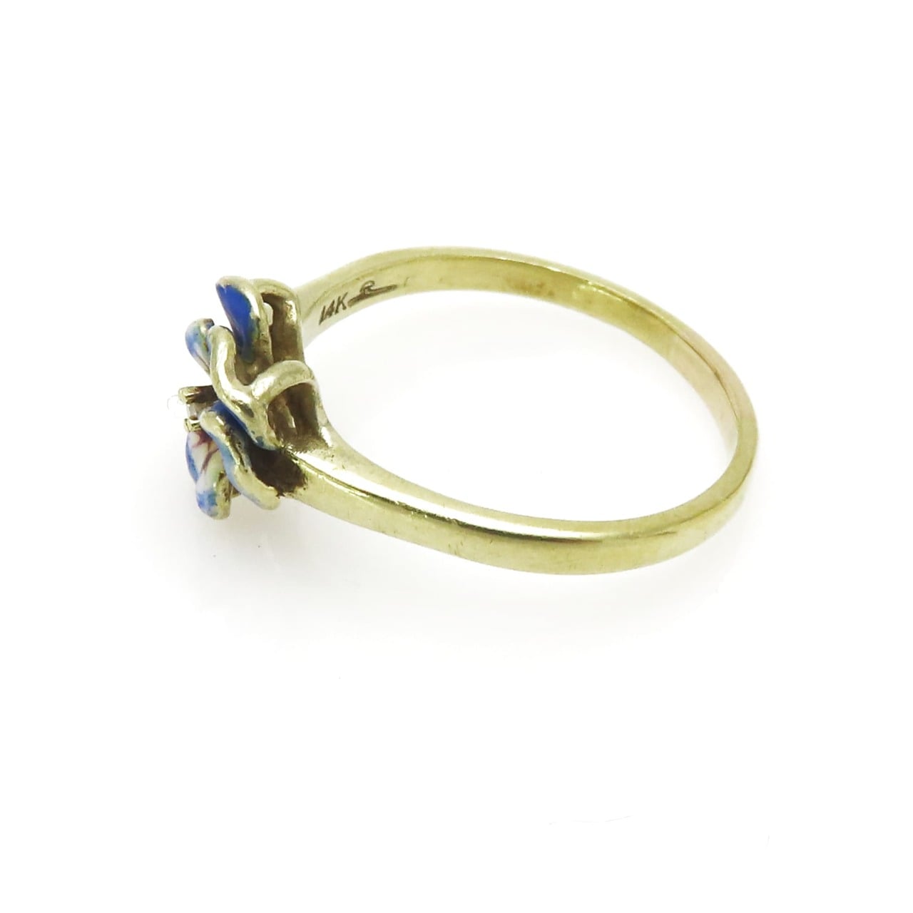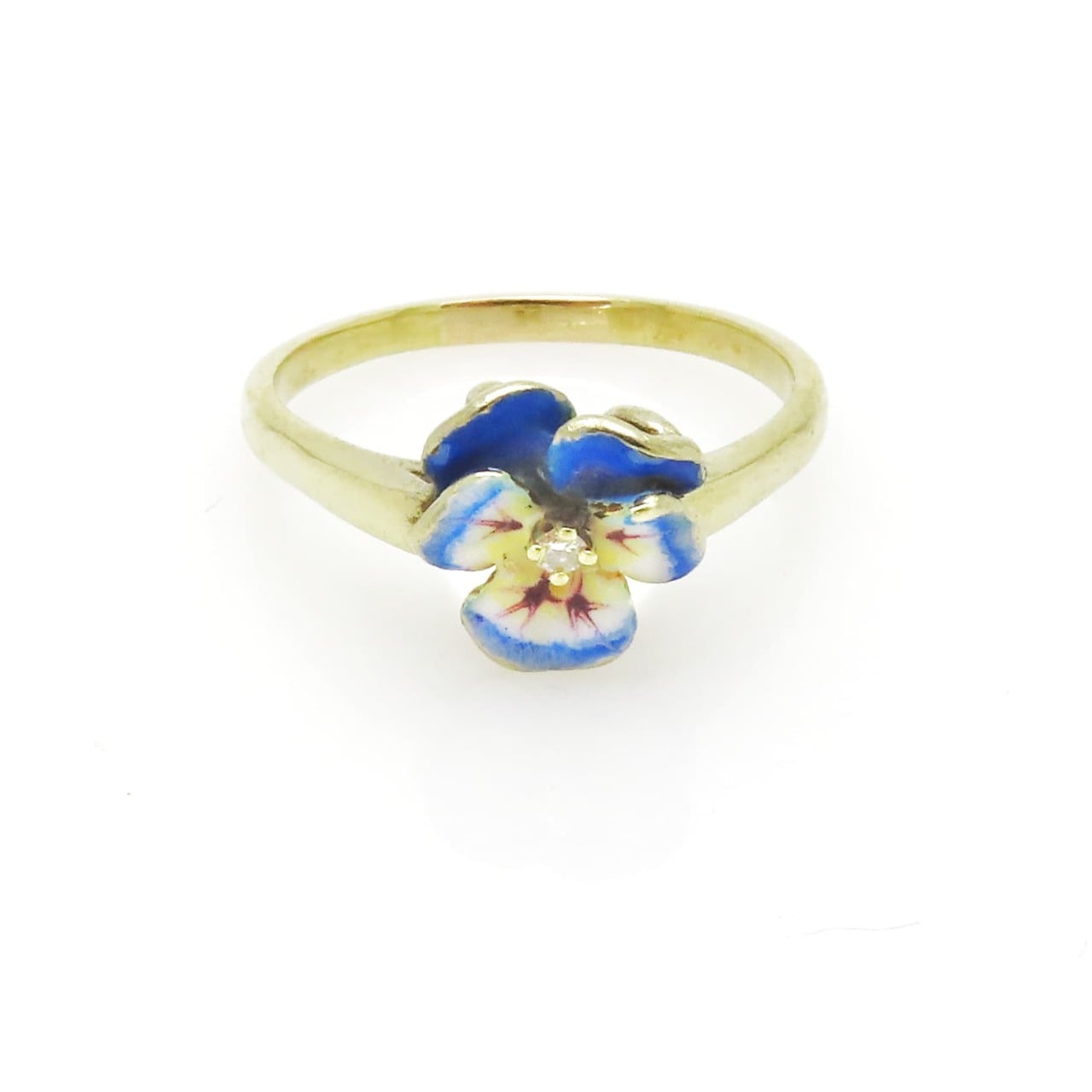 A lovely finely detailed antique Art Nouveau enameled pansy flower ring ca. 1900s, made of solid 14k yellow gold and set with a 0.02 carat fiery diamond at the center of the enameled flower.