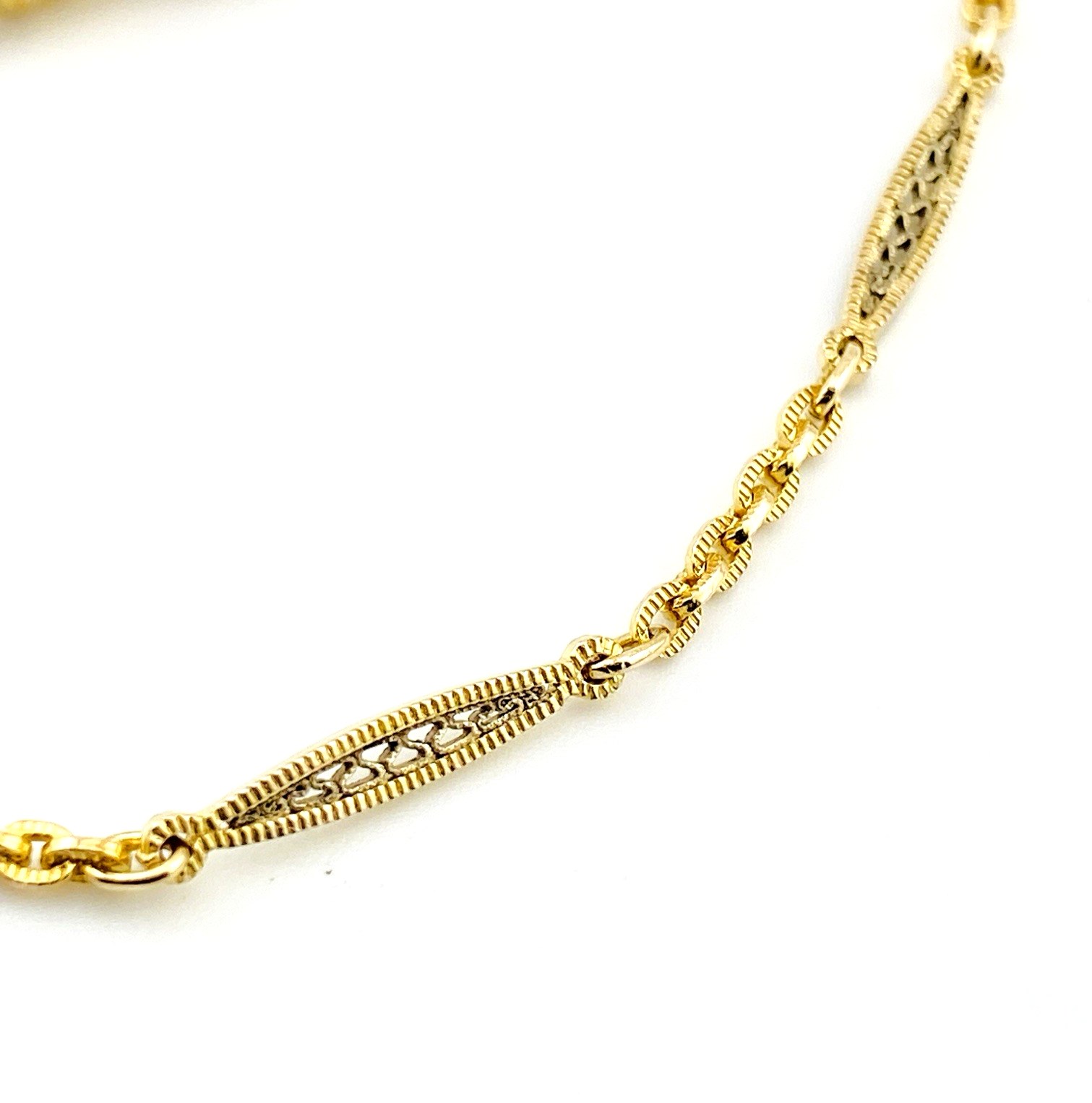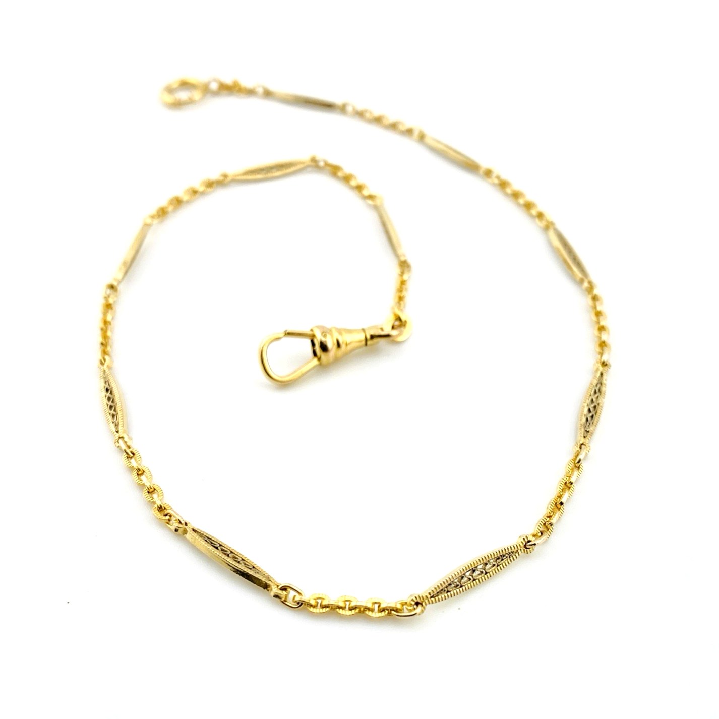 This antique pocket watch chain is crafted in 1/20 12k gold filled metal and features distinctive zig-zag bar links with finely ridged surfaces. Even the oval connecting links are textured, giving the entire chain a refined, cohesive look with excellent visual depth.