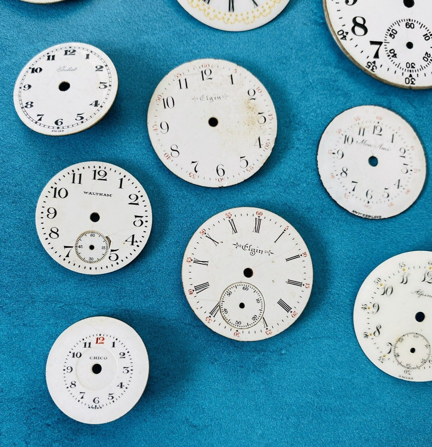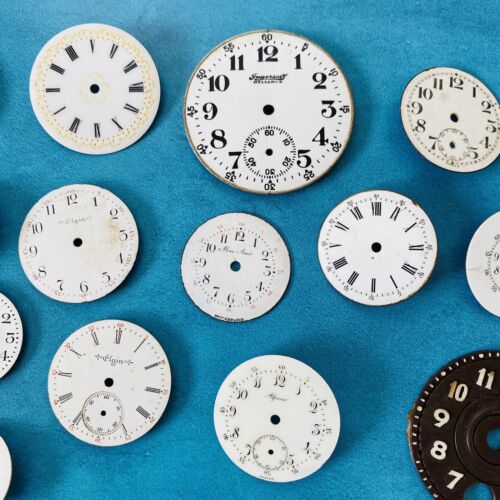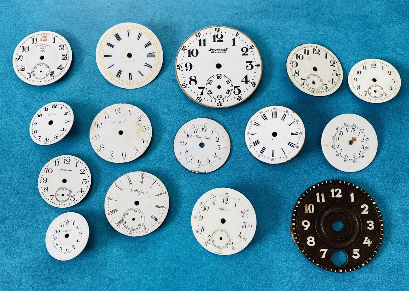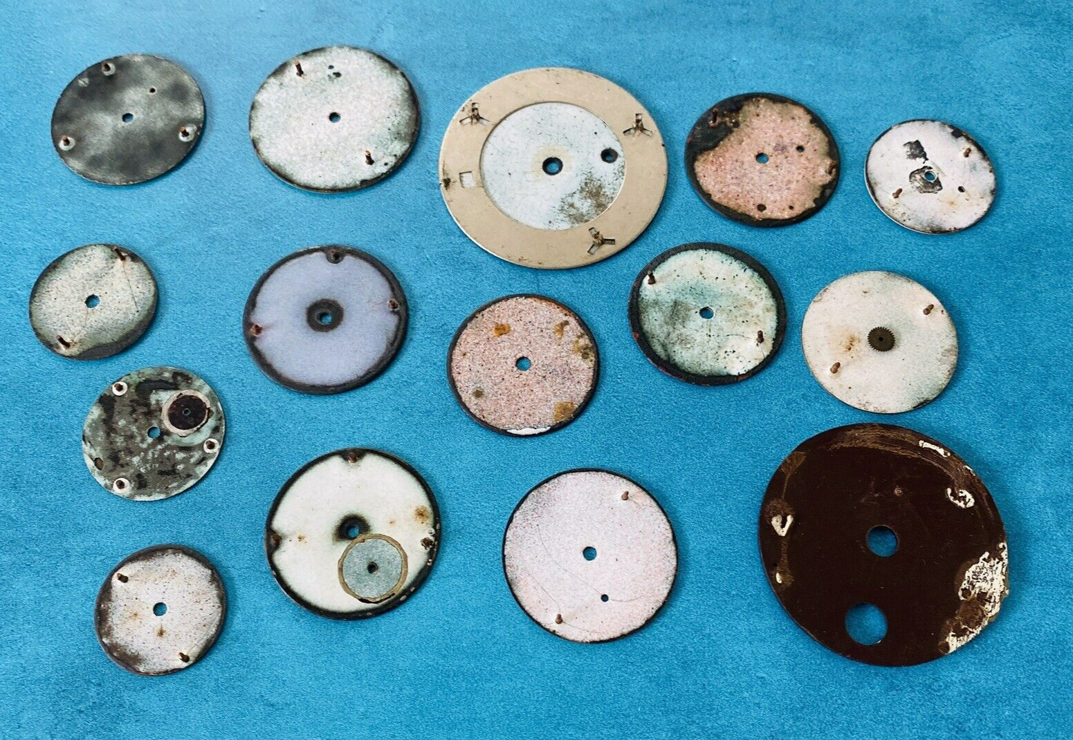 Antique Pocket Watch Dial Lot of 15 Different Sizes Types – 14 Enameled – 1 Brown Plastic – Repurpose Restoration Repairs
