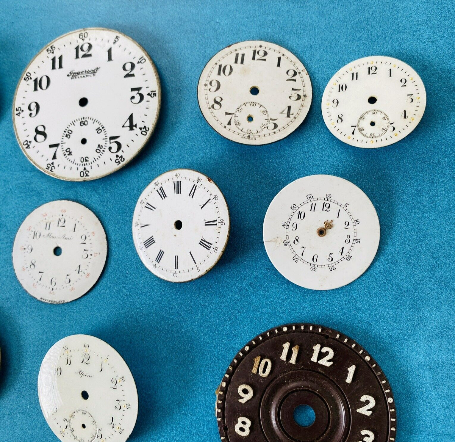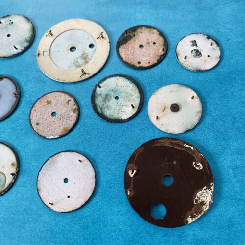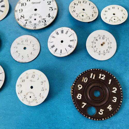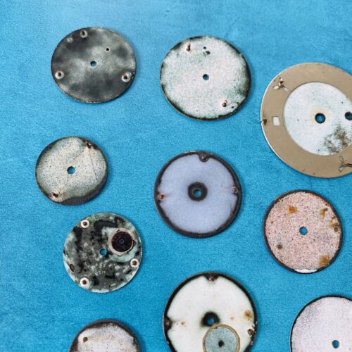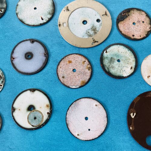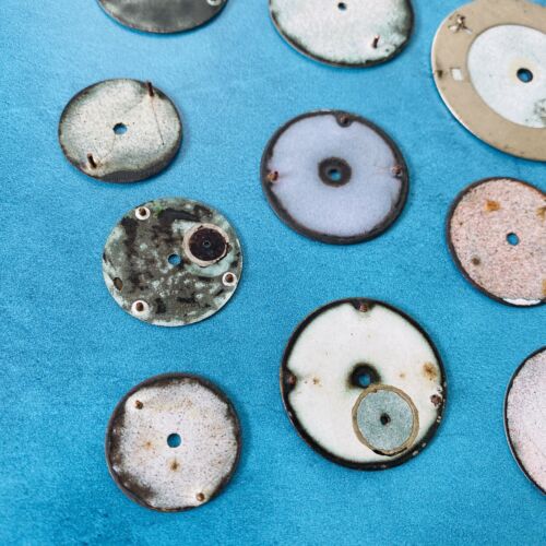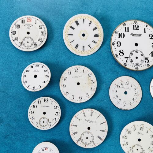 Antique Pocket Watch Dial Lot of 15 Different Sizes Types – 14 Enameled – 1 Brown Plastic – Repurpose Restoration Repairs