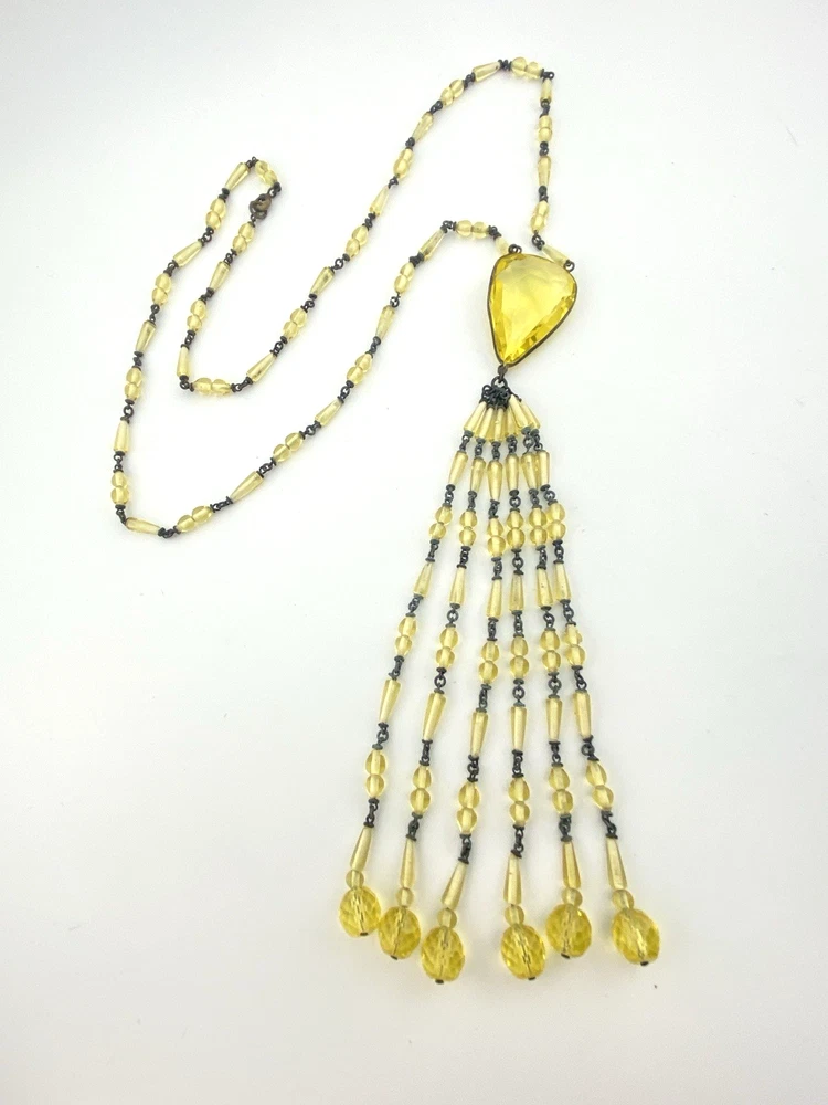 Below, six articulated tassels extend gracefully, each composed of matching beads and finished with larger faceted drops that add weight and movement. The overall effect is fluid and striking, true to flapper-era styling.