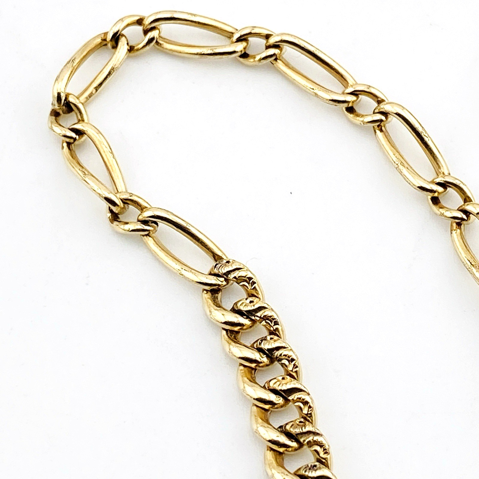 This handsome antique chain dates to the Late Victorian era and showcases a thoughtful combination of traditional link styles. The outer sections feature the classic long-and-short (end-to-end) configuration, while the center section is formed by a substantial curb chain with partially textured links that give a subtly carved or repoussé effect.