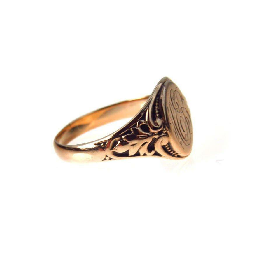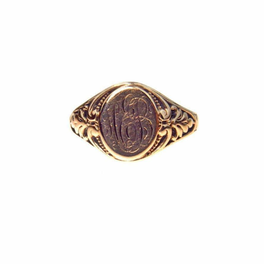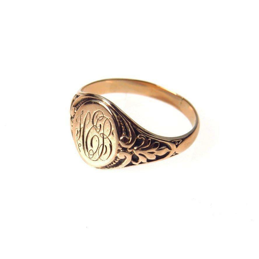 Very pretty deeply carved 10k Gold signet ring from the Victorian Era. Hand engraved initials in beautiful elaborate script appear to be H.E.B.