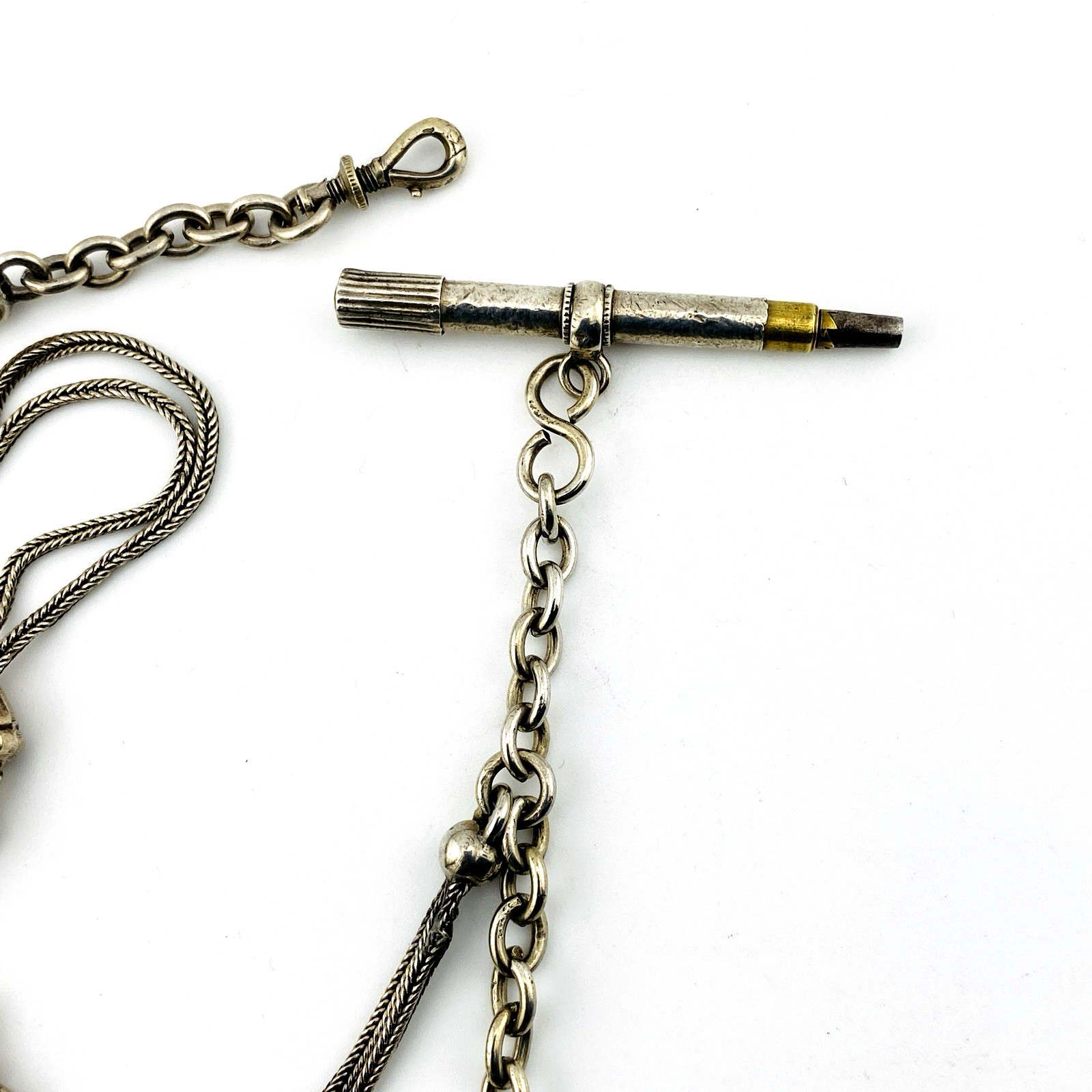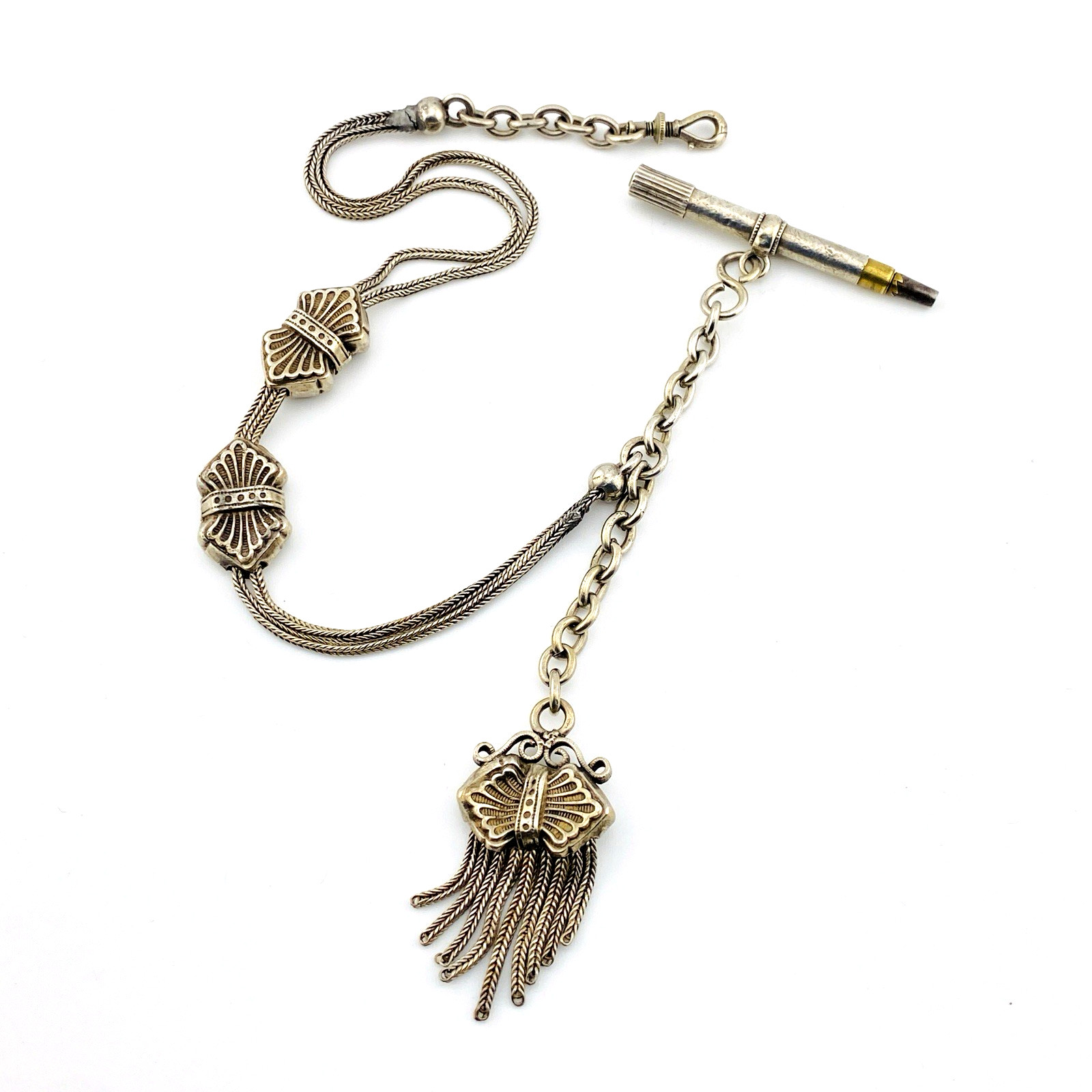 Elegant and increasingly scarce, this antique Victorian sterling silver Albertina watch chain features a refined double-slide design with matching decorative elements throughout. The woven chain sections, coordinating slides, and tasseled fob create a cohesive and visually balanced example of period watch chain craftsmanship.