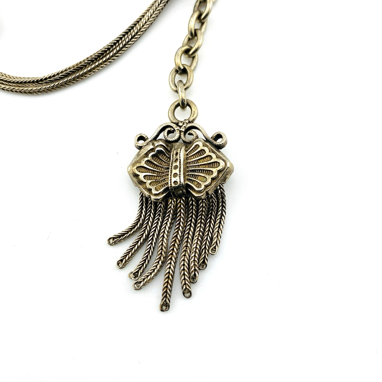The tasseled drop shows signs of having been crushed, though it remains intact and does not detract from the overall beauty or rarity of the piece. A partial mark is present on the swivel clasp but is not fully legible. Overall, the chain remains in very good antique condition with wear consistent with age.