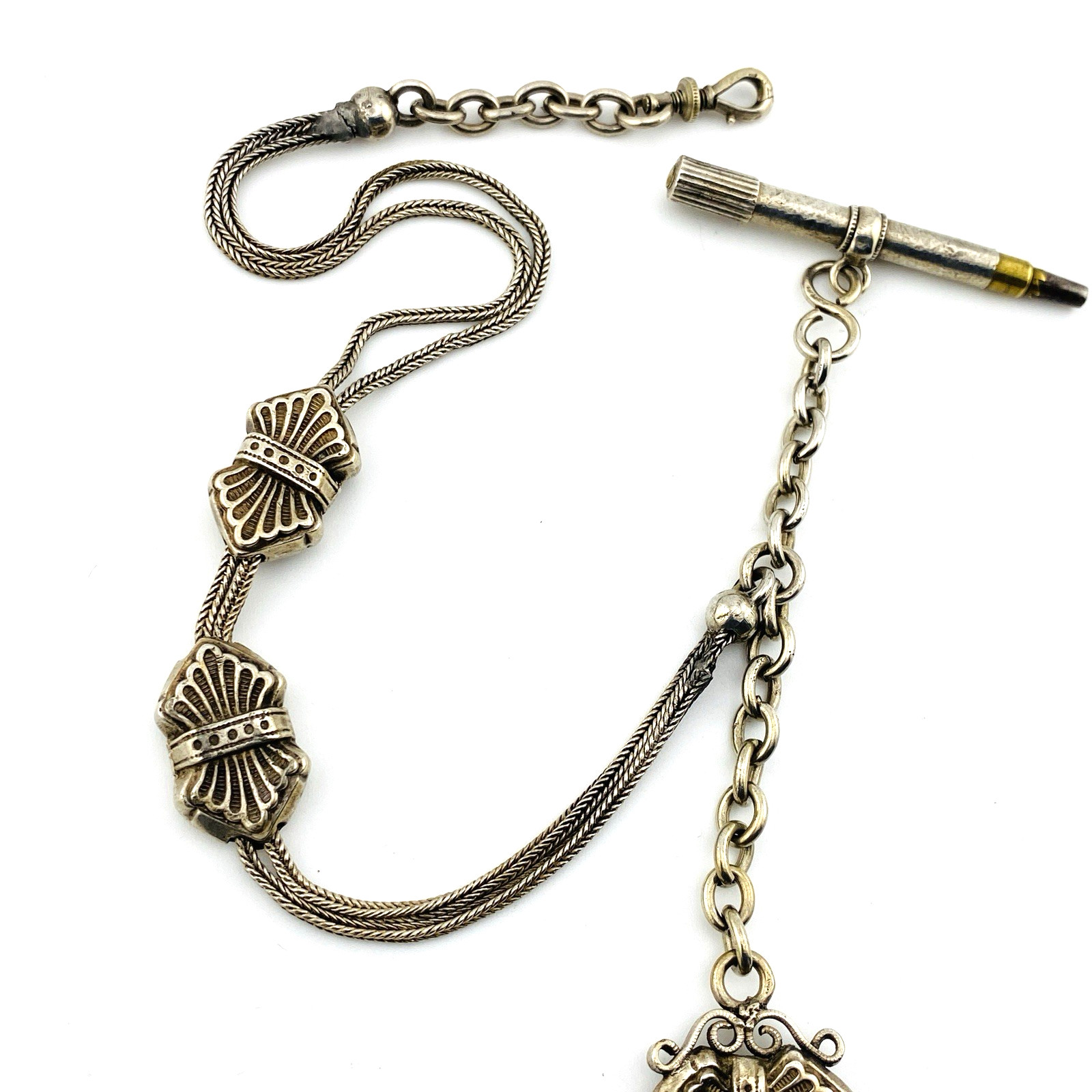 The chain includes two matching decorative slides, a tasseled drop with twisted wire strands, and a bar-form pocket watch key, allowing the piece to function both as a watch chain and as a complete accessory set. The early swivel dog clip clasp is opened by unscrewing, typical of older Albertina fittings.