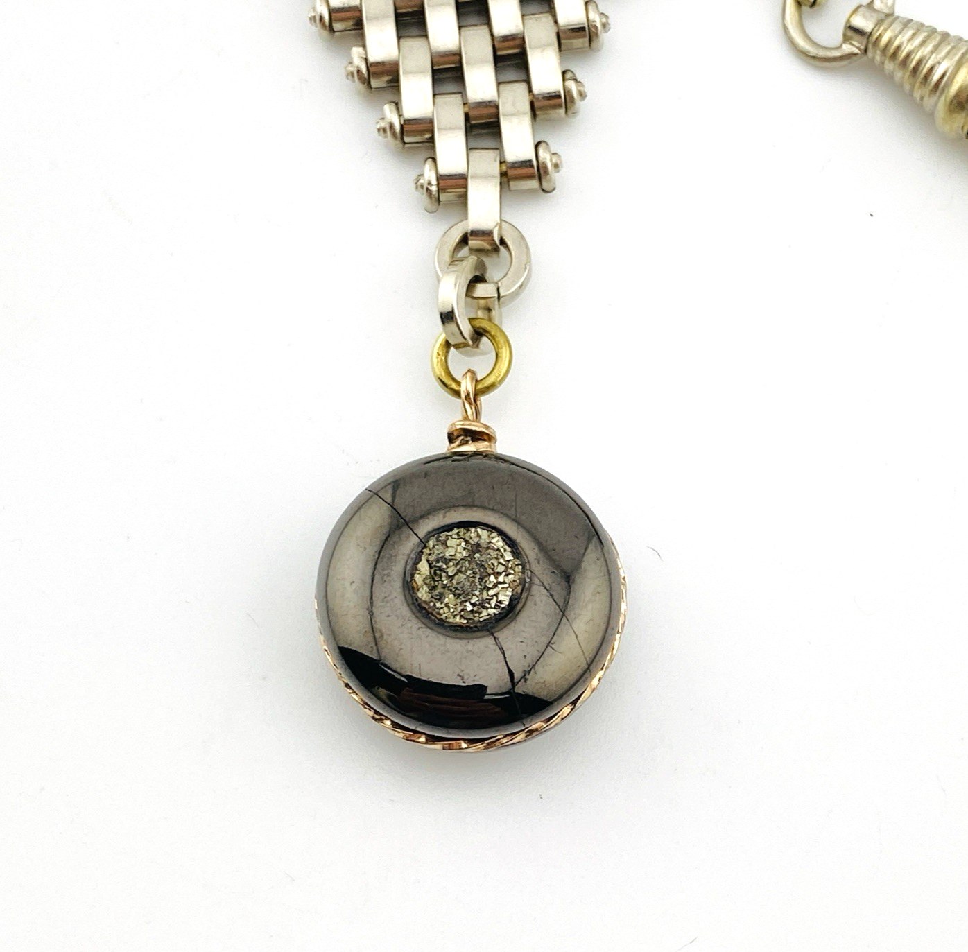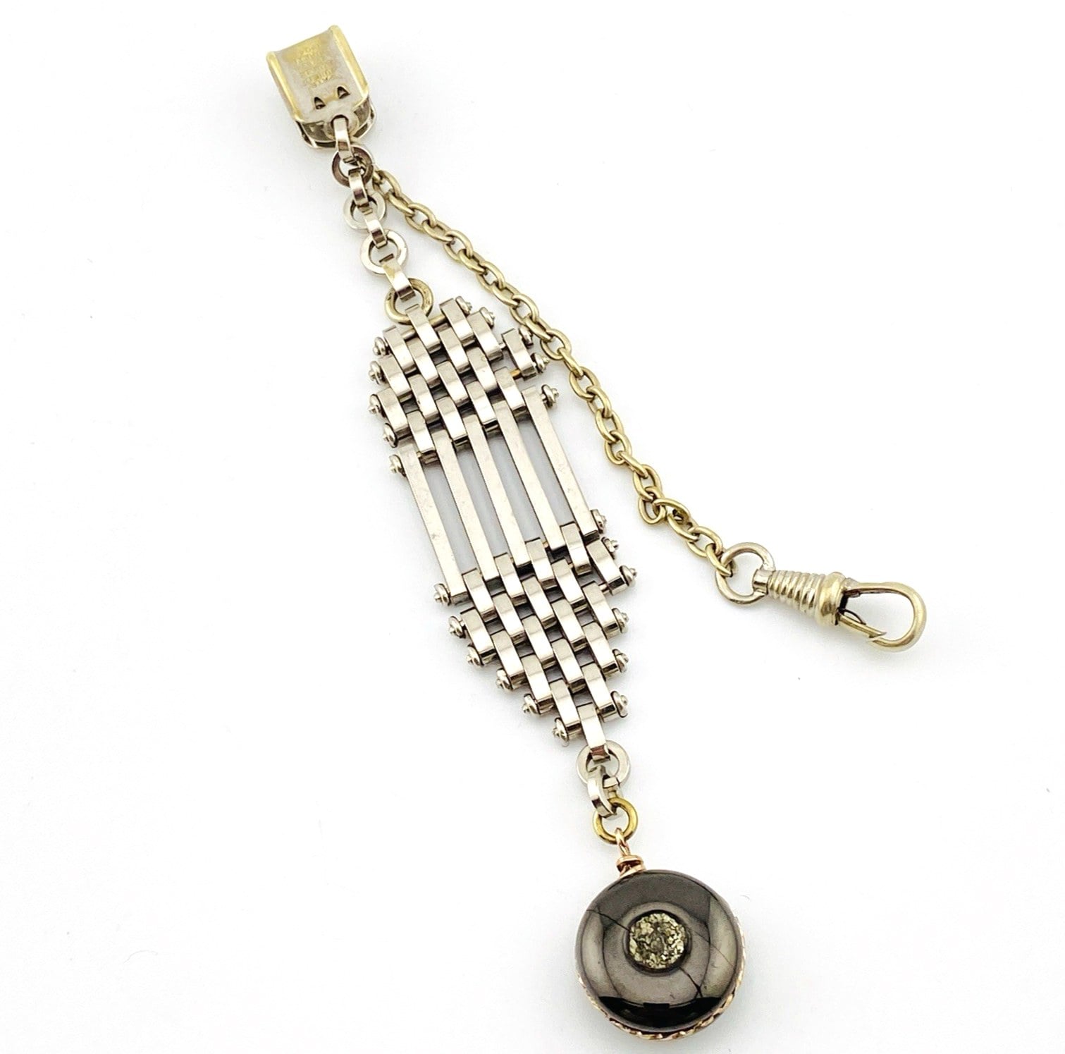 The combination of textured druzy and architectural chain links gives this fob a confident, industrial presence. The tank-tread, skyscraper-inspired pattern adds visual weight and rhythm, making it equally compelling worn traditionally with a pocket watch or styled today as a distinctive pendant or accessory.
