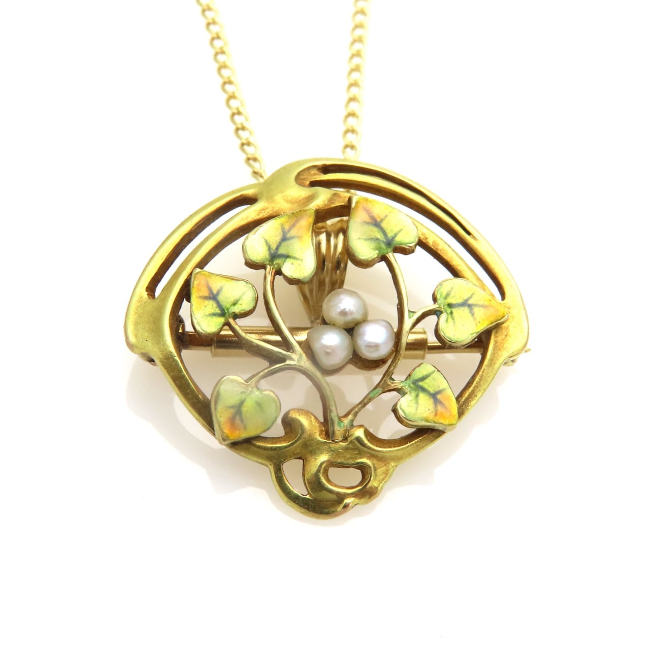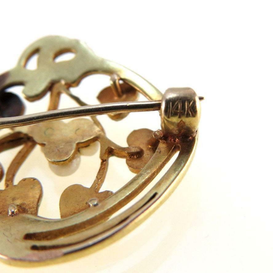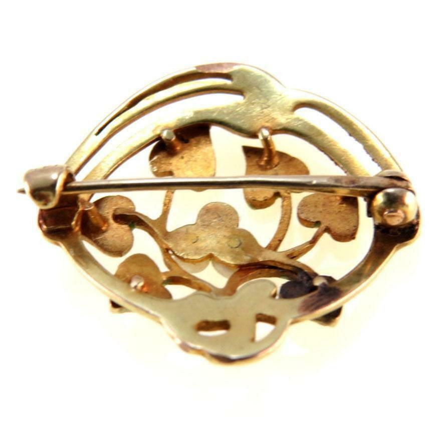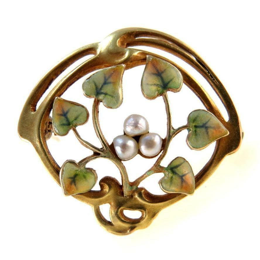 This gorgeous Art Nouveau antique pin is made of 14k gold, enamel and seed pearls. The motif incorporates two branches with enameled leaves centered by three natural seed pearls representing three eggs in a bird’s nest. The multicolor enamel on the leaves adds richness to this tiny jewel.