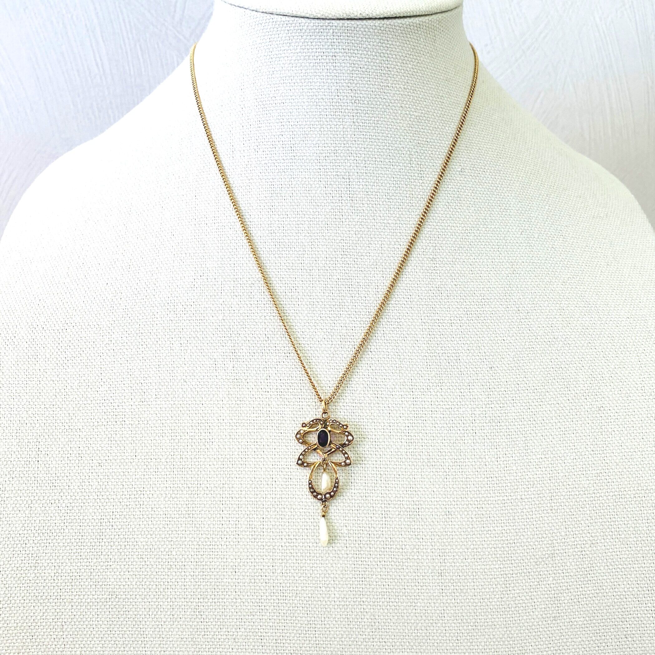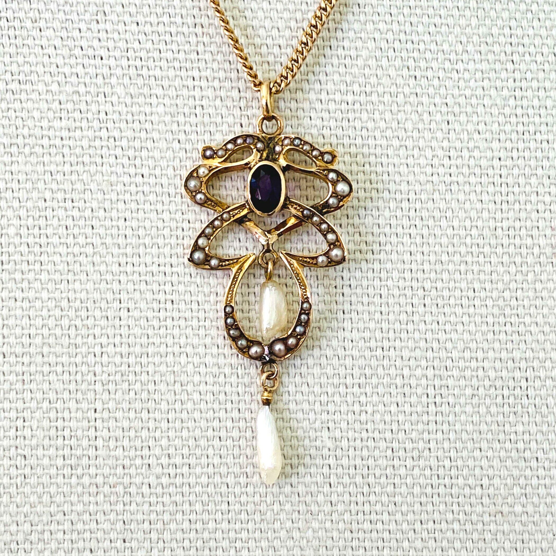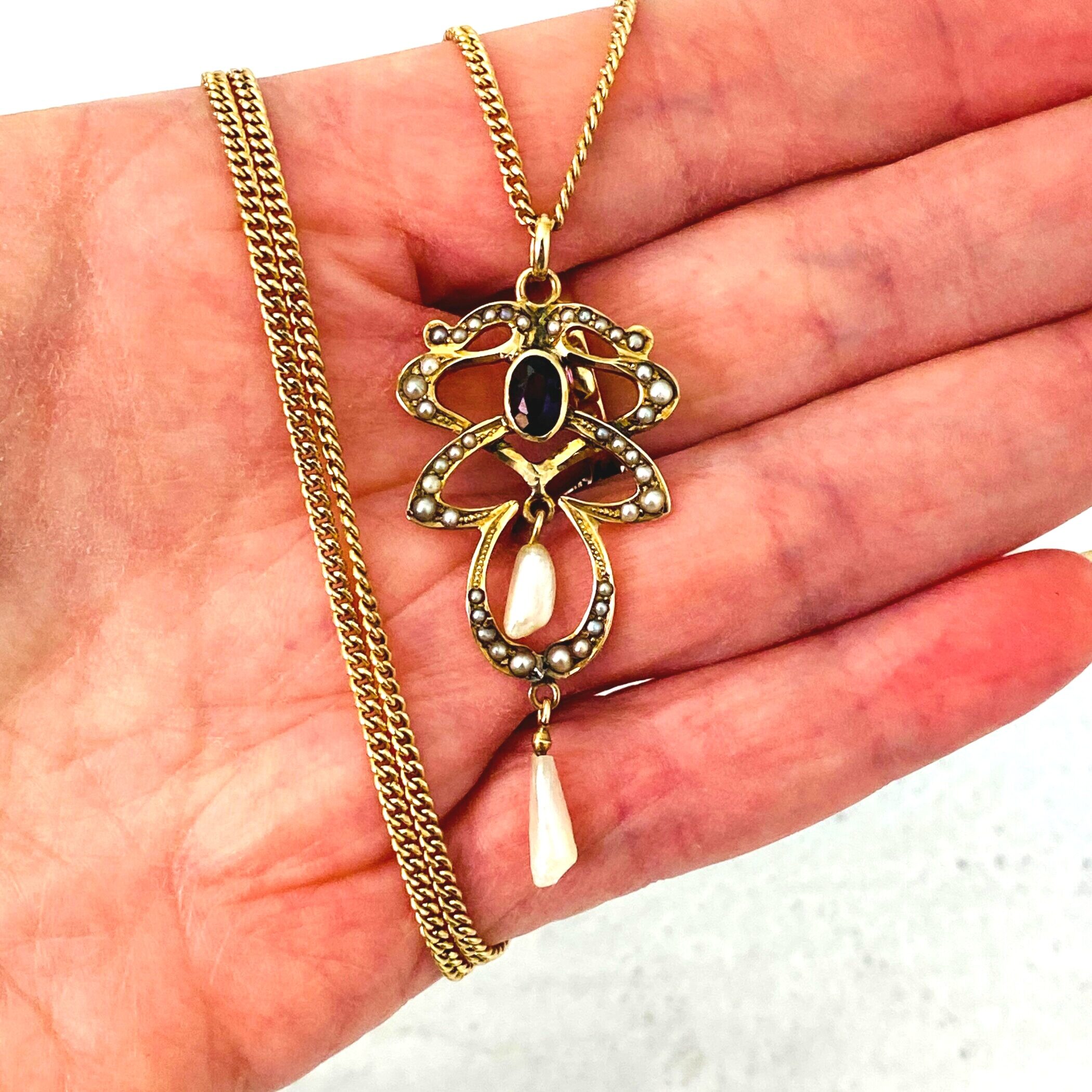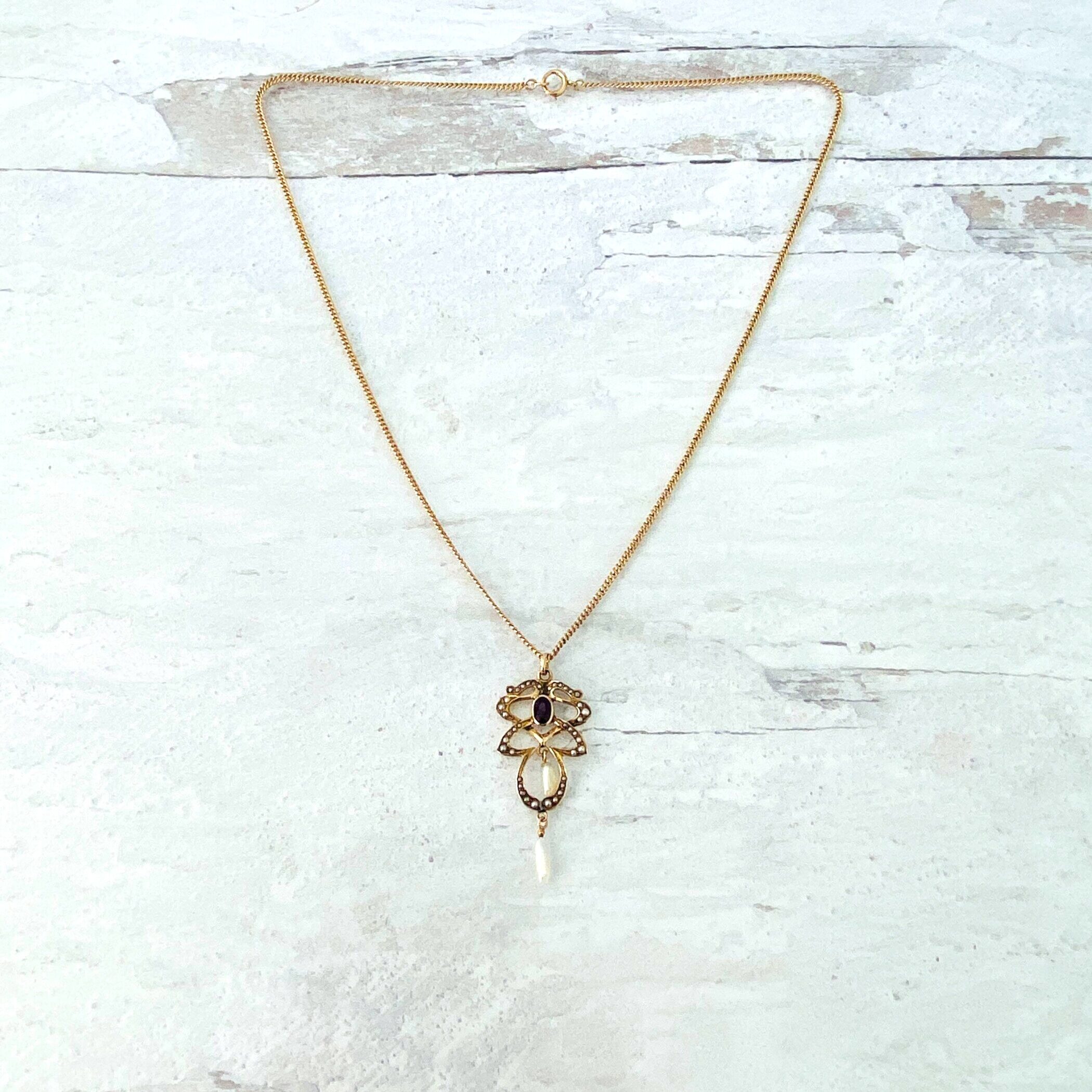 A lovely antique Art Nouveau lavalier necklace set with an oval faceted garnet and adorned with natural (not cultured) pearls.