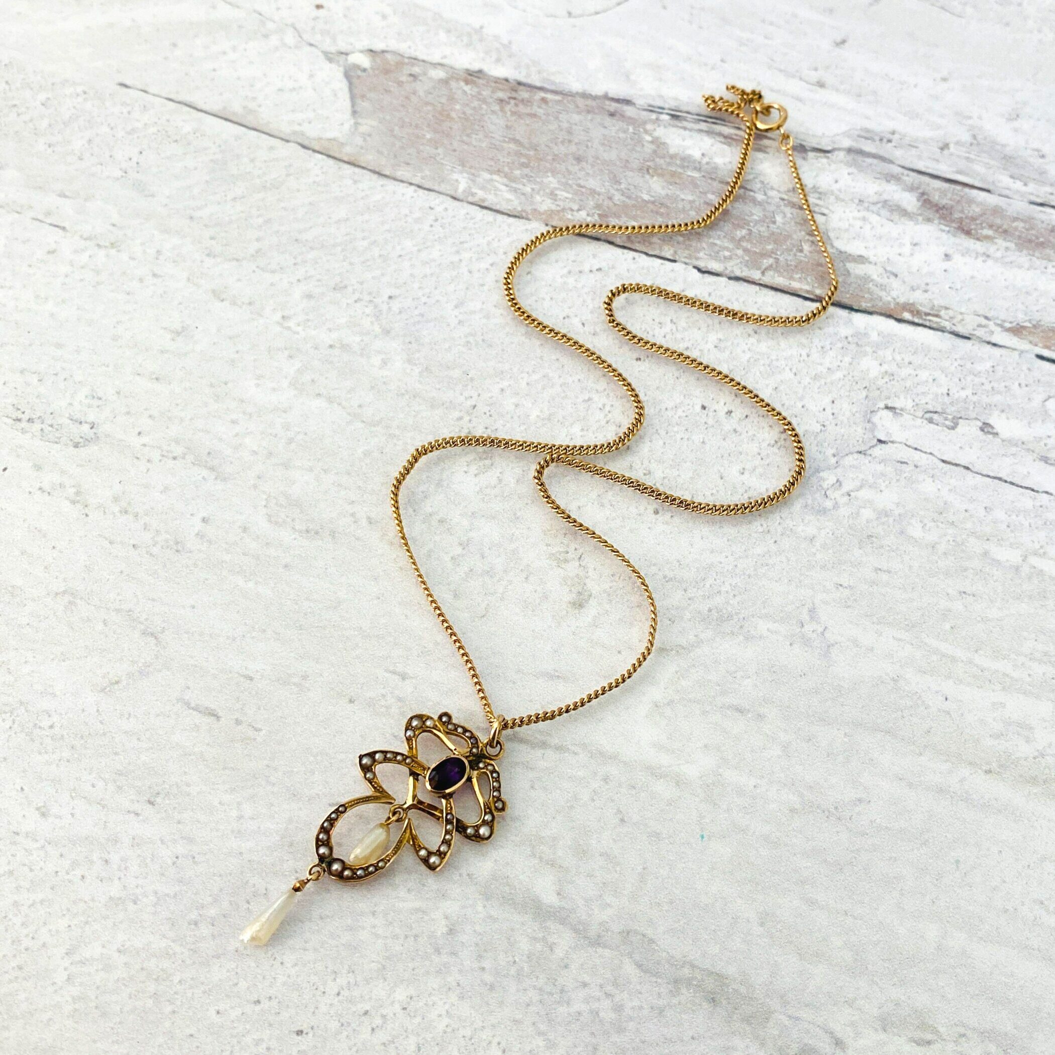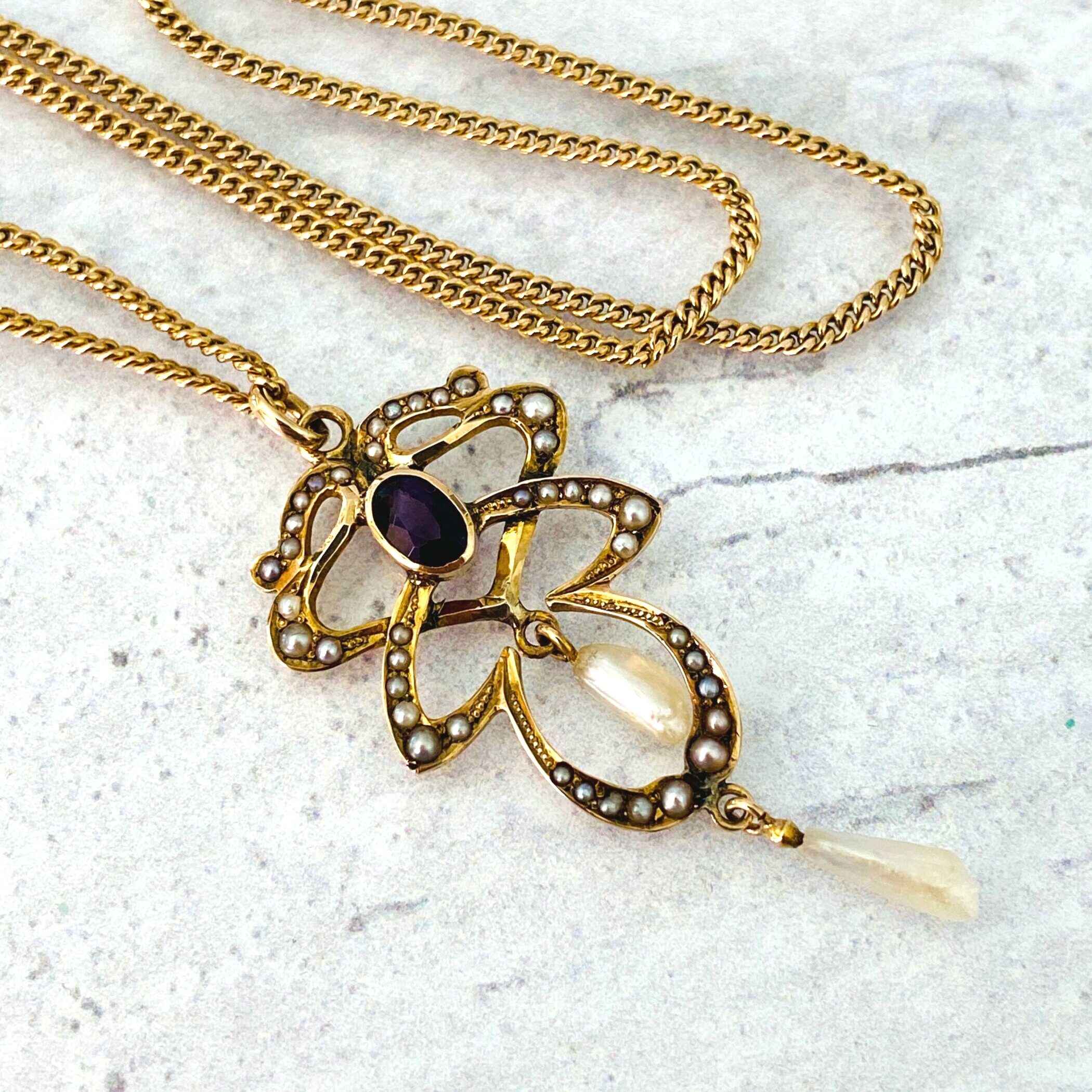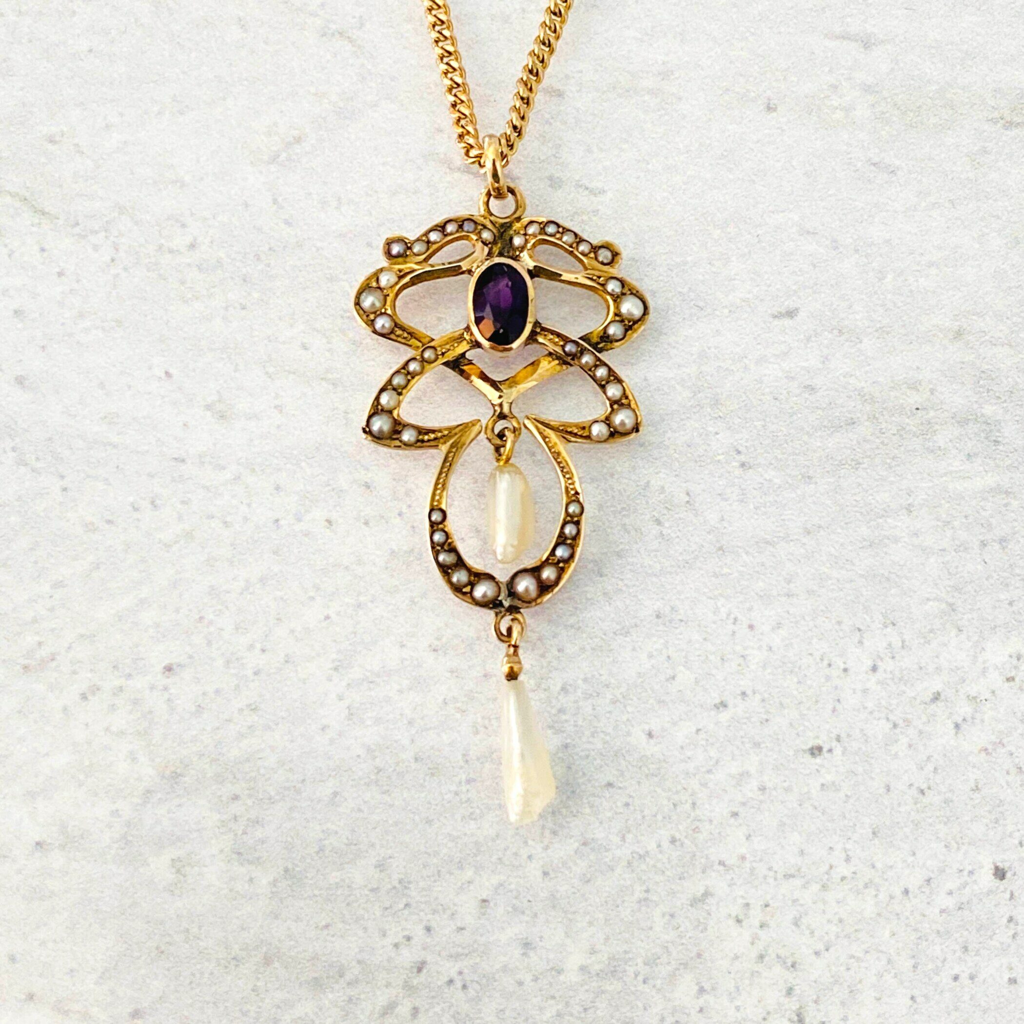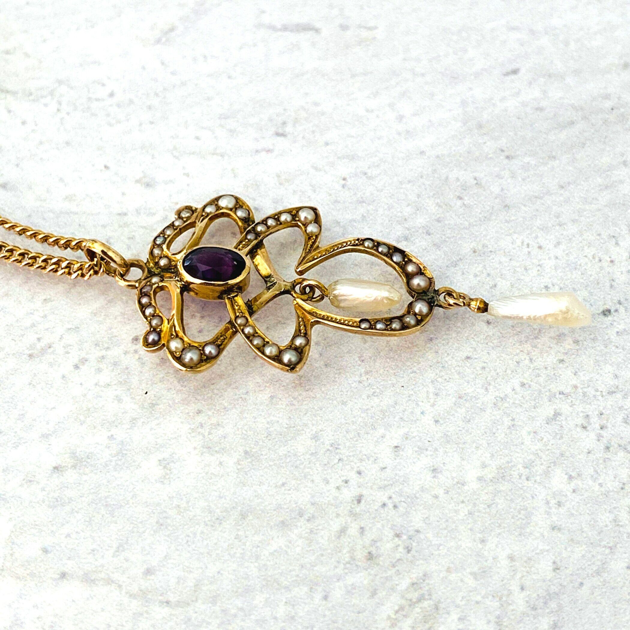A lovely antique Art Nouveau lavalier necklace set with an oval faceted garnet and adorned with natural (not cultured) pearls.