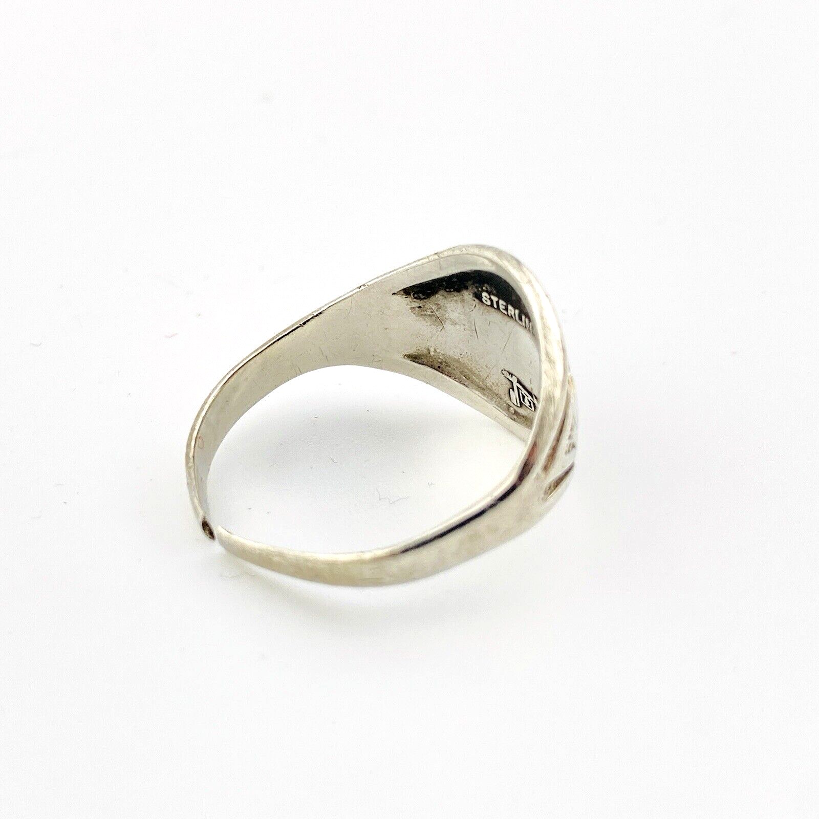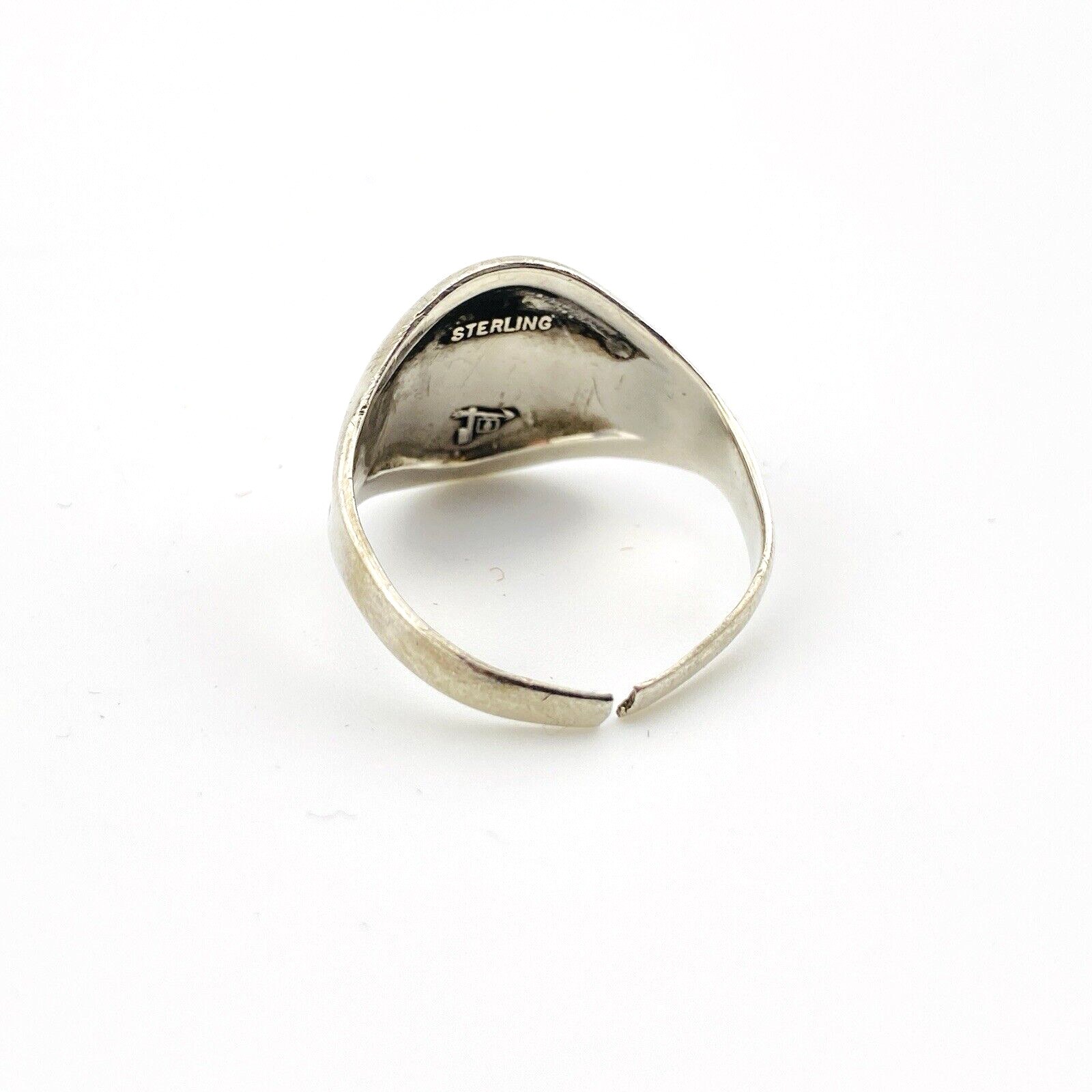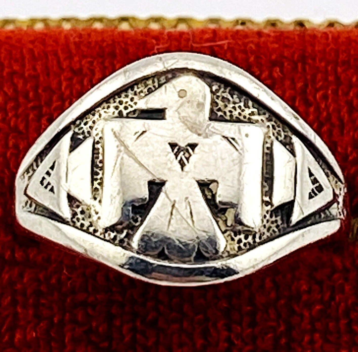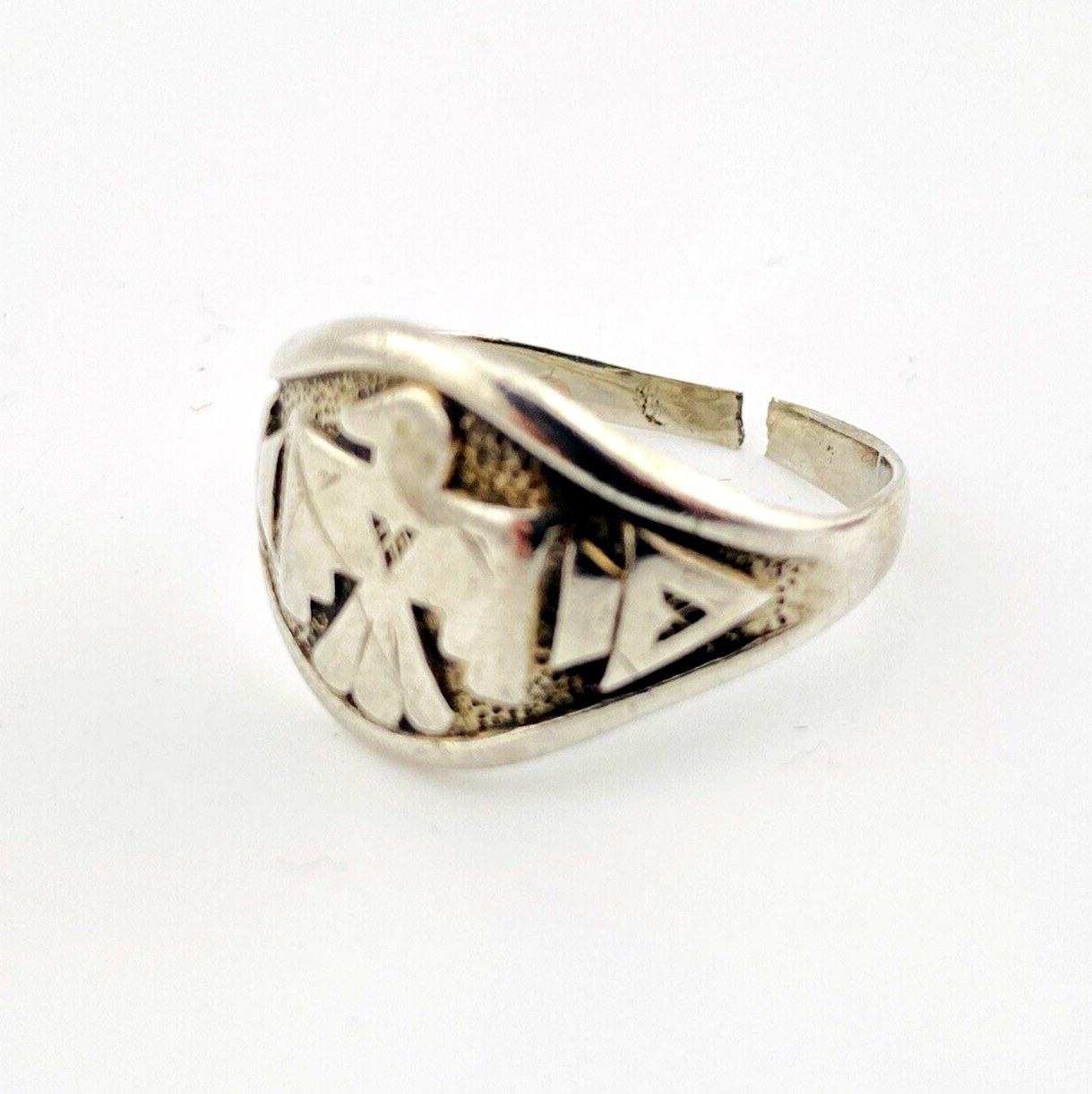 A well-loved vintage Bell Trading Post cigar band thunderbird sterling silver ring. Currently size 8 , it is adjustable due to the split shank. It can be worn as is or sized.