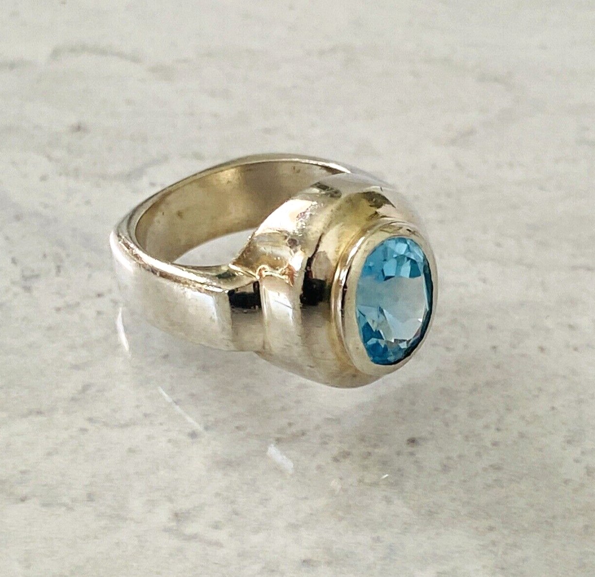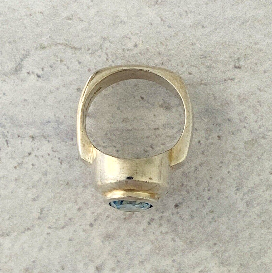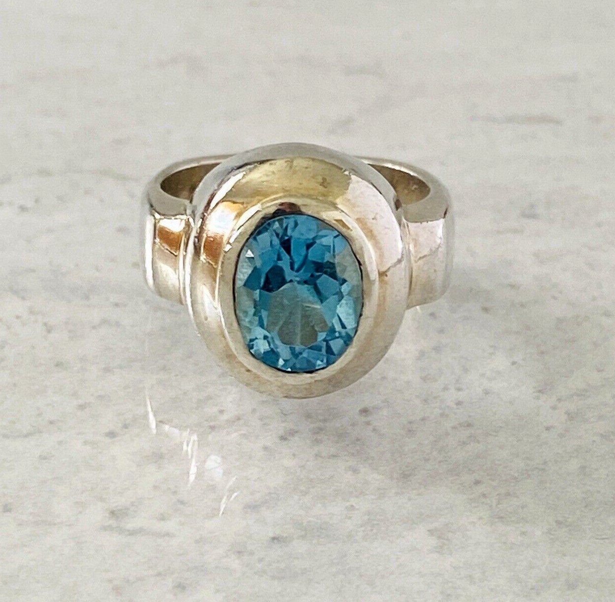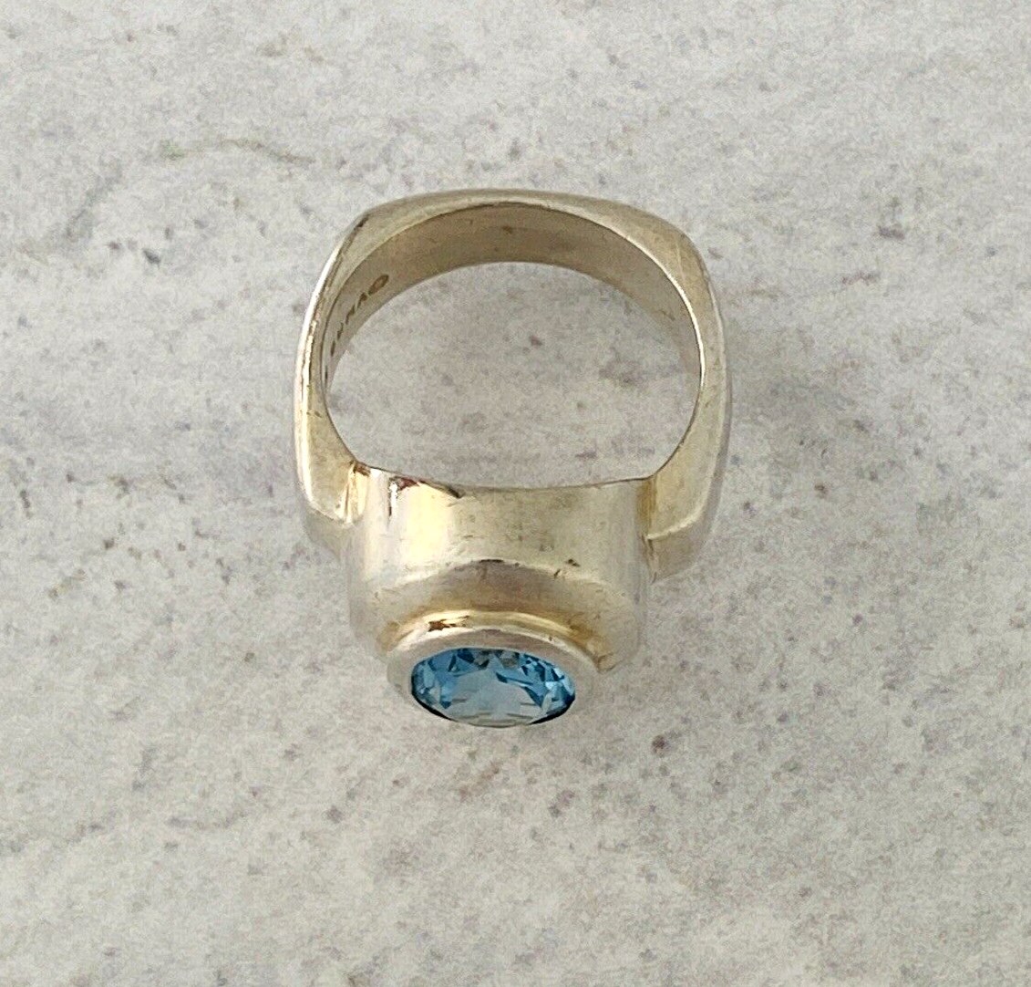 A striking vintage Modernist ring by BOMA, featuring a vivid 3.4ct Swiss Blue topaz set in a sculptural sterling silver design with a distinctive square shank. Substantial at 9.3 grams, it balances bold presence with clean studio lines. Signed 925 BOMA ©, this 1990s piece is beautifully crafted and in excellent condition with only light wear from age. Any dark areas in the photos are ambient reflections on the polished silver.