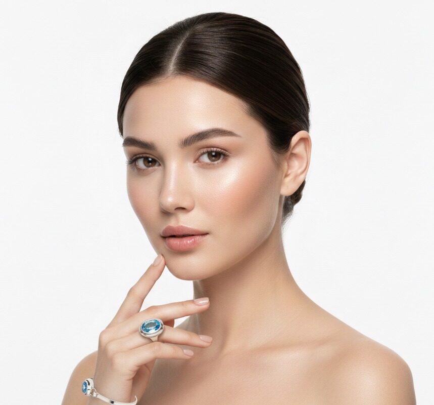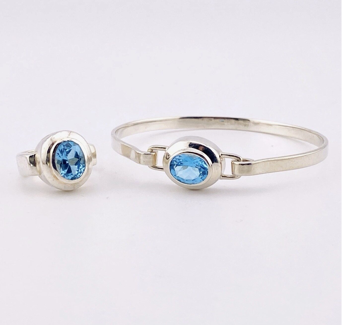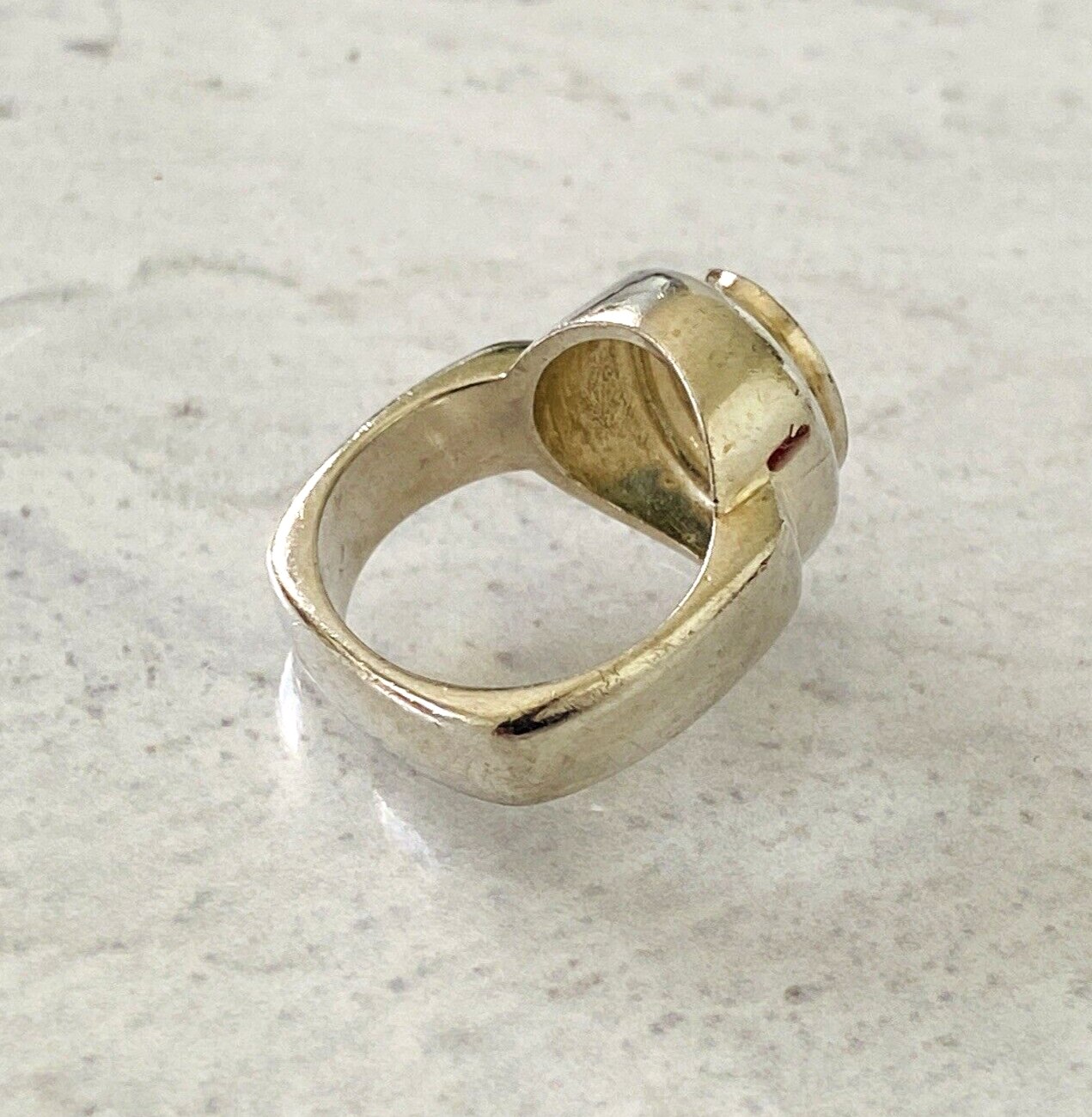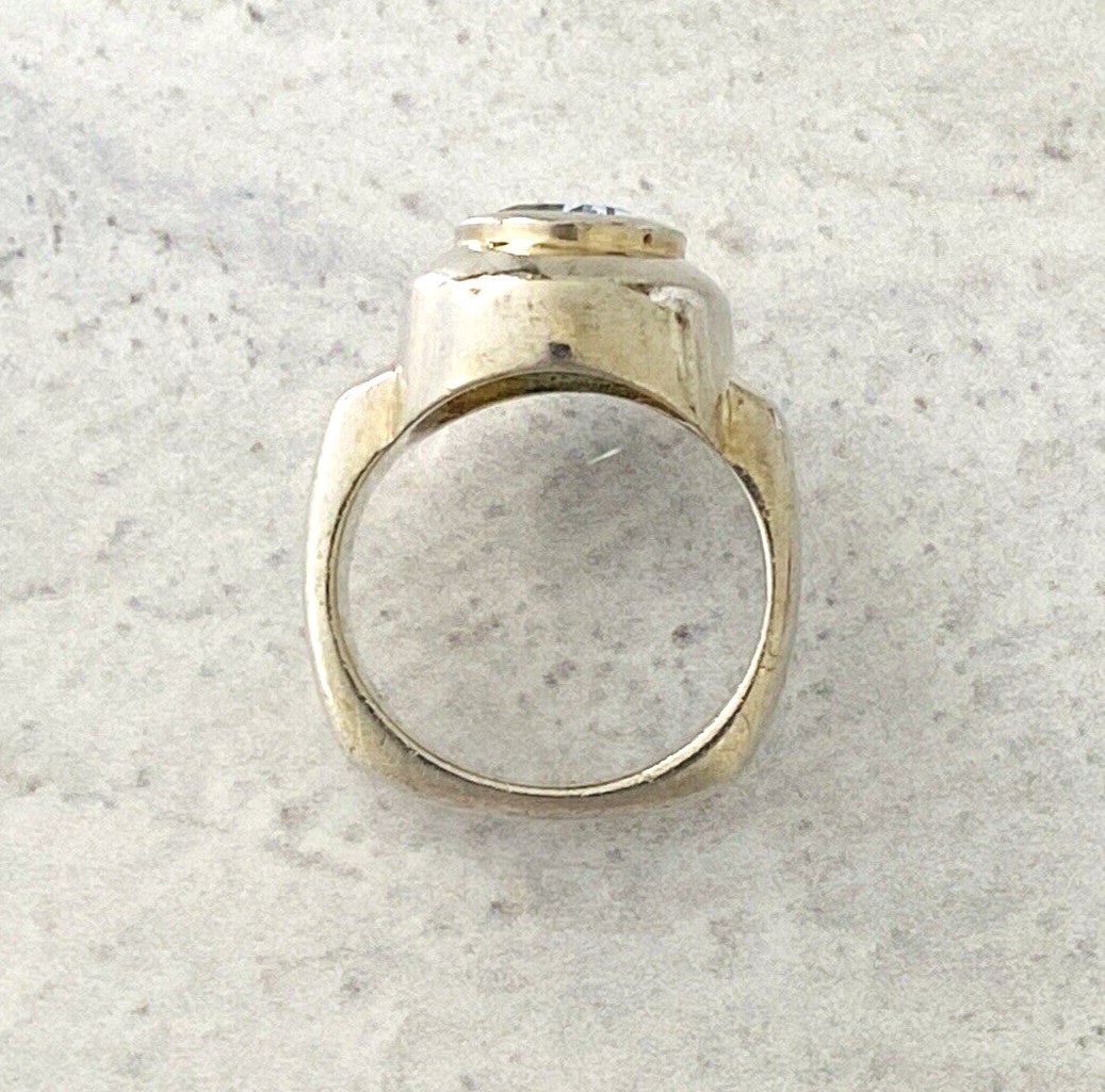 A striking vintage Modernist ring by BOMA, featuring a vivid 3.4ct Swiss Blue topaz set in a sculptural sterling silver design with a distinctive square shank. Substantial at 9.3 grams, it balances bold presence with clean studio lines. Signed 925 BOMA ©, this 1990s piece is beautifully crafted and in excellent condition with only light wear from age. Any dark areas in the photos are ambient reflections on the polished silver.