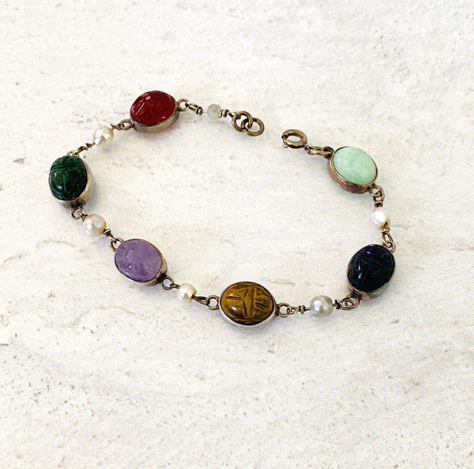 Carved Gemstone Scarab Sterling Silver Bracelet Wire Wrapped Cultured Pearls – Vintage 1960s