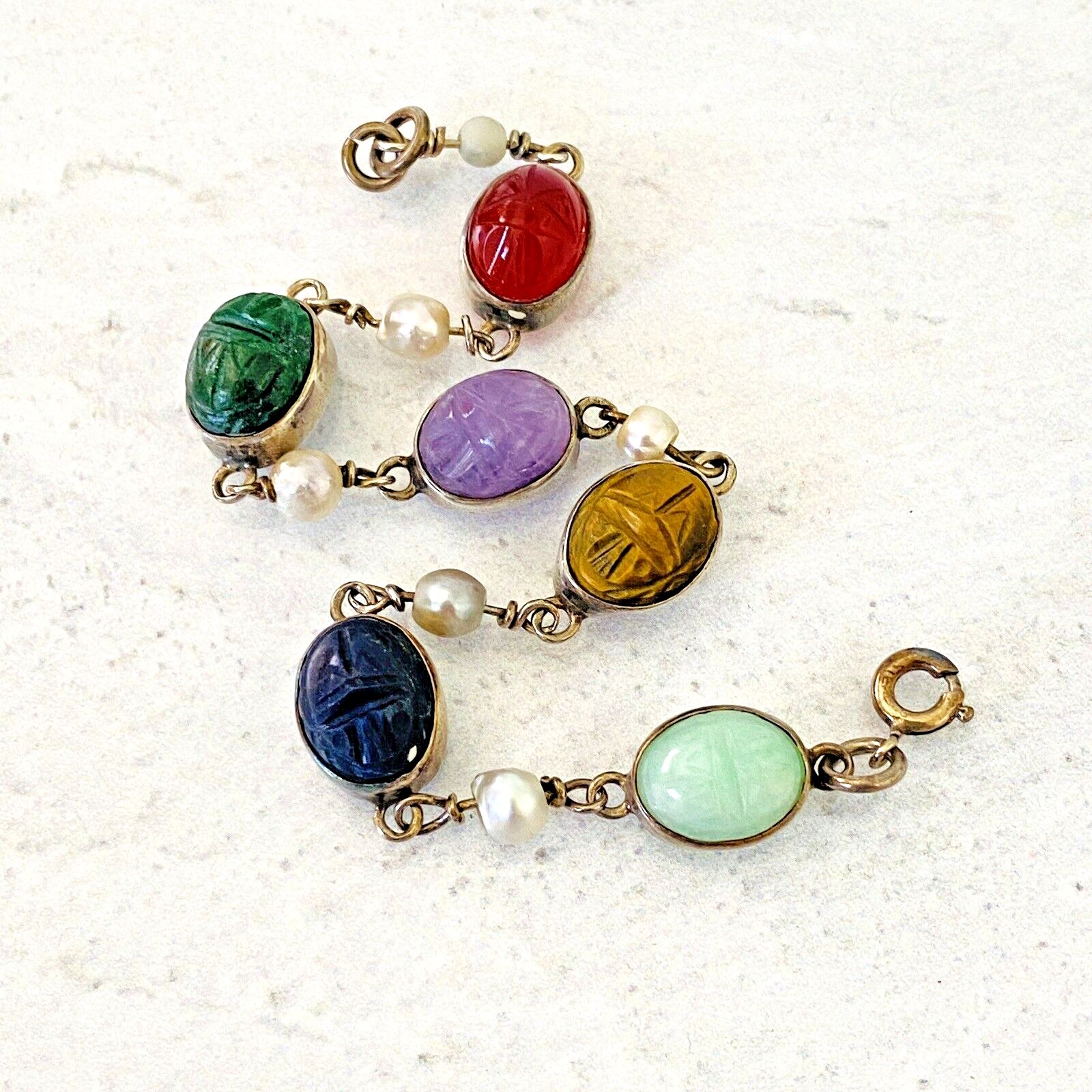 Six carved stone scarabs are connected by wirewrapped cultured pearls. The stones are: