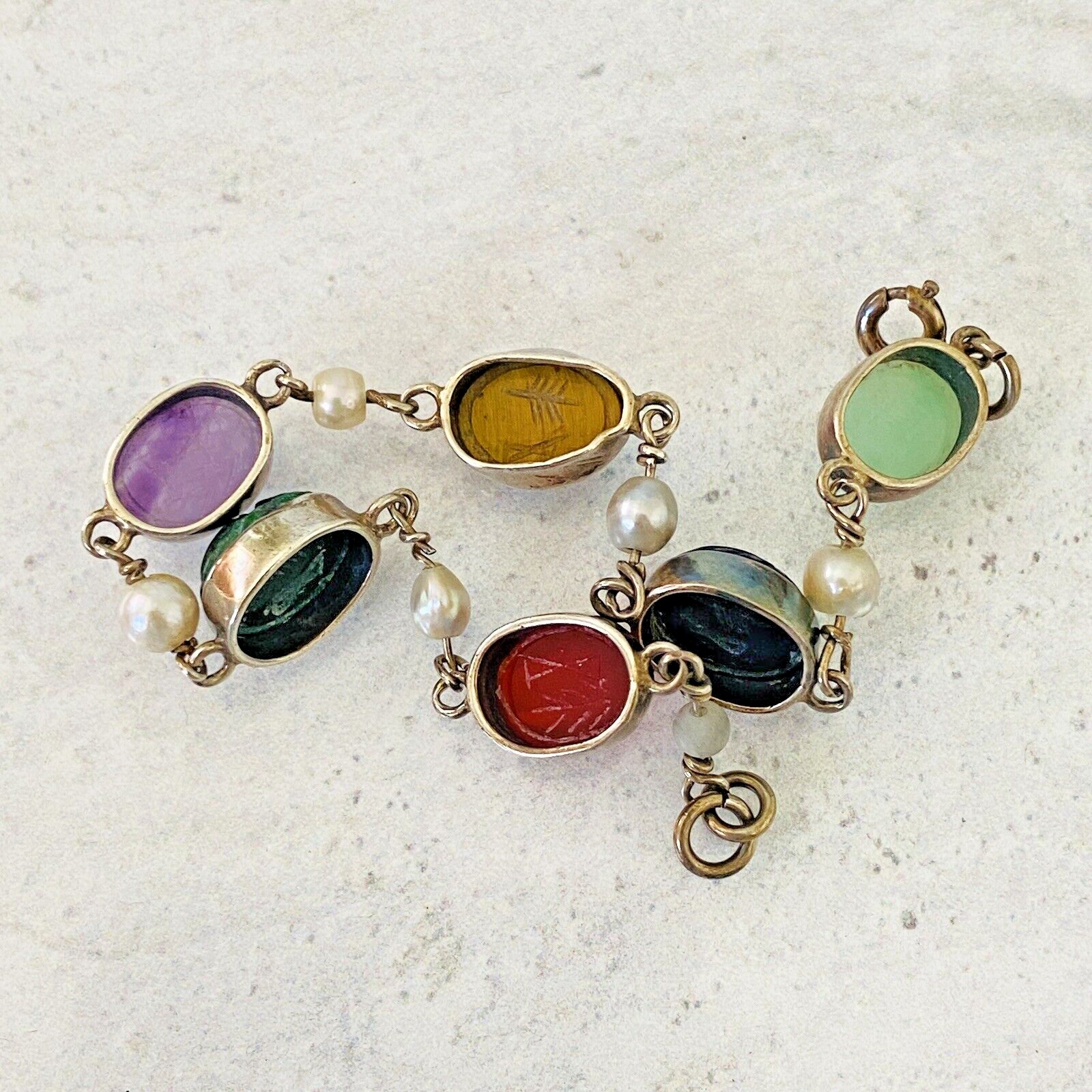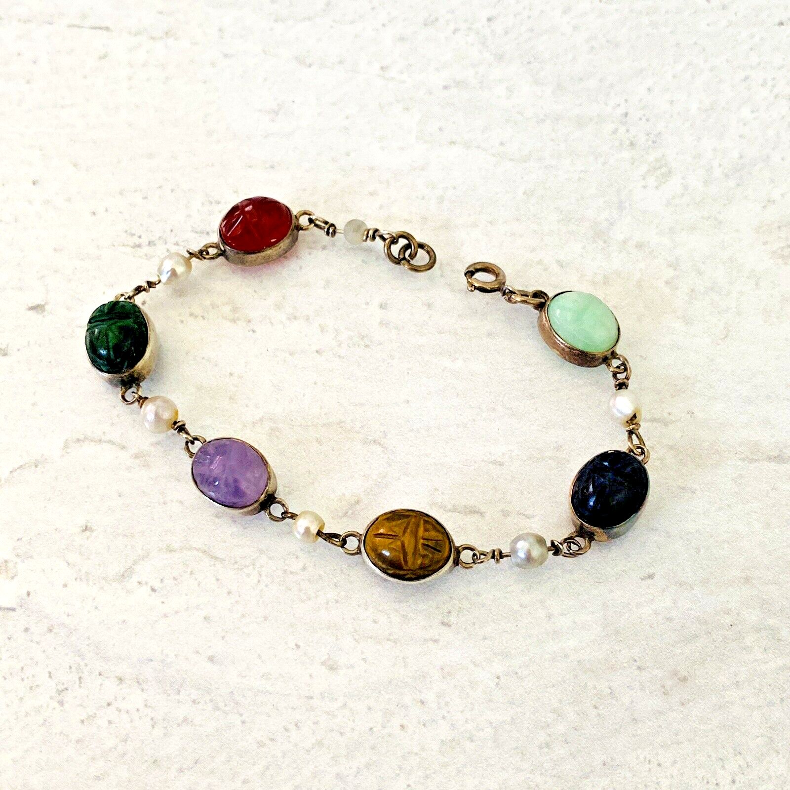 In excellent condition, no damage to the carved stone scarabs or the cultured pearls.