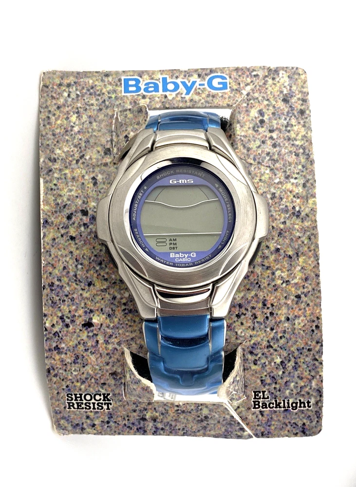 An unworn Y2K-era Casio Baby-G G-MS watch in matte silver stainless steel, complete with original tags, protective plastic, and presentation materials — a true new old stock (NOS) example.