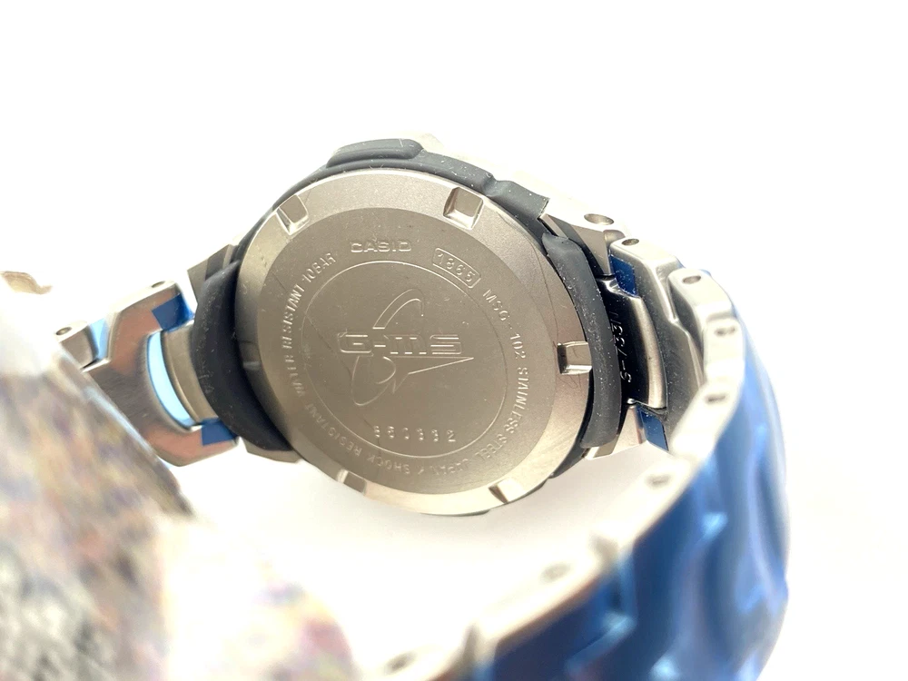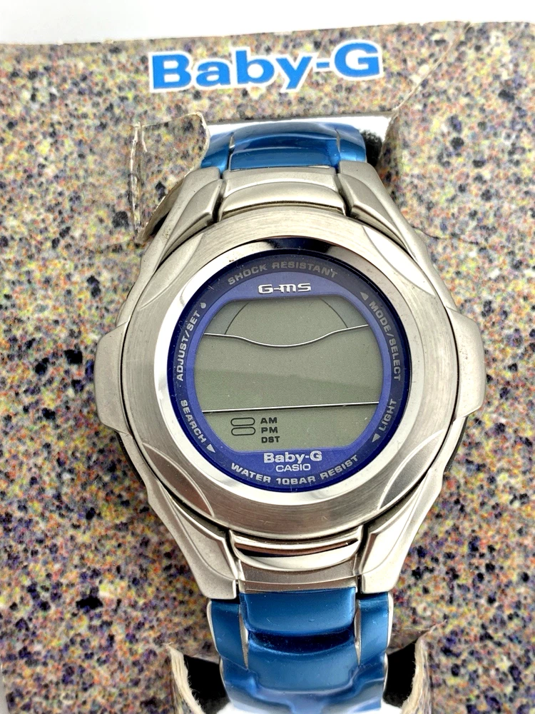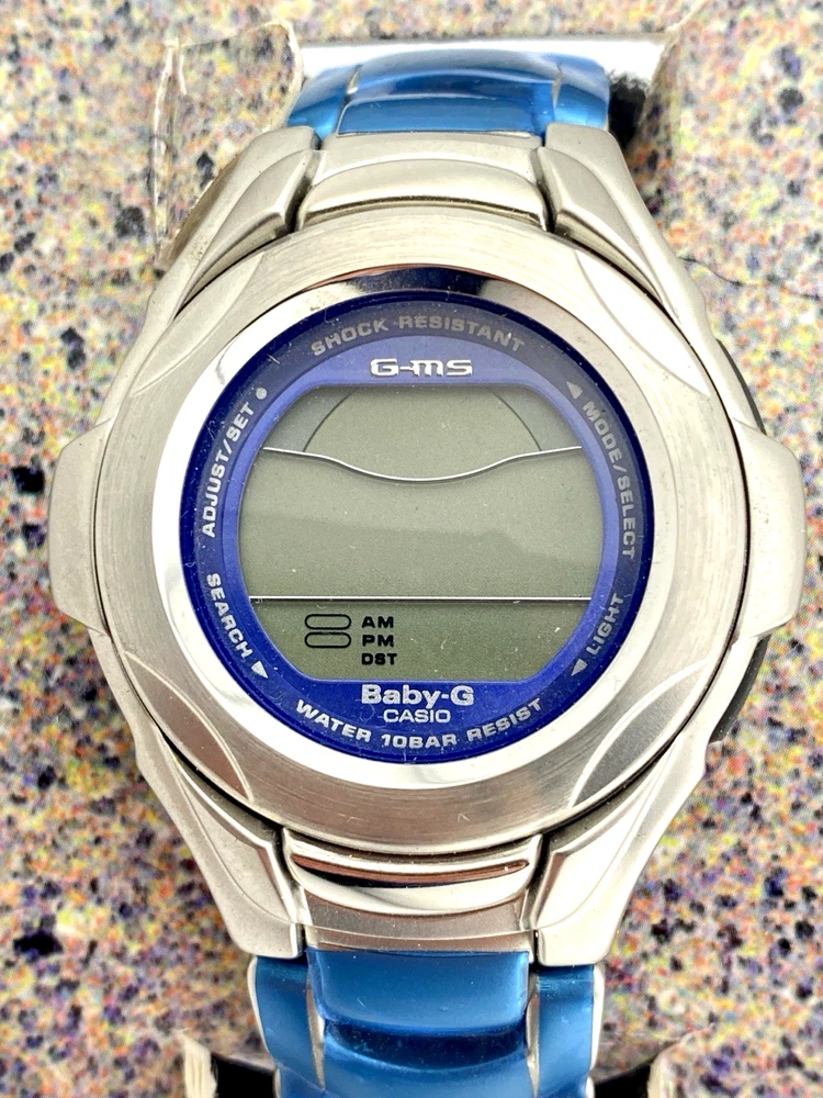 This Casio Baby-G G-MS (MSG-102) model reflects the bold, technical aesthetic of early 2000s design, featuring a streamlined matte silver-tone stainless steel case and matching stainless steel bracelet with a classic digital display.