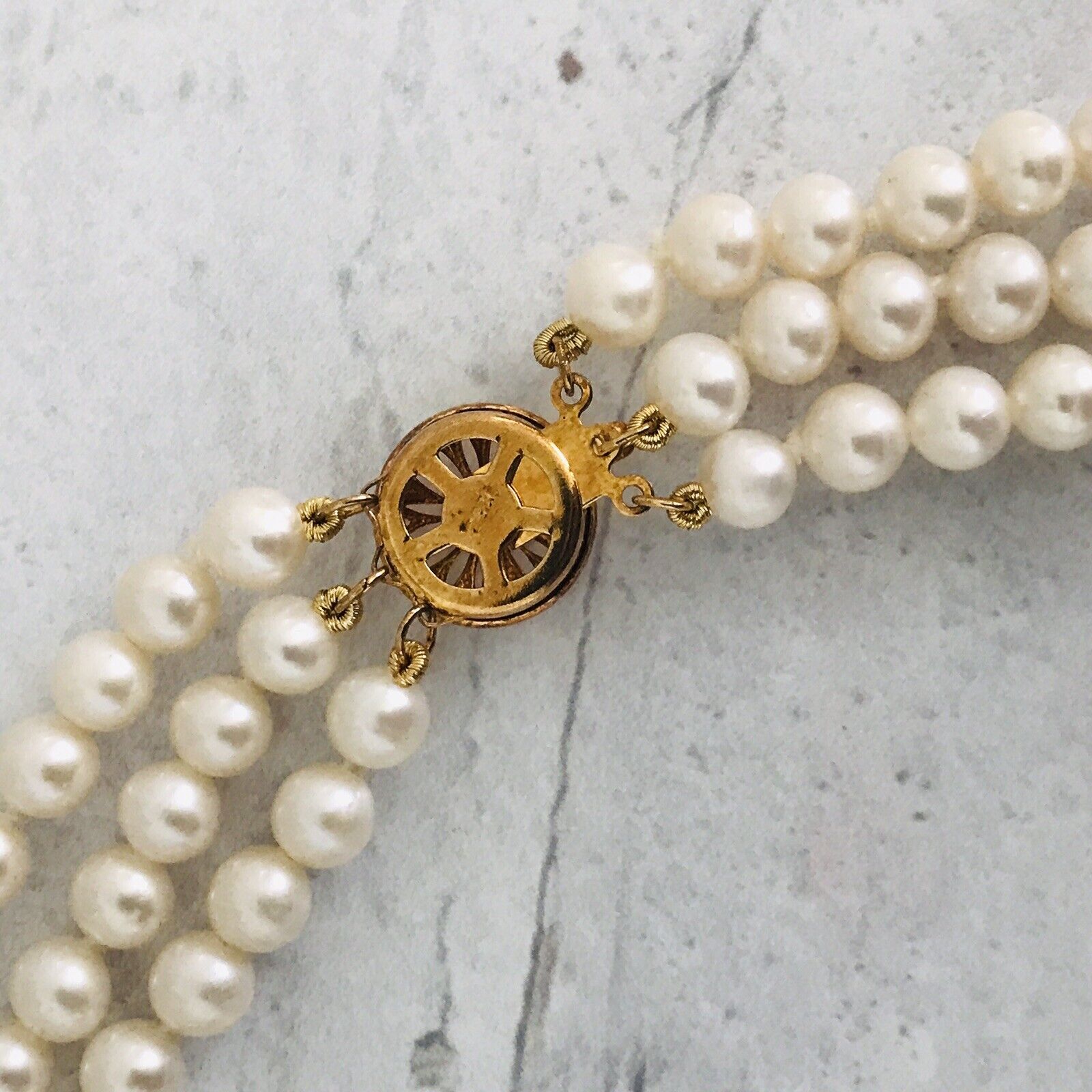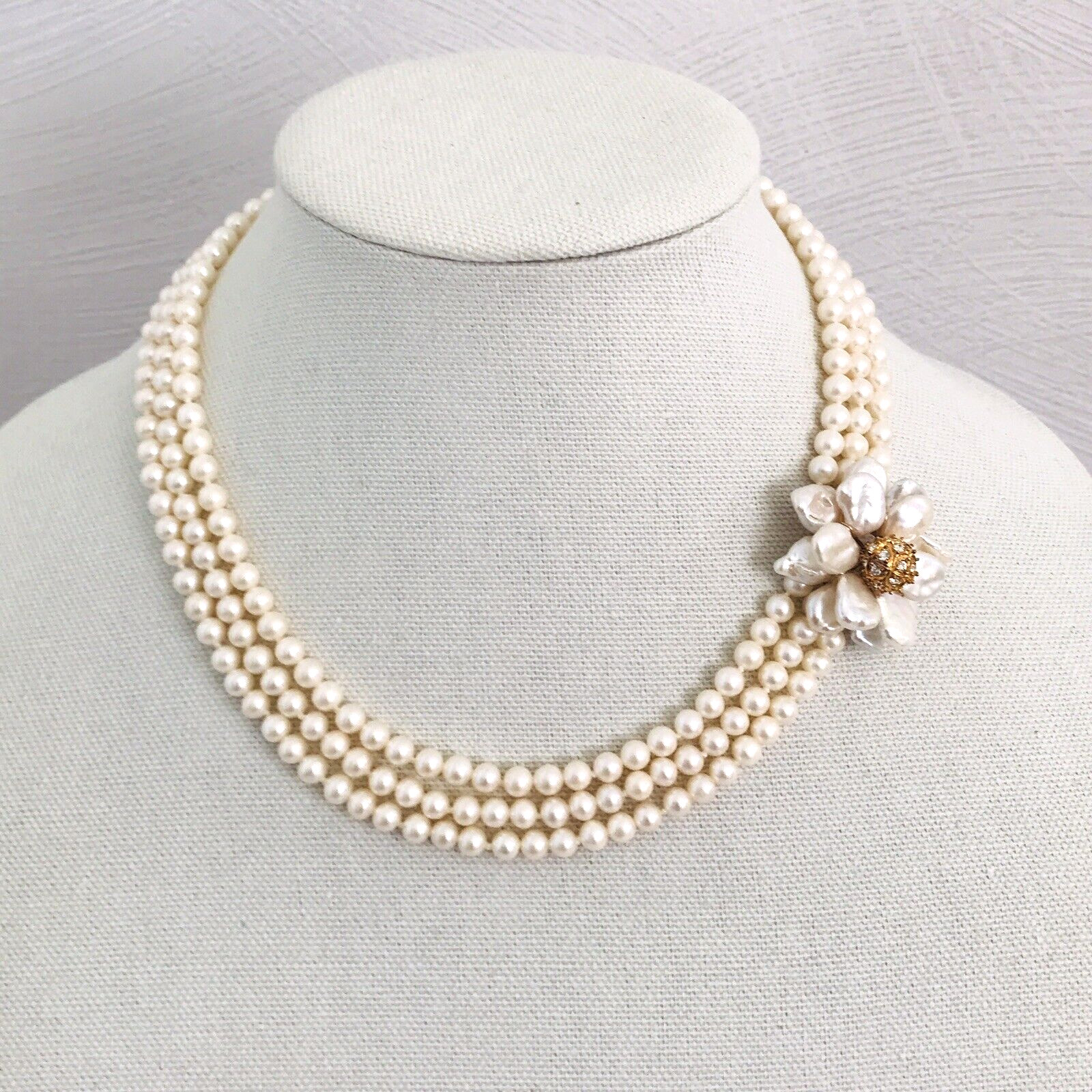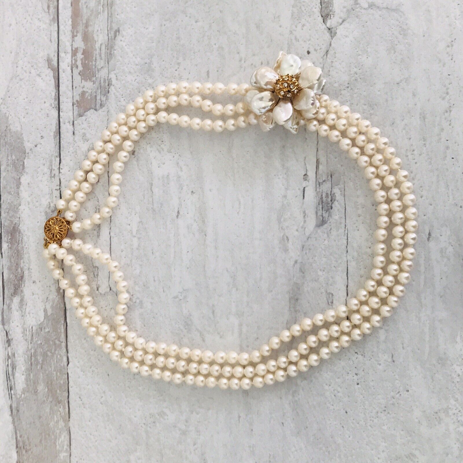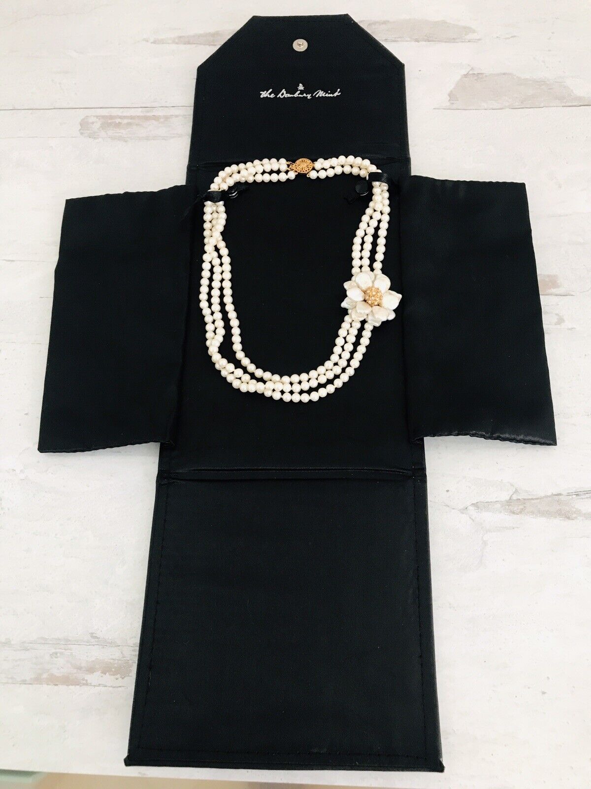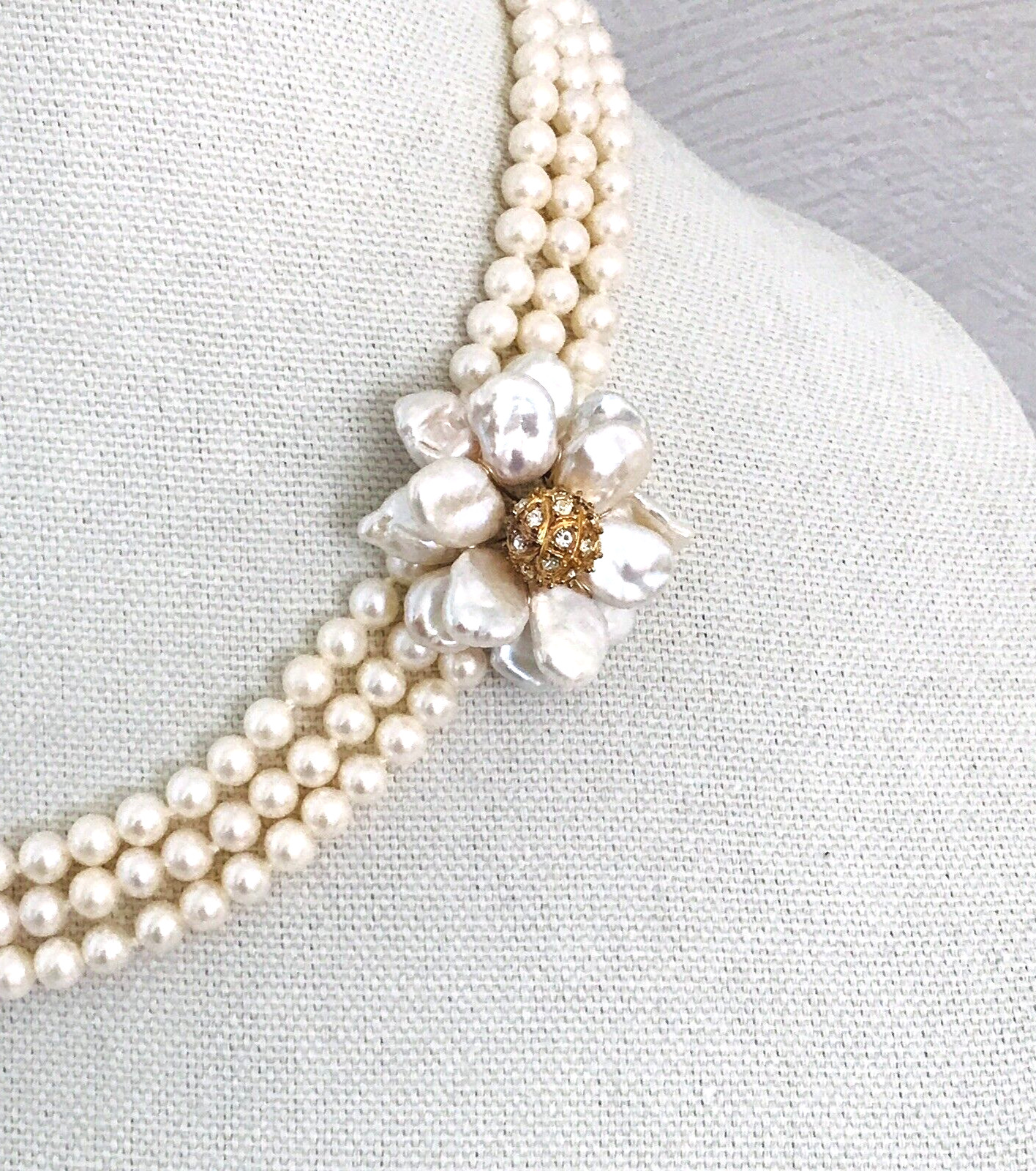 Danbury Mint Triple Strand Cultured Pearl Necklace w Akoya Pearl Flower Sterling