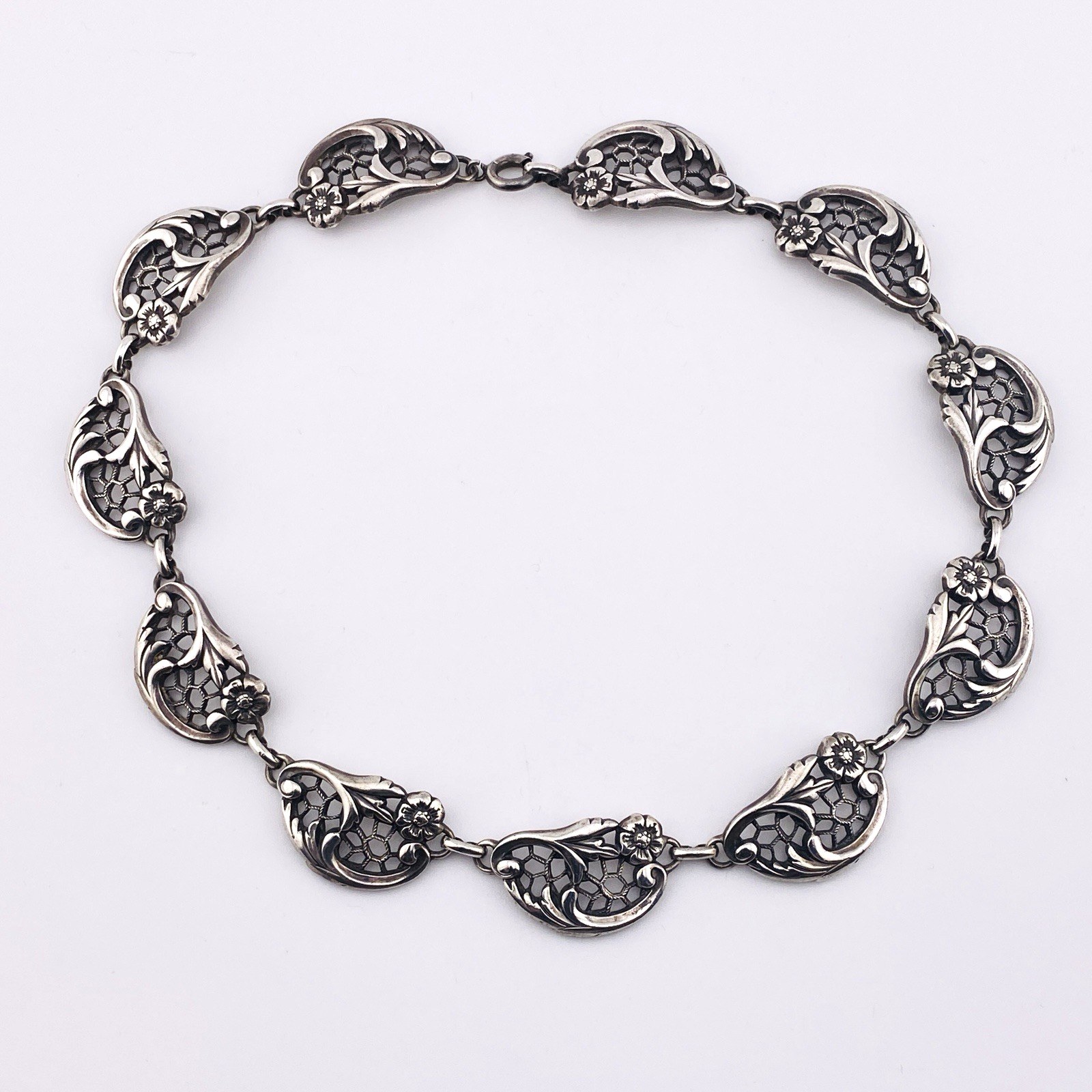 Unveil your inner elegance with this Danecraft Art Deco floral filigree necklace and earrings set in sterling silver.