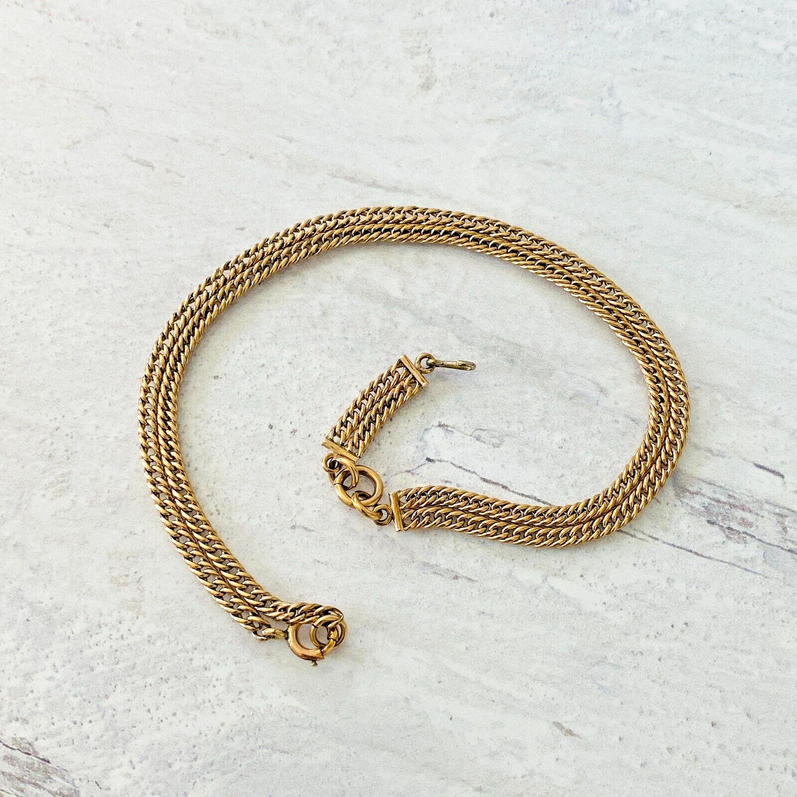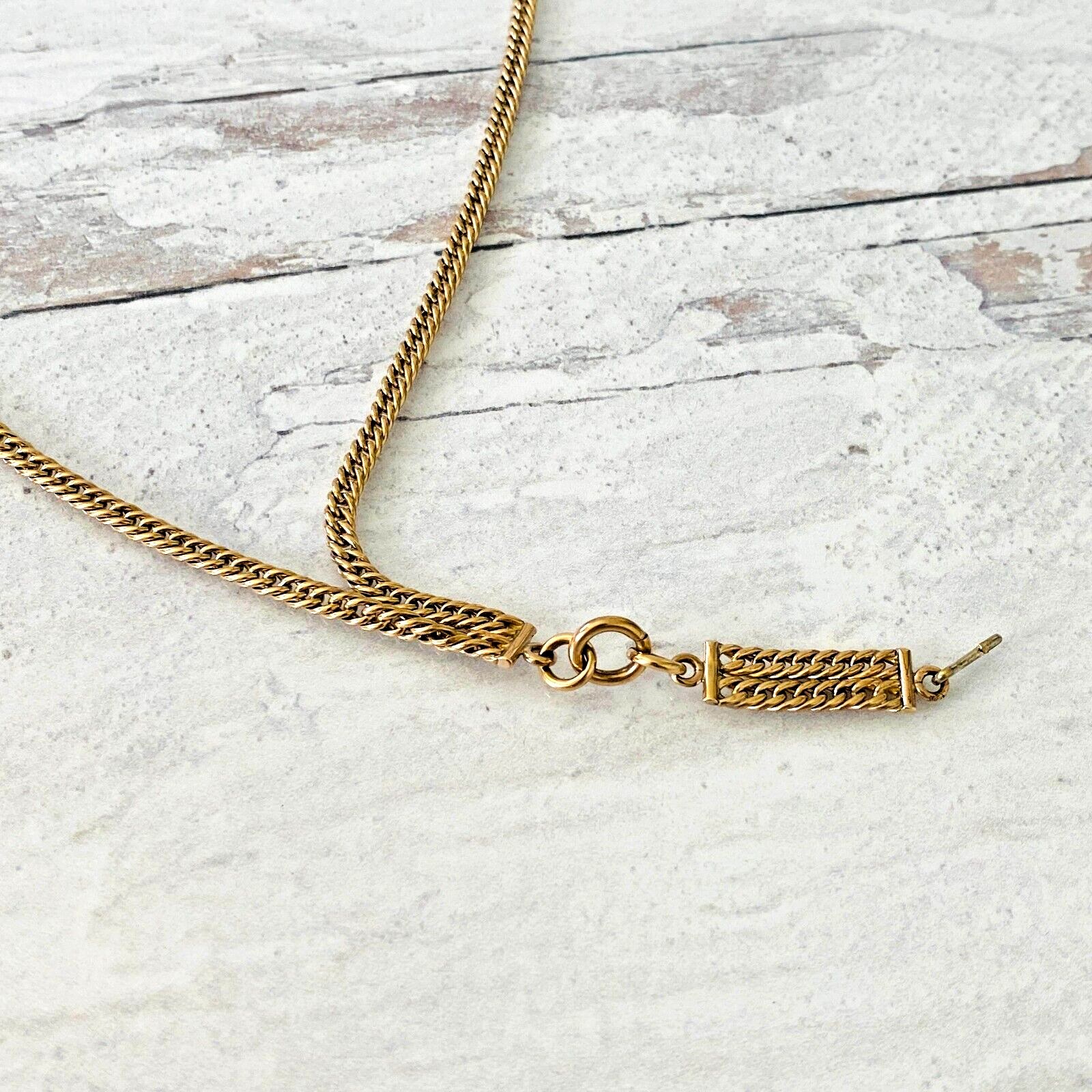 This gorgeous Y-chain necklace is from the Art Deco era. Made of yellow gold filled. The chain is sectioned and the sections are connected by a bar at the center.