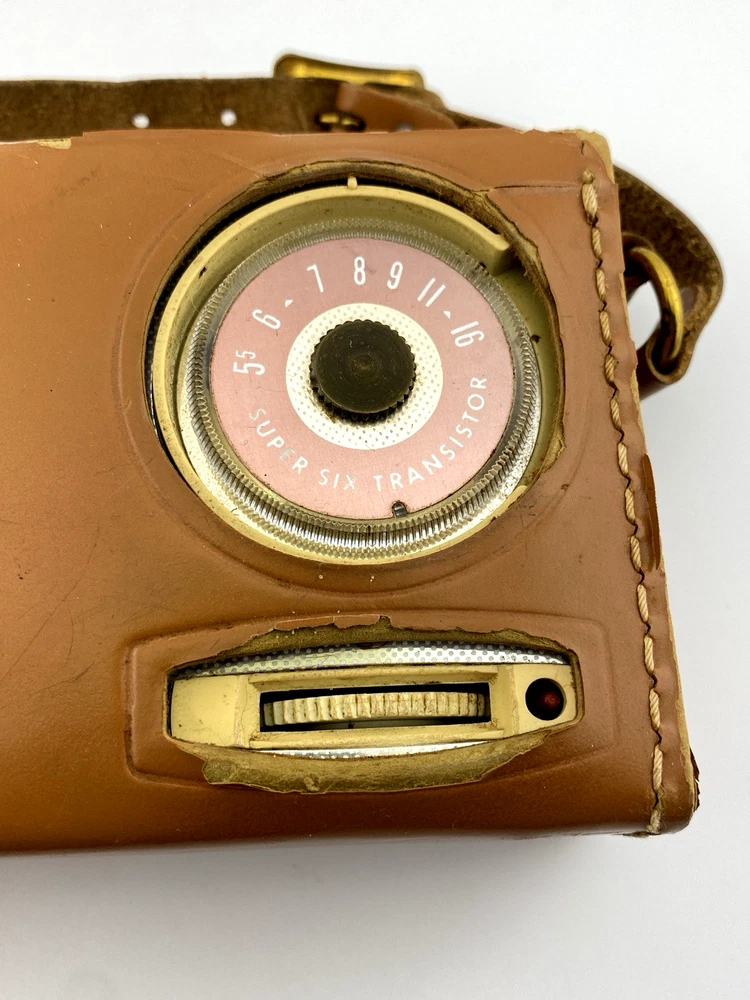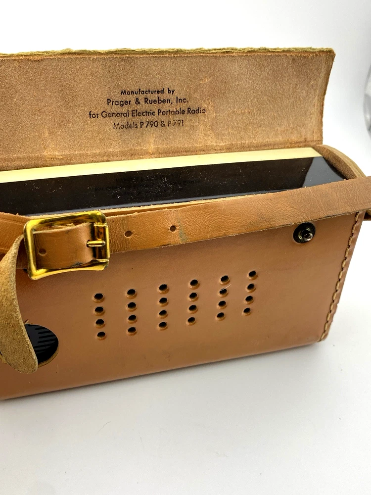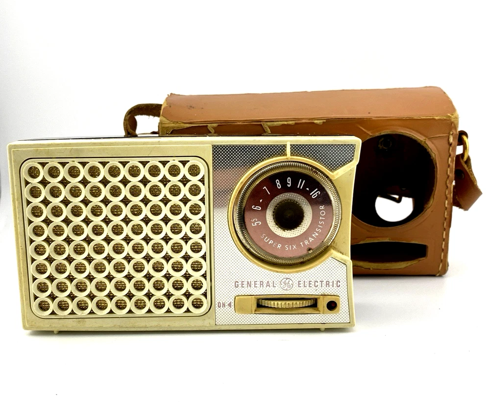 A classic mid-century General Electric “Super Six” transistor radio, model P790B, presented with its original case.