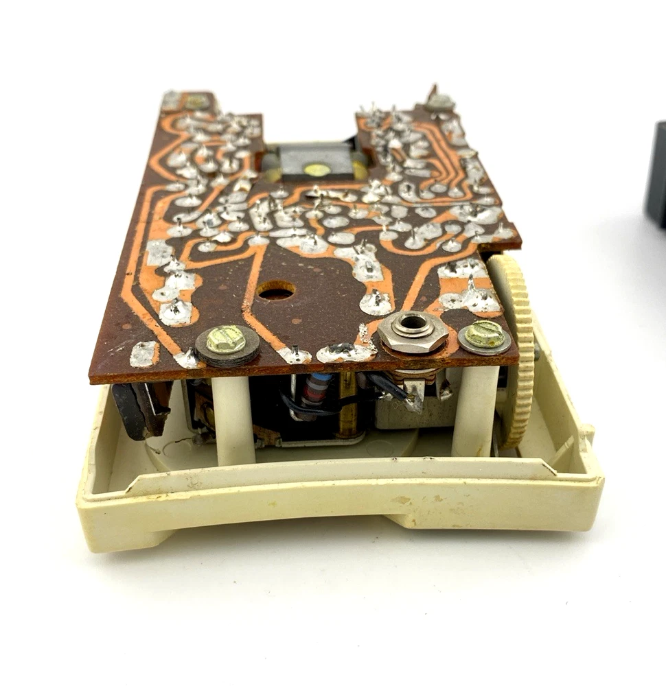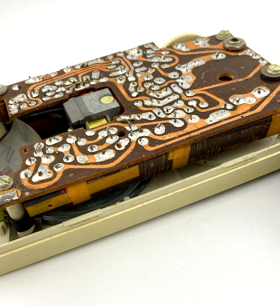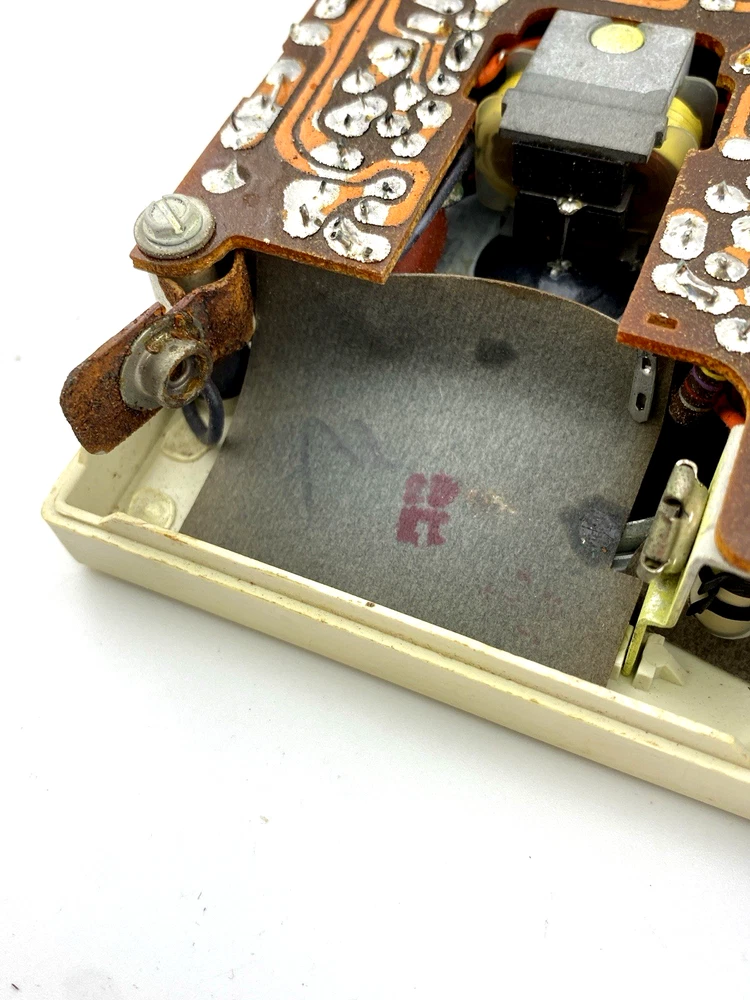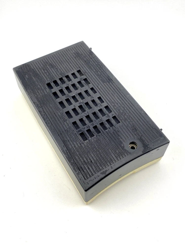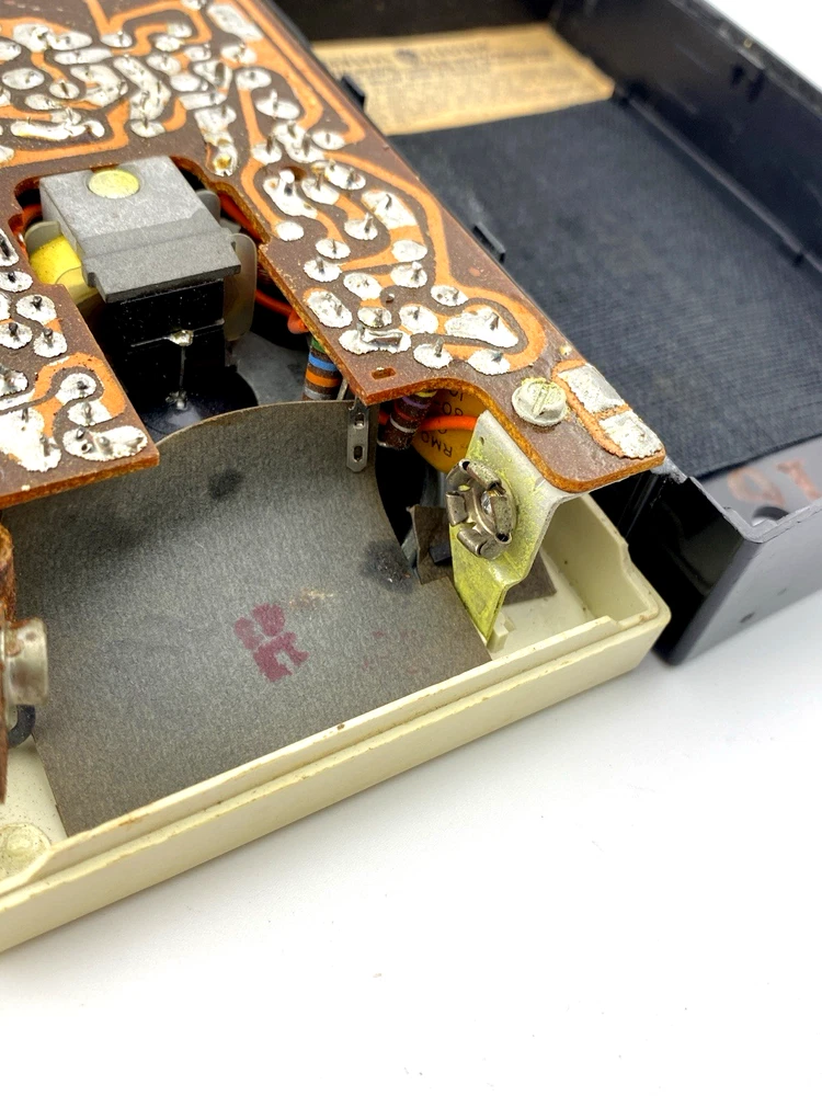 The radio remains visually well preserved, with a clean interior including the battery compartment and connectors showing no visible corrosion. The original case is included, adding to its vintage appeal.