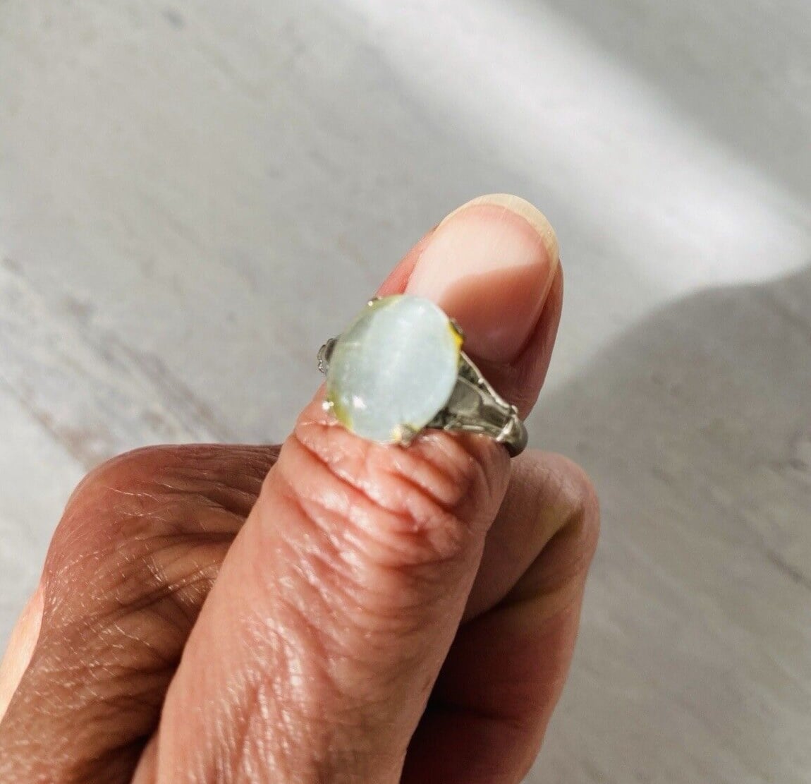 The oval opal cabochon measures 1/2 inch (12mm) by 3/8 inch (10mm). It has an excellent play of light. This type of moonstone glows in the direct light but does not change color.