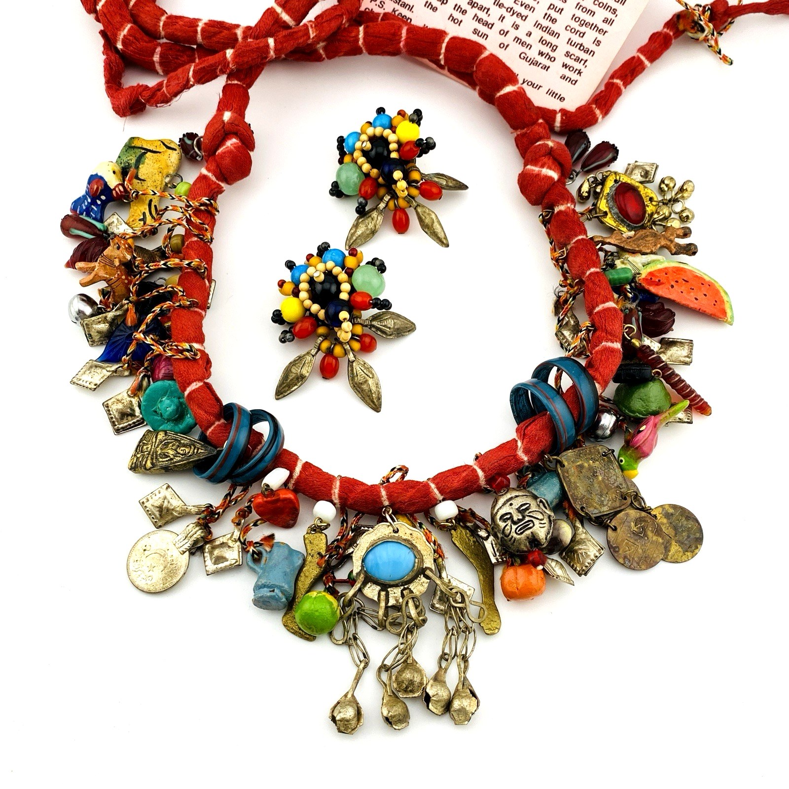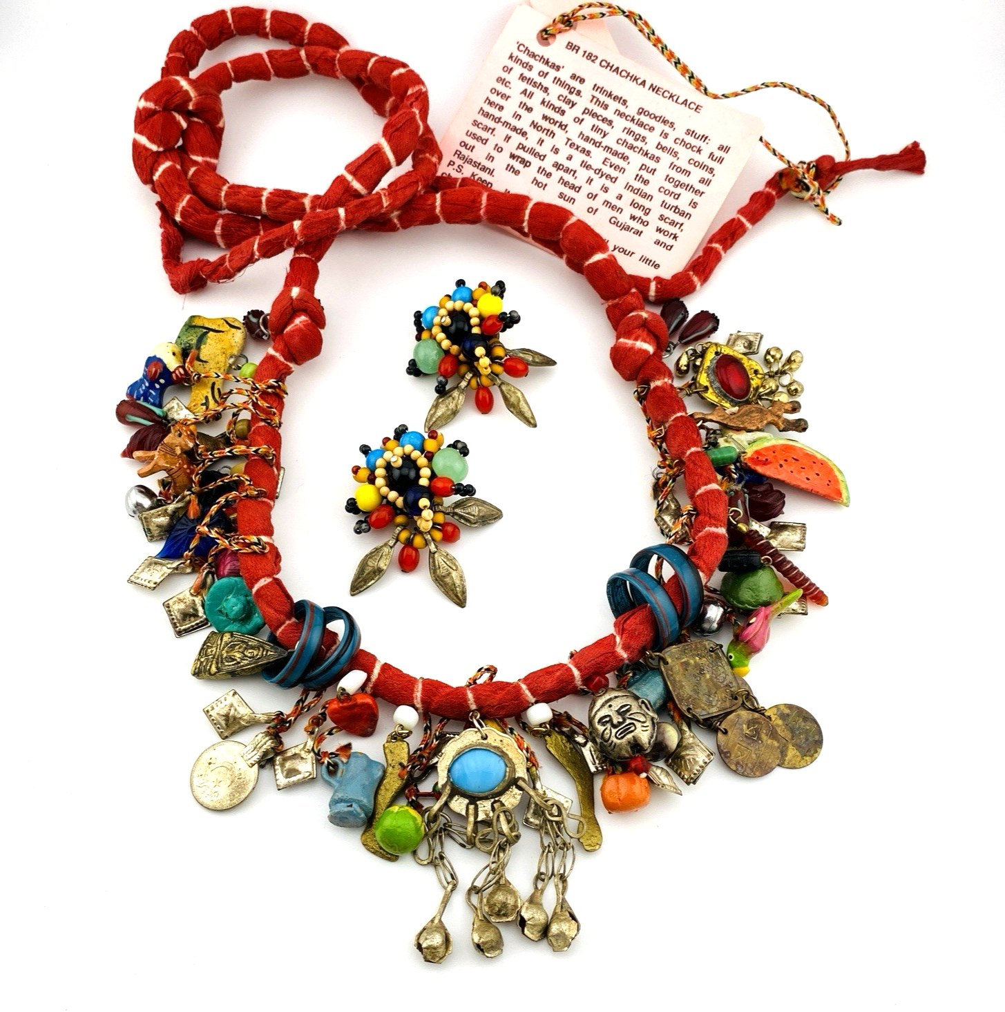 Handcrafted Charm Necklace Loaded with Worldwide Milagros, Charms, and Chachkas from around the World – So Cheerful – Matching Clip Earrings Included