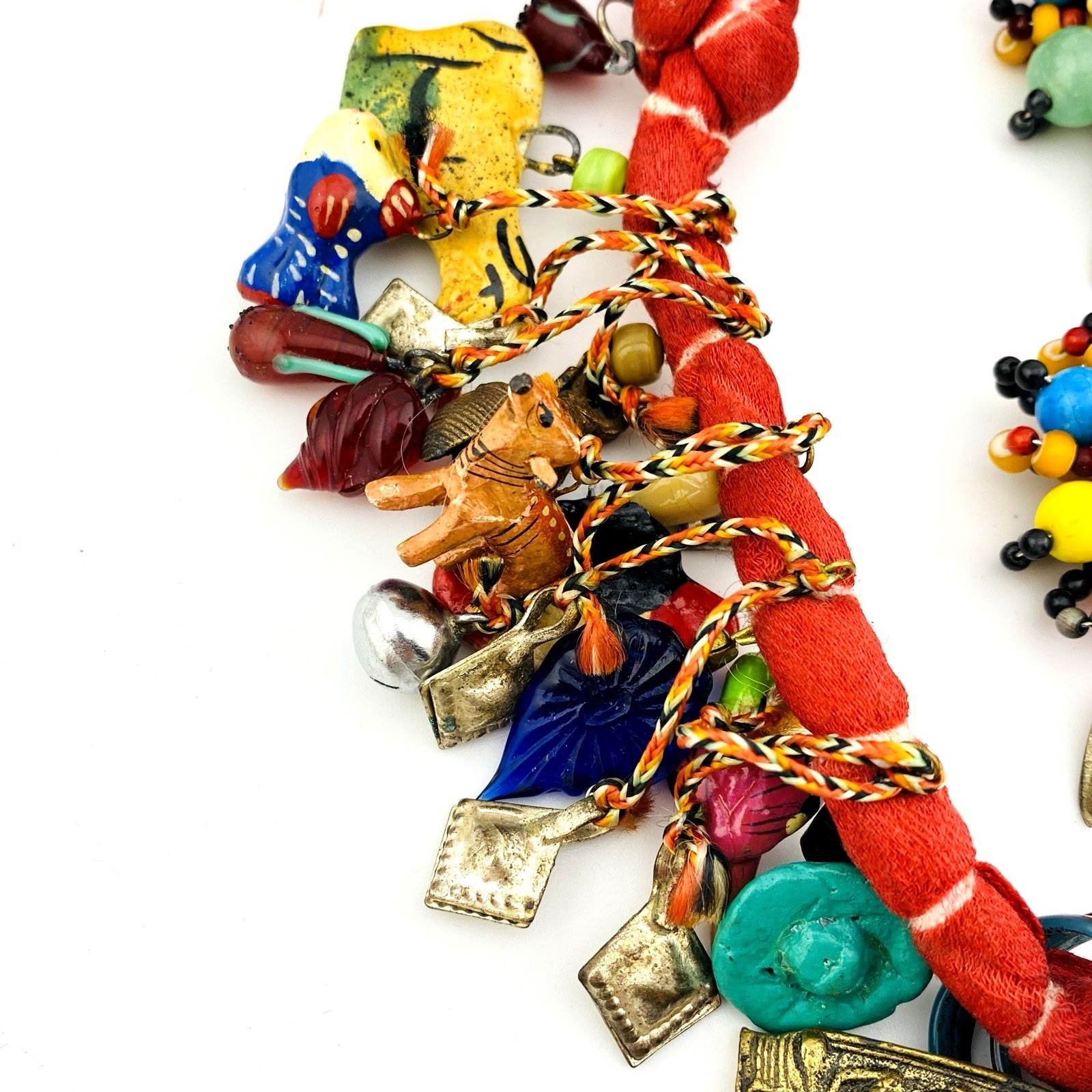 It is in excellent condition, unworn, and still has the original paper tag with the design’s history. Made from handmade items from around the world, an incredible collection of small charms, including geometric shapes, miniature animals, household items, and fruit slices. You’ll be delighted by the workmanship and ingenuity in this necklace. It is 56 inches long, and it can be worn as a belt tied around the waist.