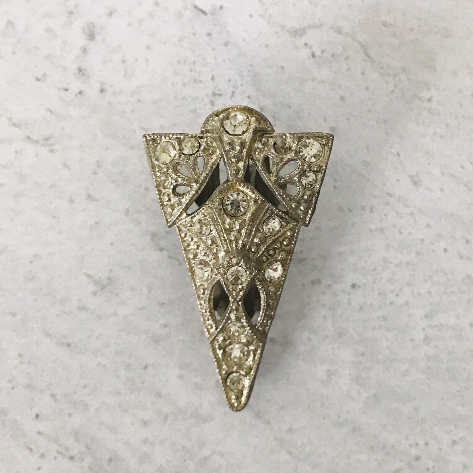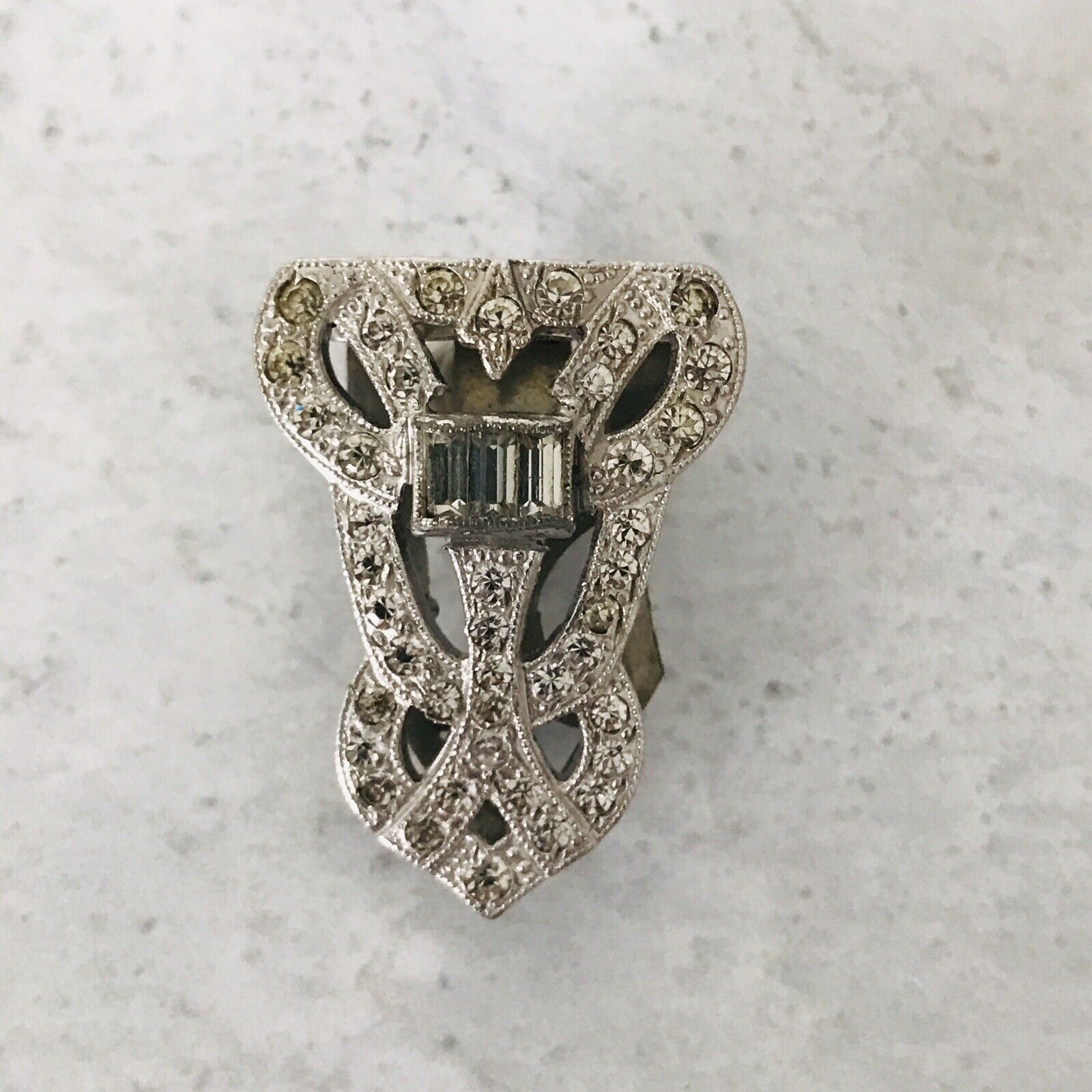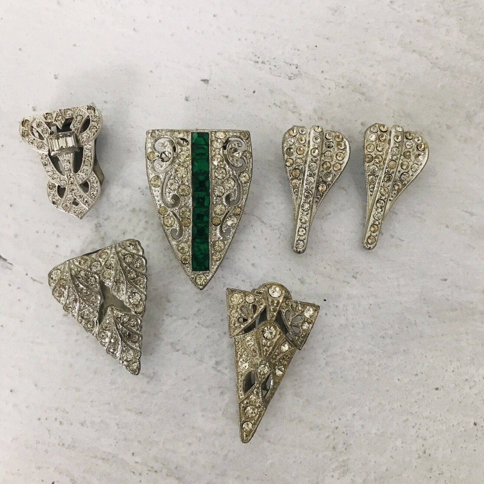 Lot of 6 Art Deco Pot Metal Dress Clips For Restoration Repair or RepurposeThese great pieces deserve to be repaired and live on! Excellent examples of true Art Deco period dress clips. Beautiful designs and excellent quality. These are easy repairs, just replace the missing rhinestones. All the clasps work well and plating is great shape.They range in size from 1 5/8″ tall (with green stones) to 1 3/8″. One style is a pair and is marked CA inside squares. They date from the 1930s to the 1950s. Please see photos for details and email us any questions. Sold as is. Thank you for your interest!