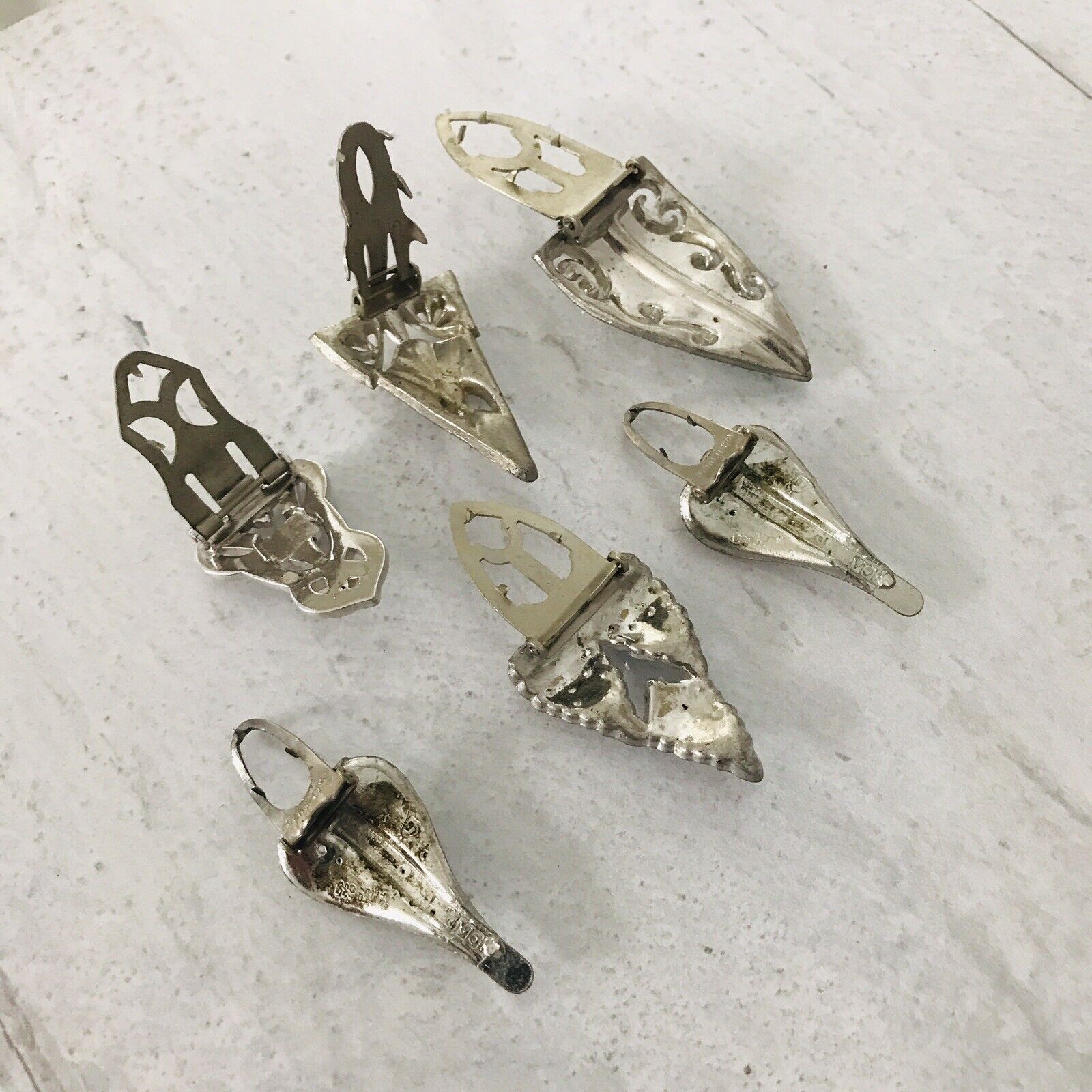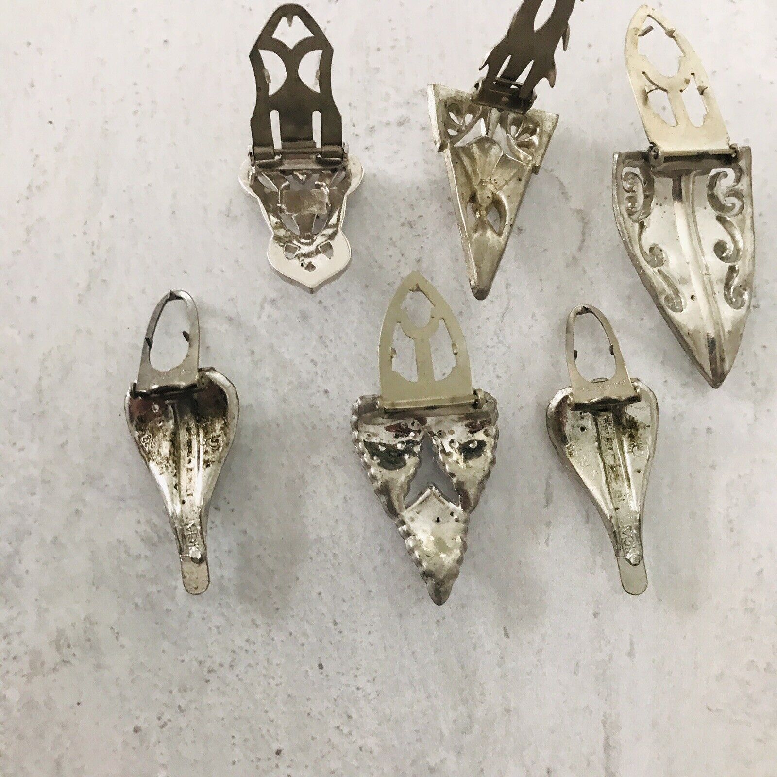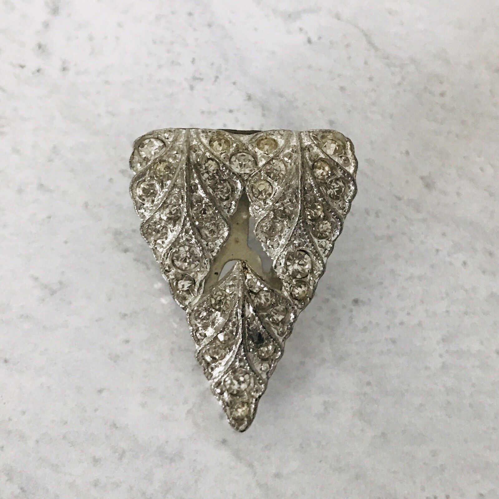 Lot of 6 Art Deco Pot Metal Dress Clips For Restoration Repair or RepurposeThese great pieces deserve to be repaired and live on! Excellent examples of true Art Deco period dress clips. Beautiful designs and excellent quality. These are easy repairs, just replace the missing rhinestones. All the clasps work well and plating is great shape.They range in size from 1 5/8″ tall (with green stones) to 1 3/8″. One style is a pair and is marked CA inside squares. They date from the 1930s to the 1950s. Please see photos for details and email us any questions. Sold as is. Thank you for your interest!