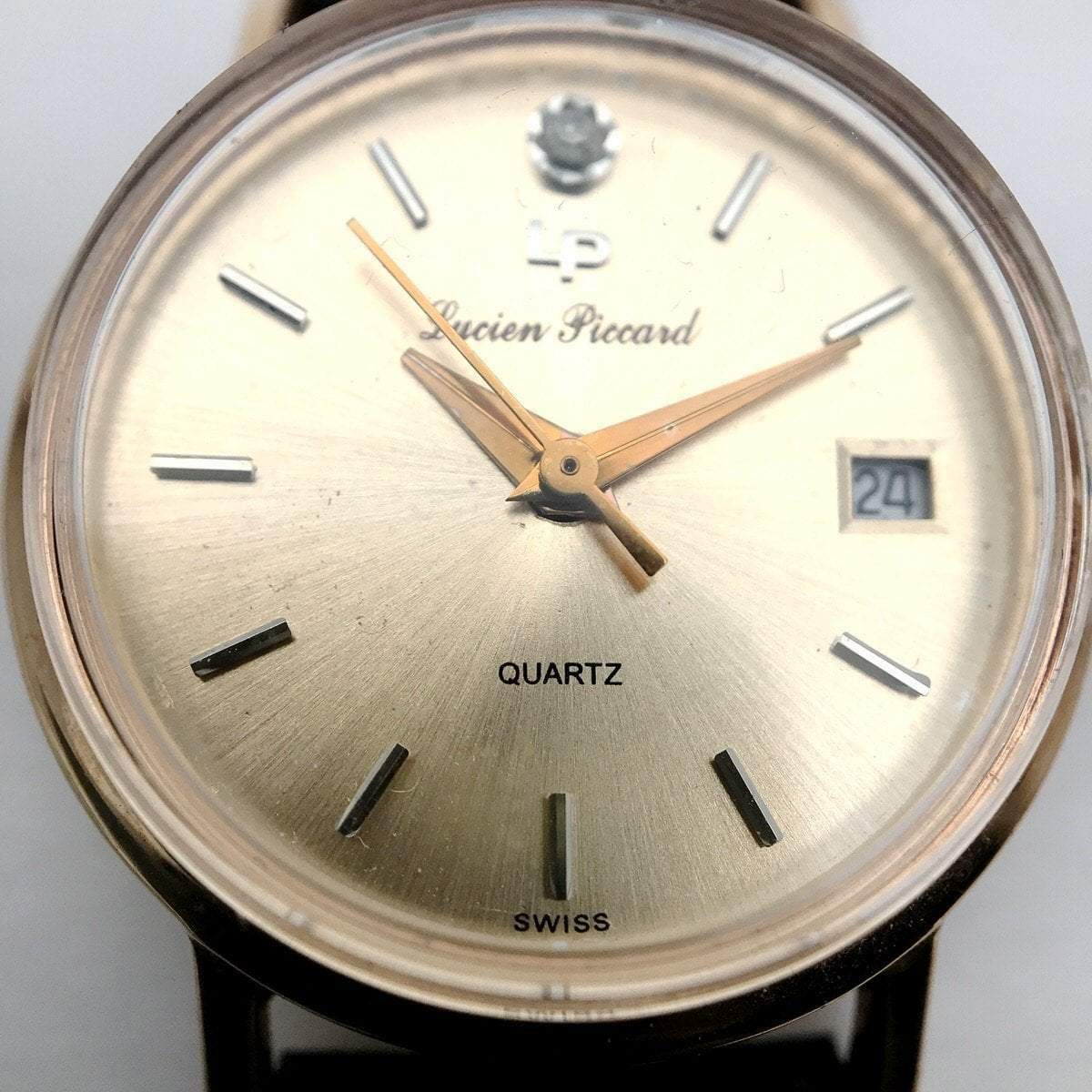 Beautiful, classic and minimalist solid 14k rose gold watch by Lucien Piccard. The dial is set with a diamond at 12 o’clock, date display at 3PM.