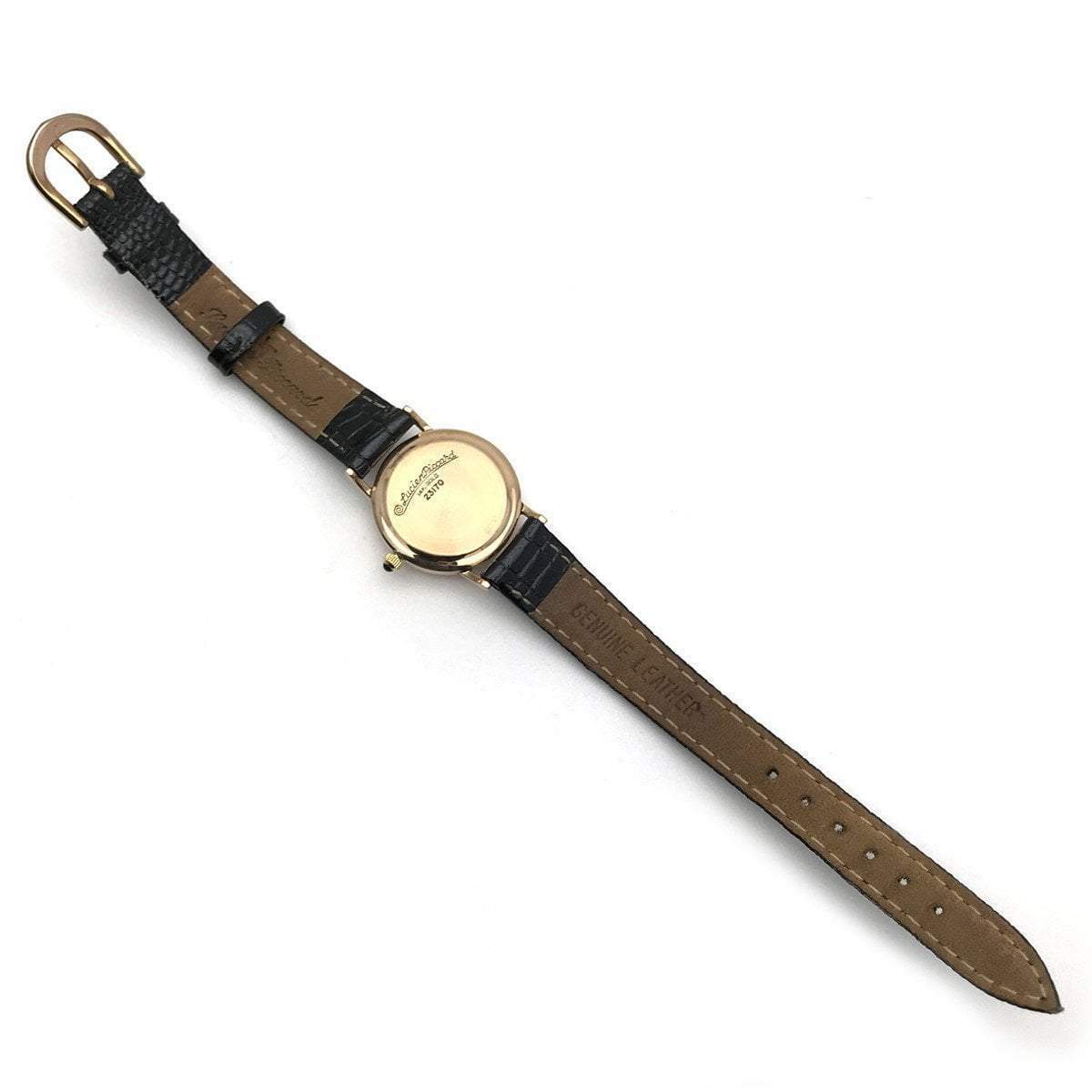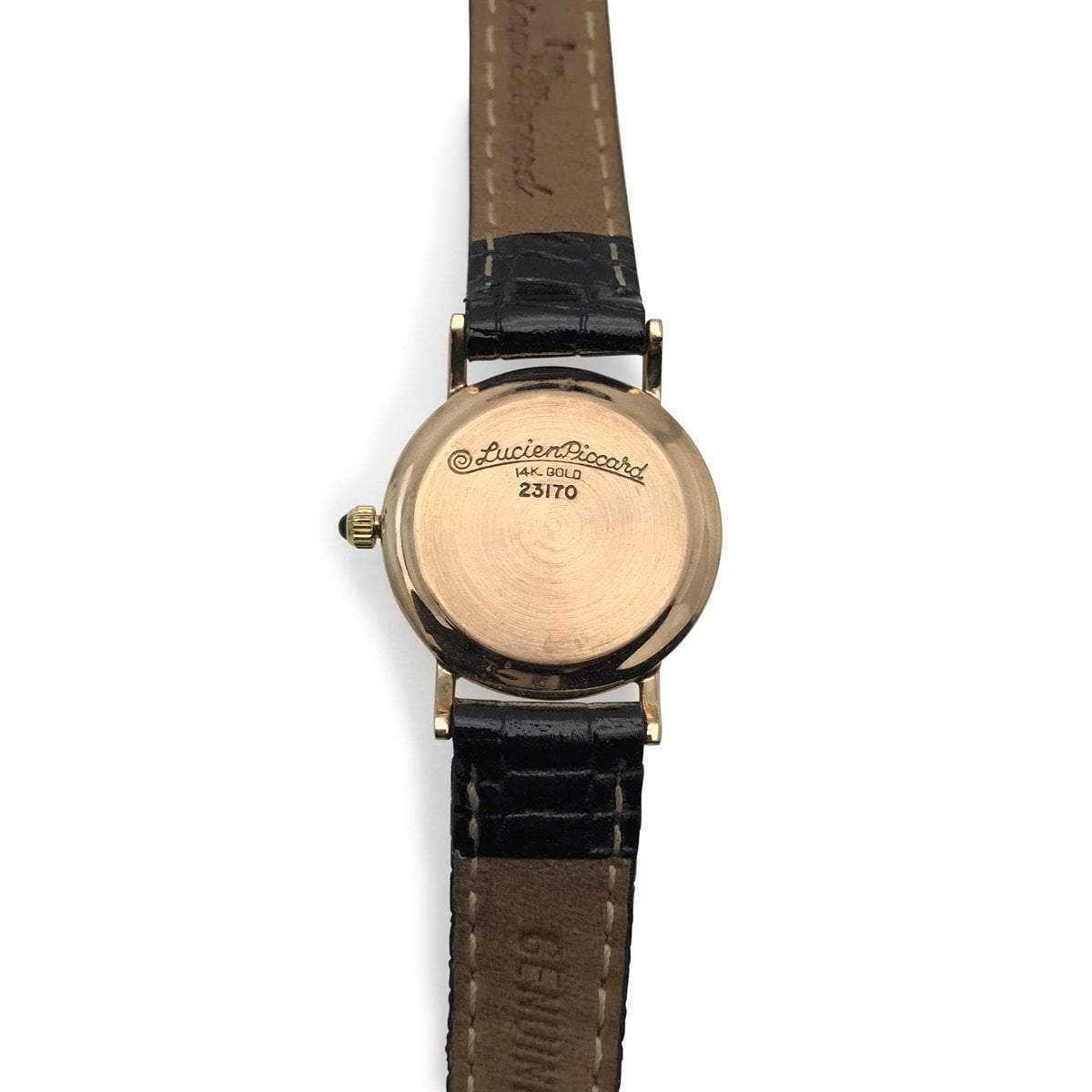 The crown is set with a black onyx cabochon. This watch runs well and keeps excellent time. Quartz movement, marked on the back of the case “Lucien Picard, 14k Gold, 23170.