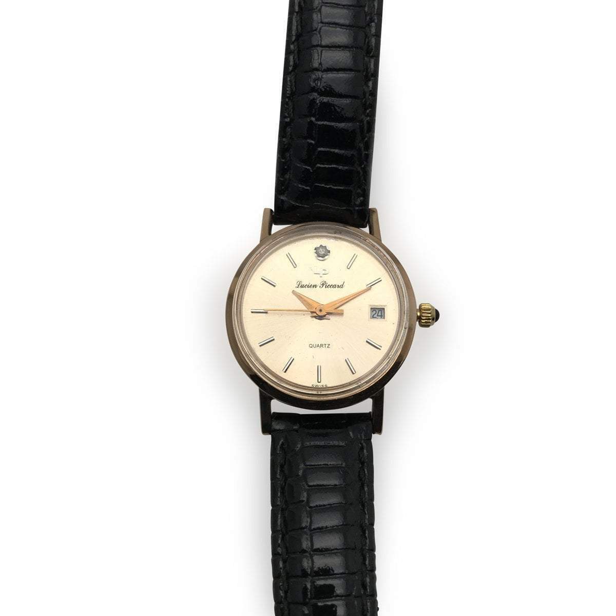 The case measures 15/16″ in diameter. The original lizard pattern patent leather band is also marked Lucien Piccard.