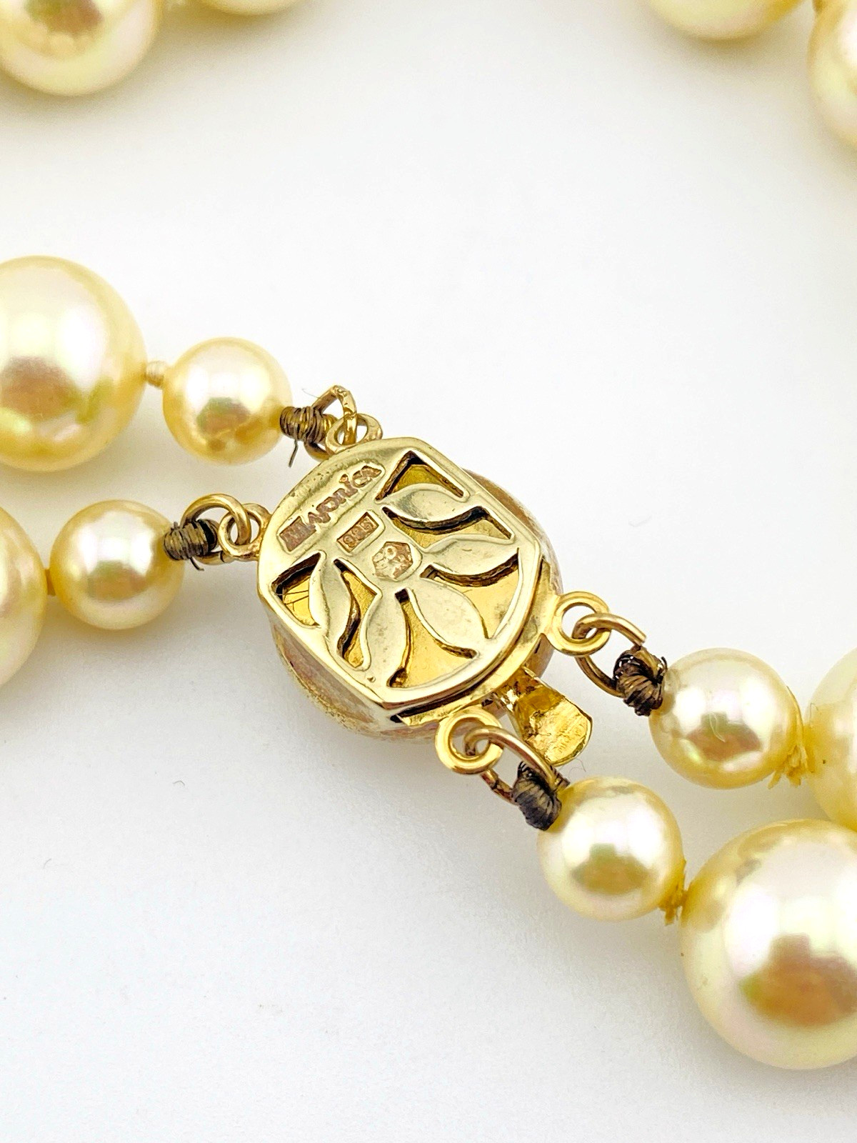 The necklace is finished with a custom designed signed box clasp in gold over sterling silver, set with a matching half pearl for a cohesive and sophisticated finish.