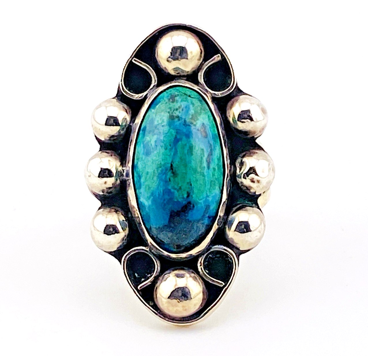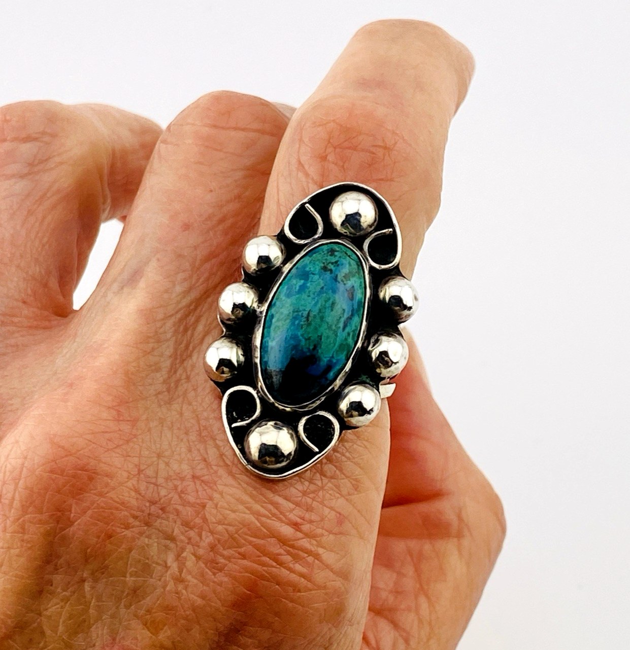 A beautifully expressive statement ring, this piece blends vintage craftsmanship with timeless Southwestern spirit. Its sculptural details and striking turquoise presence make it a standout addition to any curated jewelry collection.