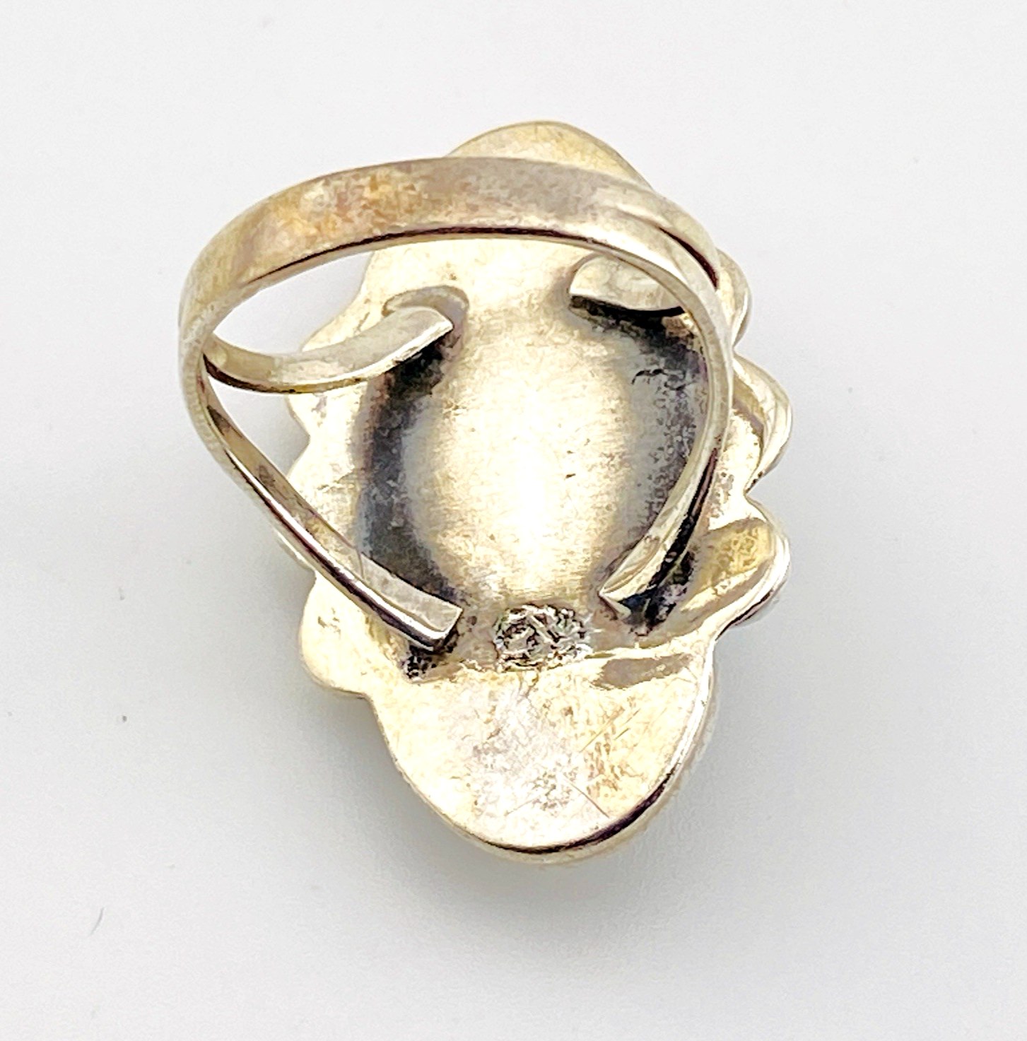 Stamped Mexico CSC with the Eagle assay mark, the ring is crafted in solid sterling silver (tested), even though the numeric 925 is no longer visible. The workmanship is superb: the piece is well-built, visually striking, and carries the unmistakable artistry of vintage Mexican silversmithing.