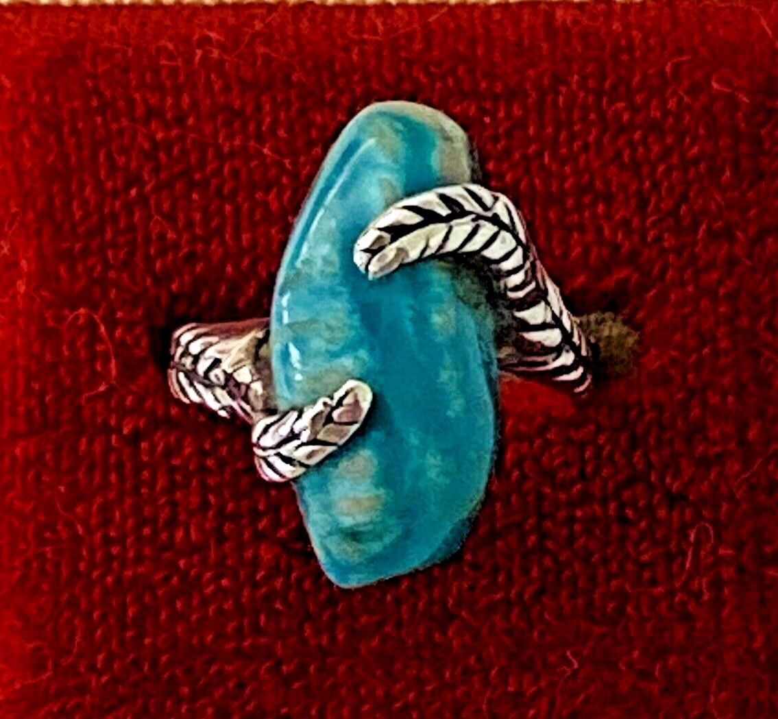The setting is quite unusual. An amazonite pebble embraced by two engraved fern leaves. The amazonite pebble sits somewhat high above the hand. It reaches 1/2 inch or about 12mm above the hand.