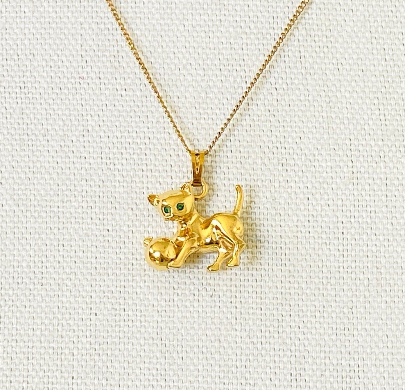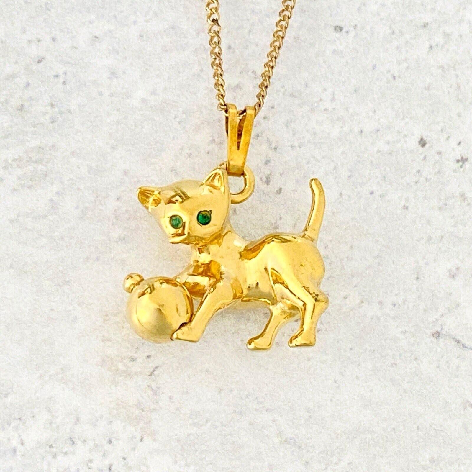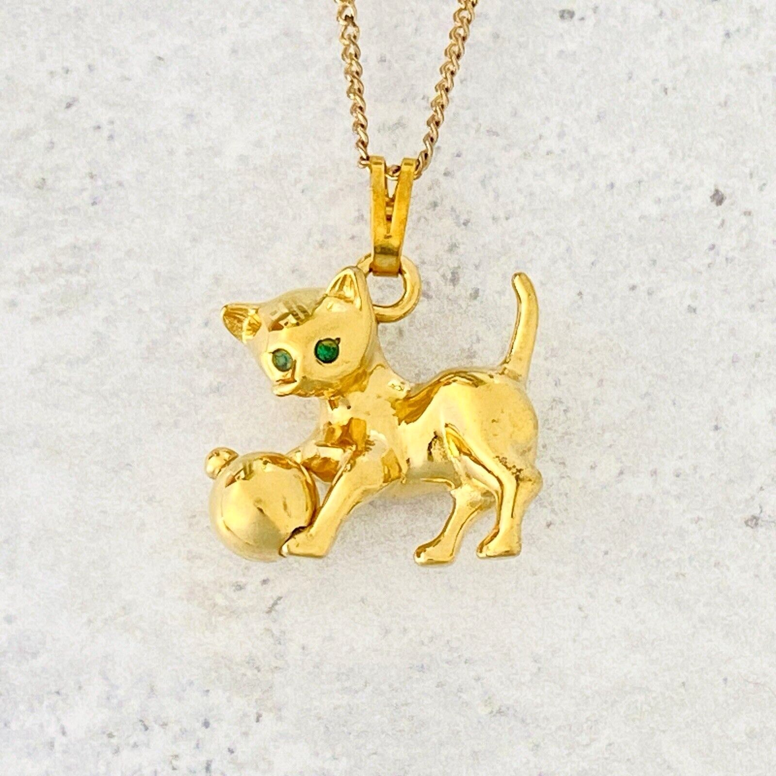 This cute kitty has a ball that actually spins and green rhinestone eyes.