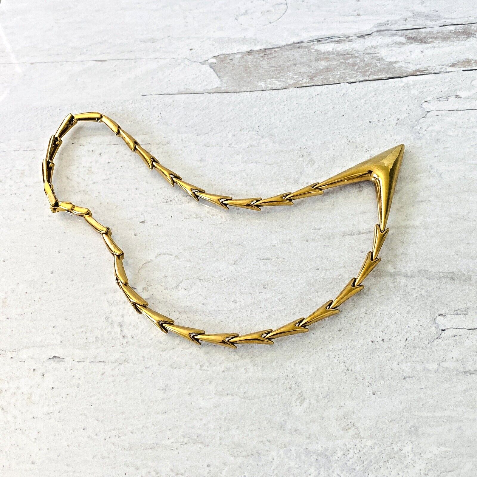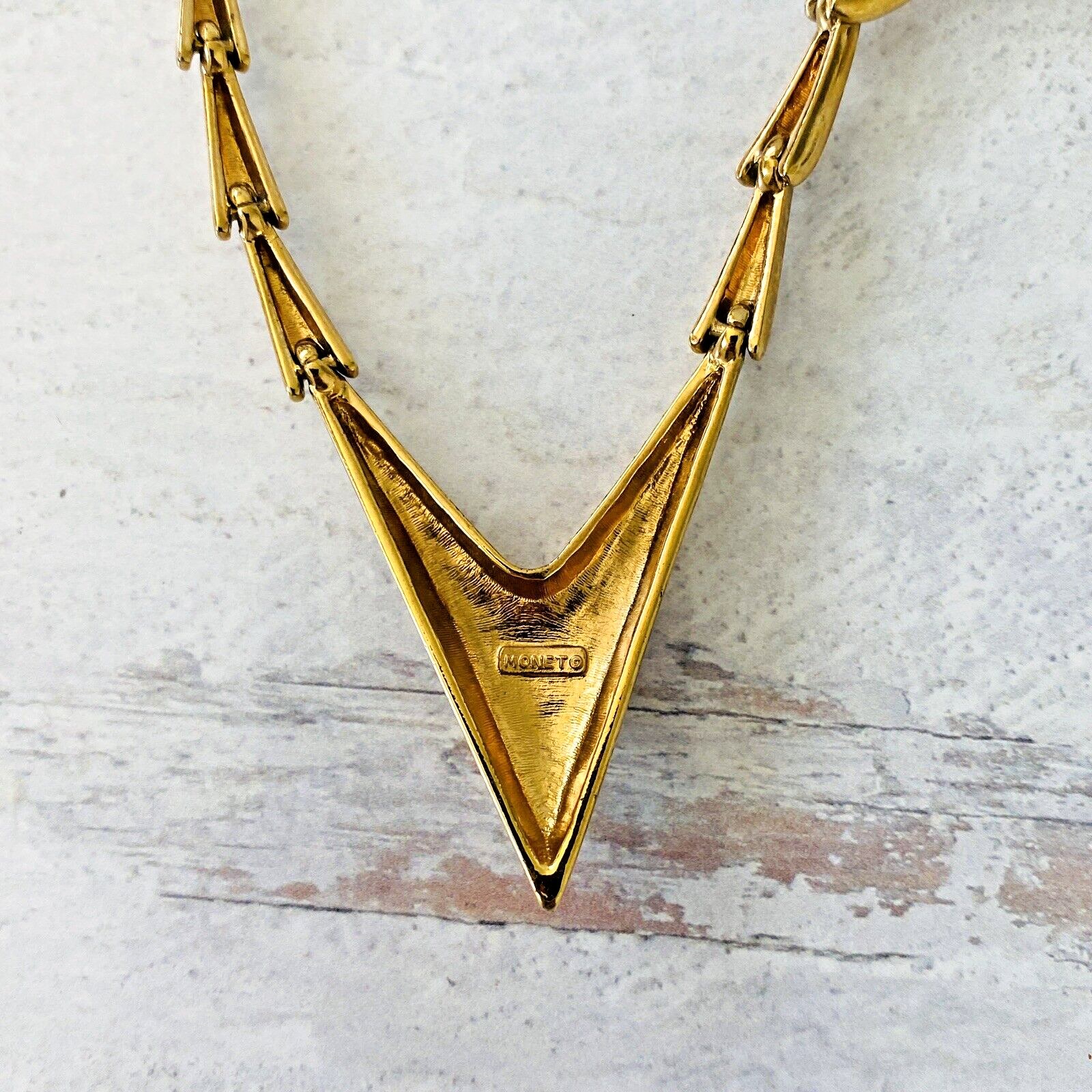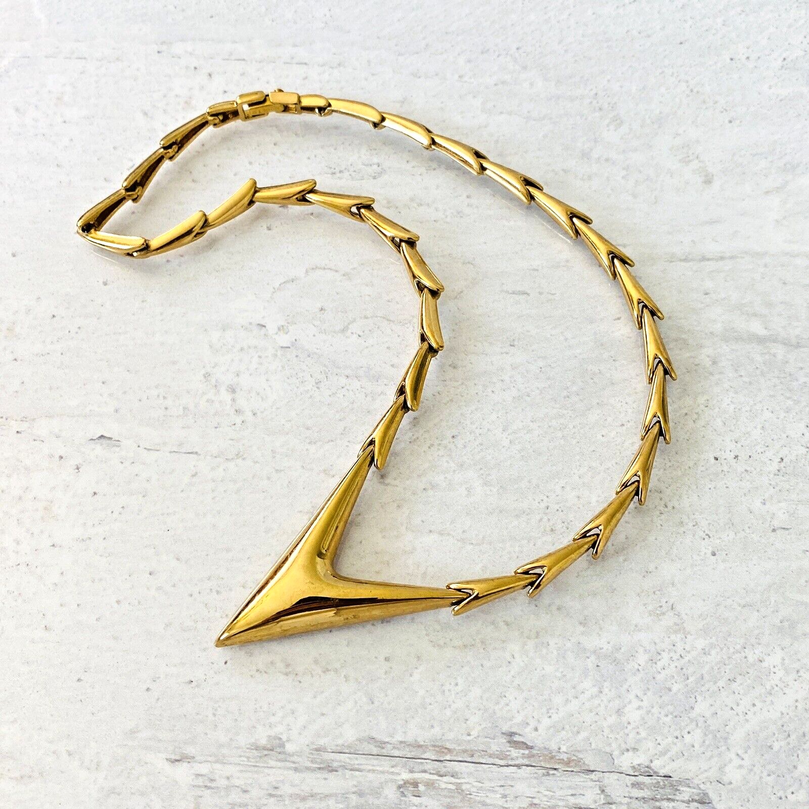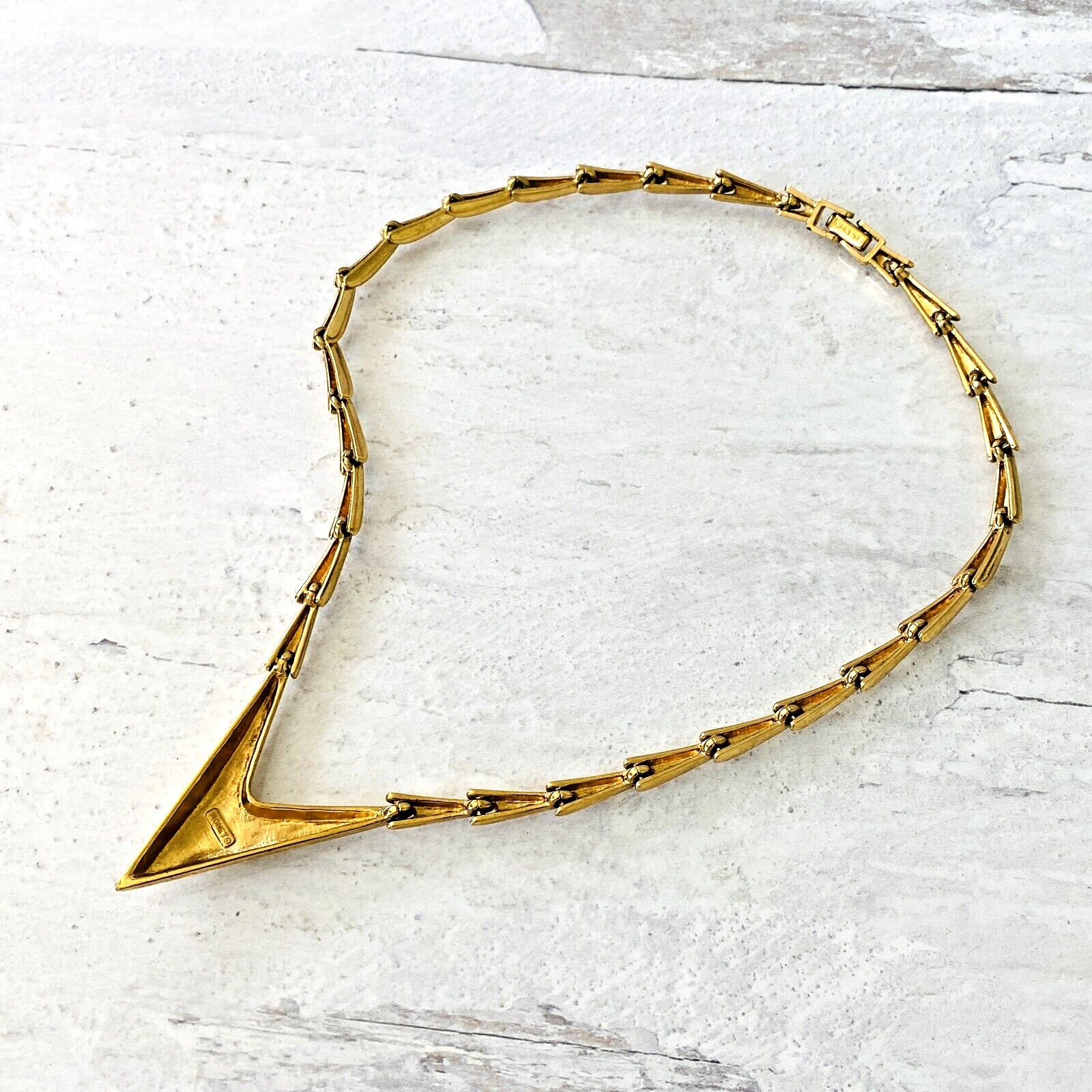 A gorgeous Modernist necklace with arrow or V-shaped links, including the centerpiece pendant. The condition is excellent.