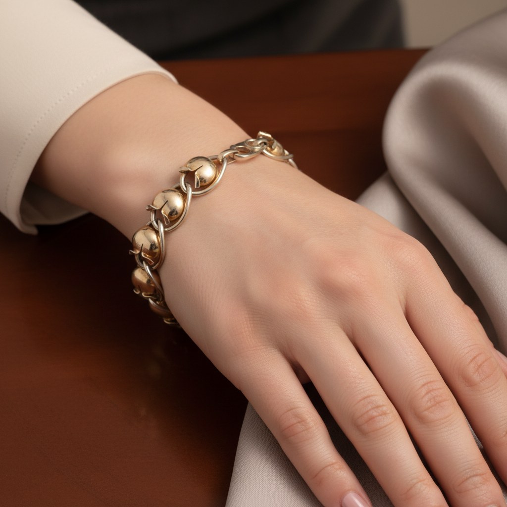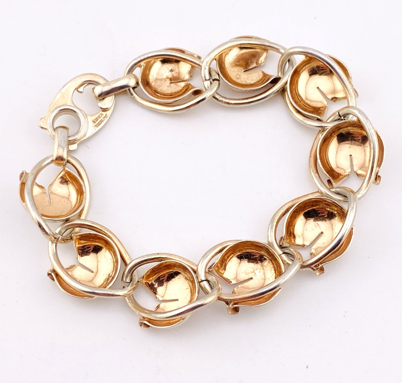 The gold-over-silver finish has softened beautifully over time, giving the bracelet a gentle, lived-in glow that only decades can create. The tulip caps show that lovely vintage bloom—light patina, subtle texture—adding depth without diminishing the bracelet’s radiance. Even in its age, the vermeil remains remarkably intact, and the dimensional contours of each link reflect light with a soft, golden luster.