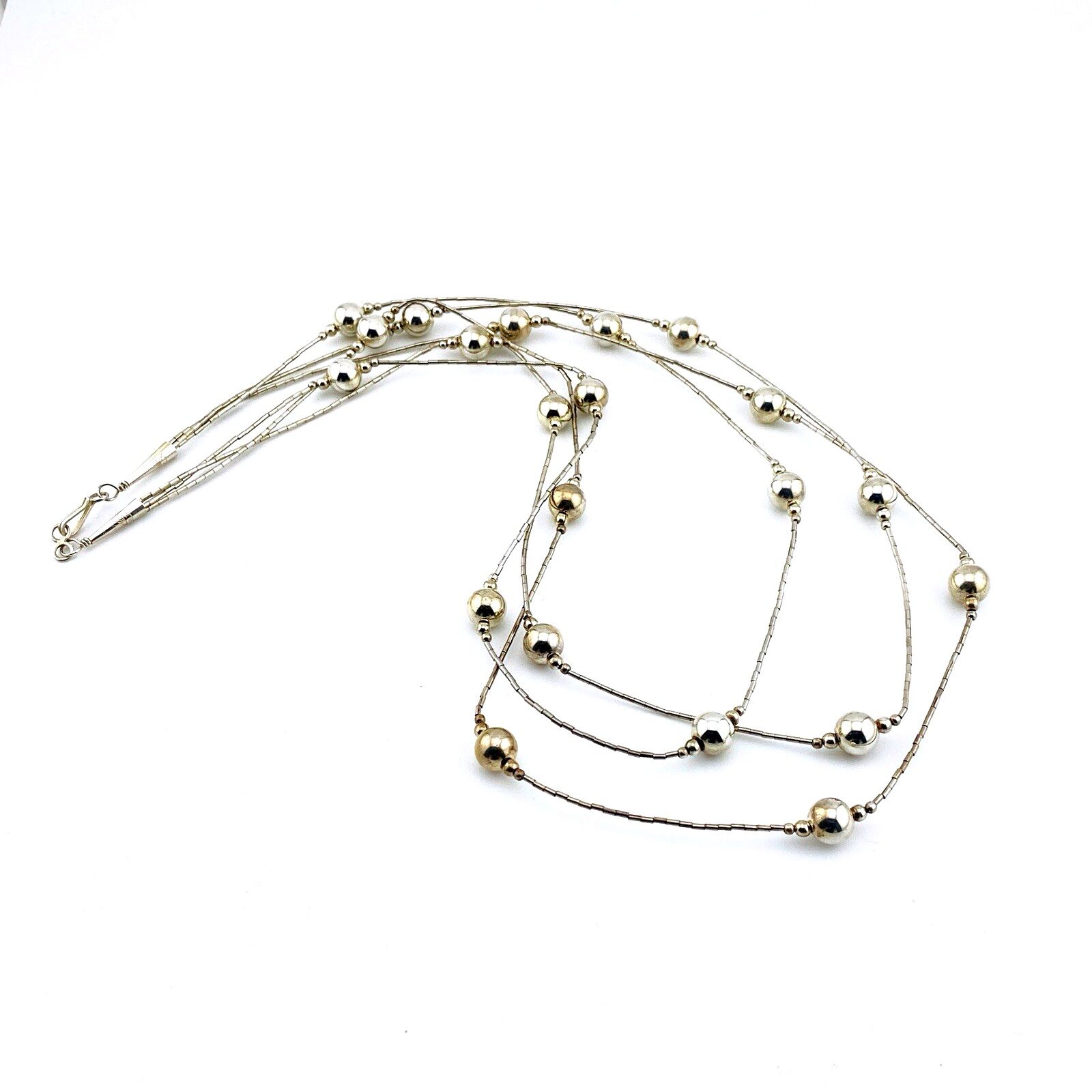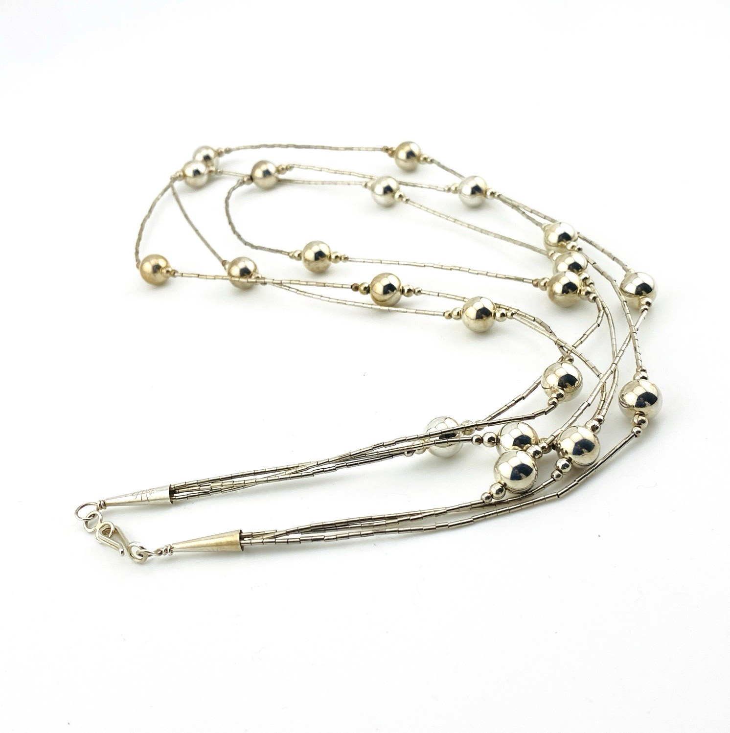 The design features 1mm liquid silver beads, sleek and flexible, paired with larger 8mm round sterling beads that add depth and structure. Together, they create a refined, luminous look—both modern and deeply connected to Southwestern jewelry traditions. The strands join at a sterling hook clasp for easy wear and secure closure.