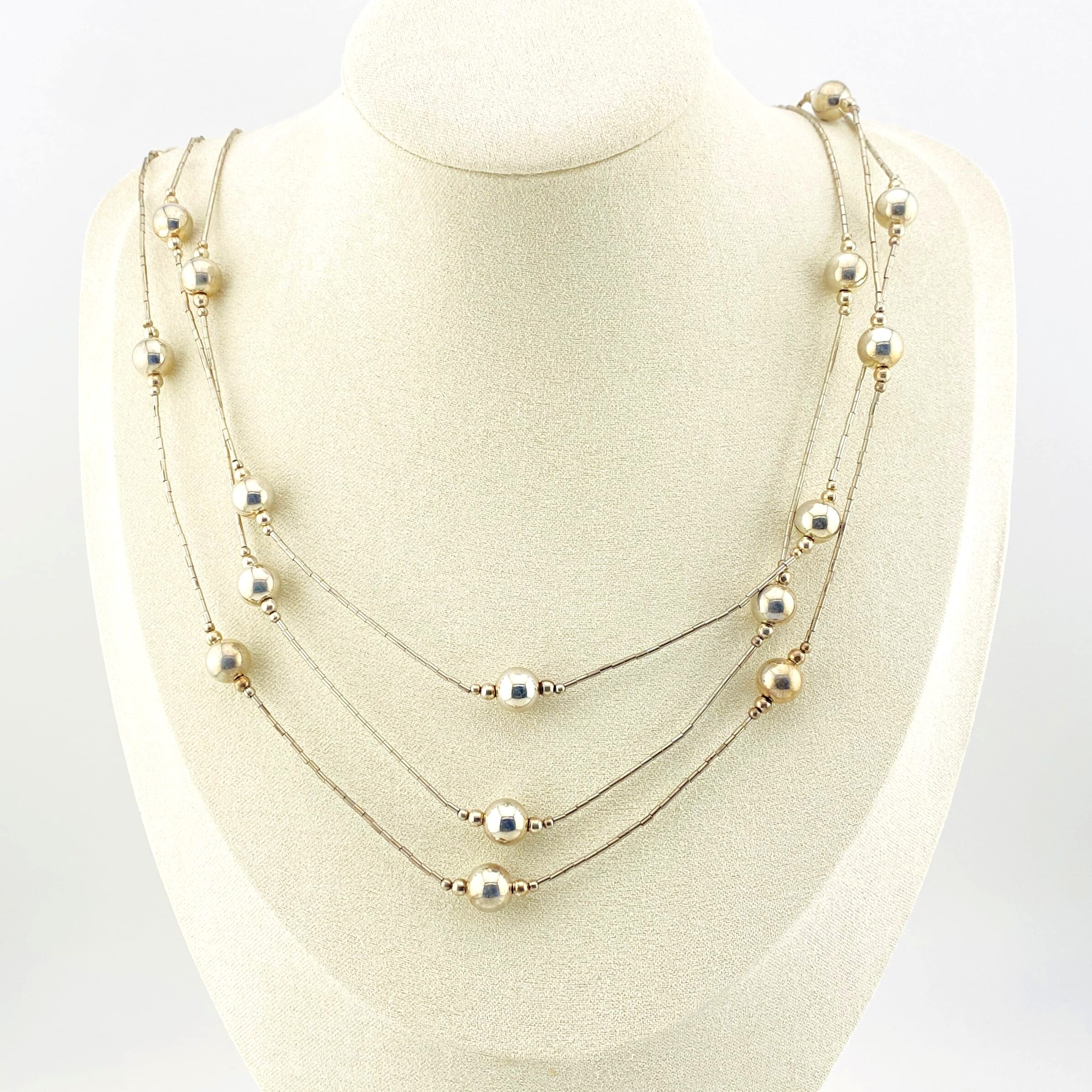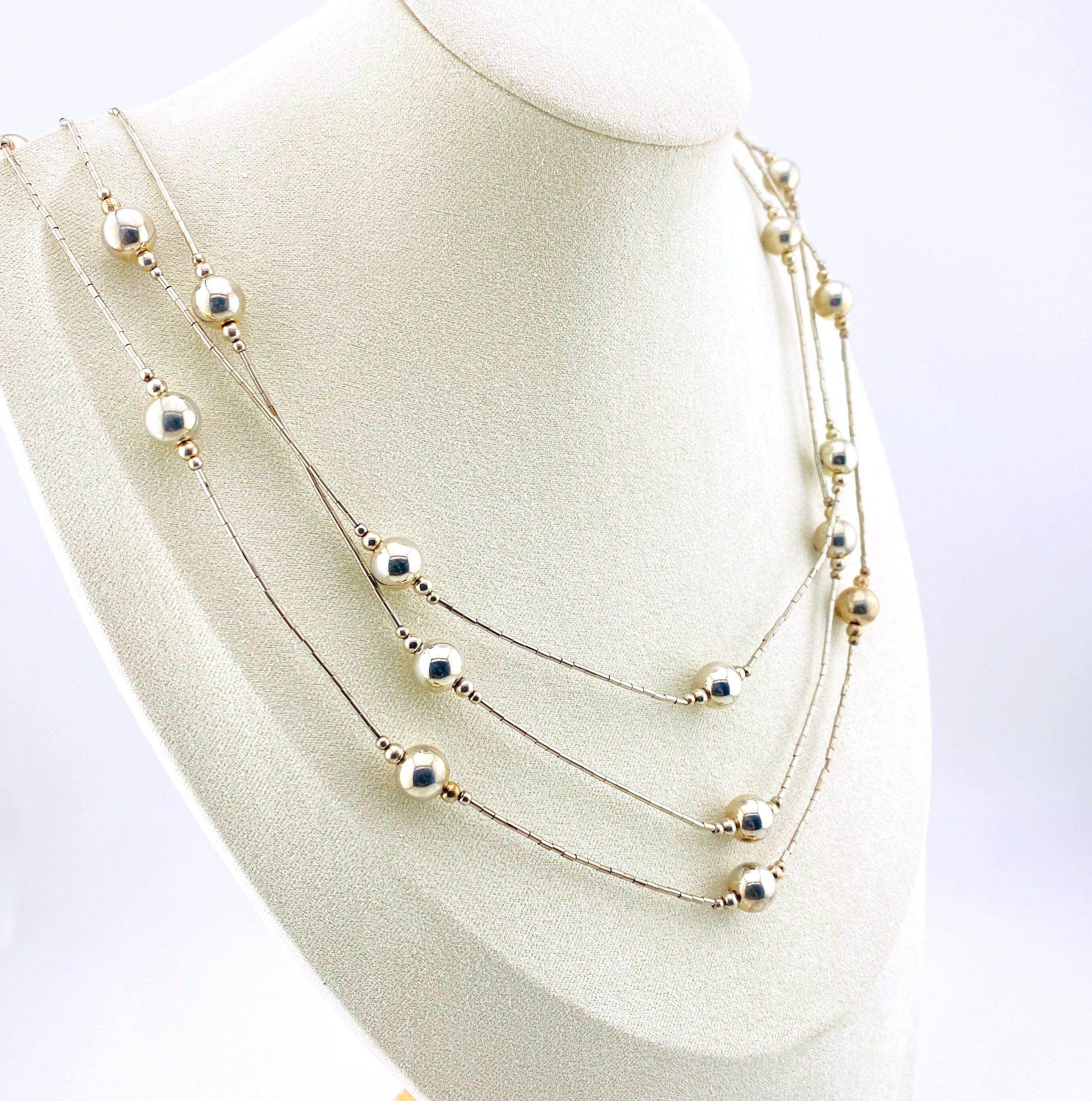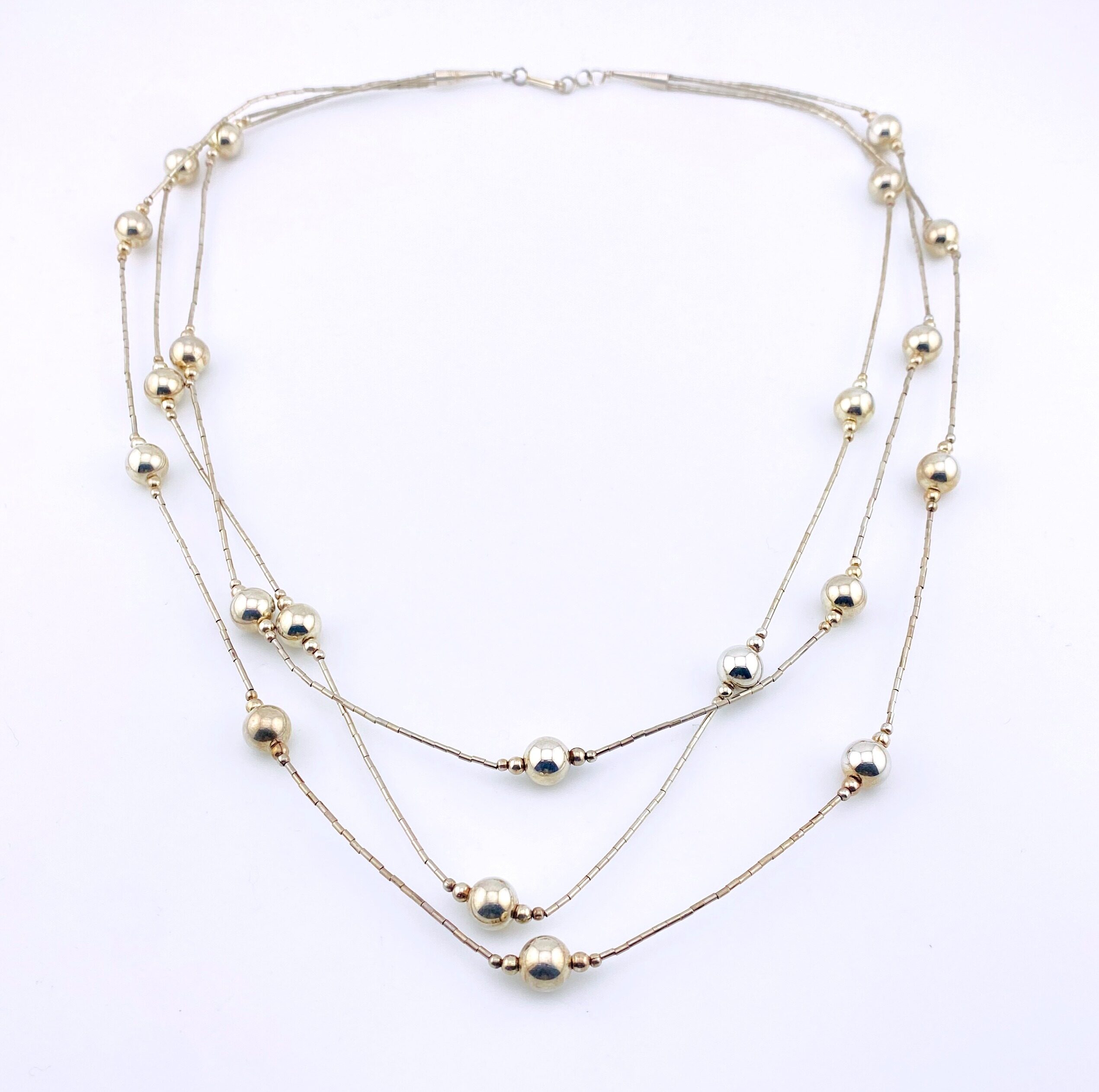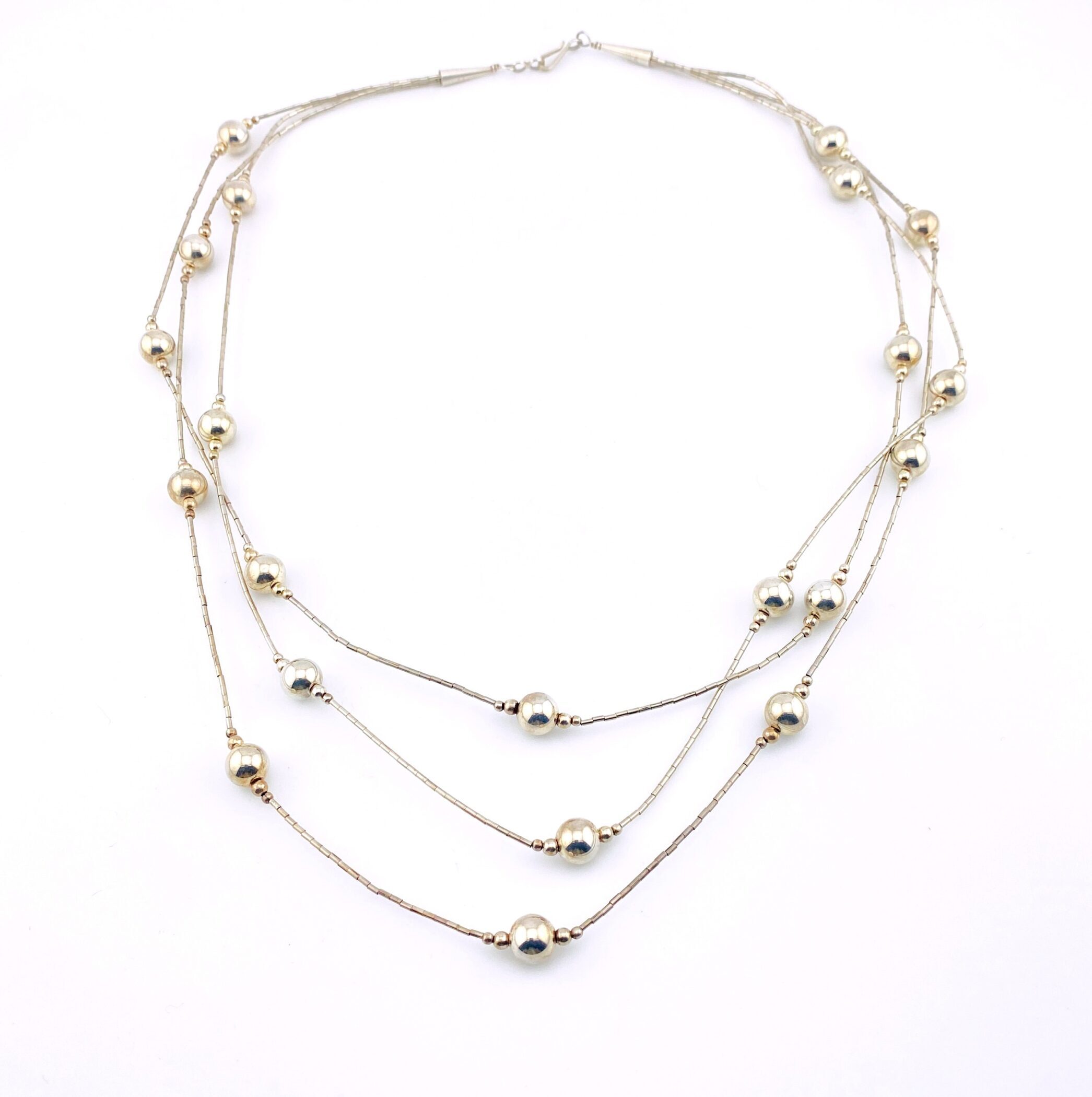 This stunning three-strand sterling silver necklace blends the shimmer of traditional liquid silver with the dimensional beauty of Navajo pearl–style beads. With strands graduating from 20 to 22 inches, the necklace drapes gracefully along the neckline, creating a soft, fluid movement that catches the light with every step.